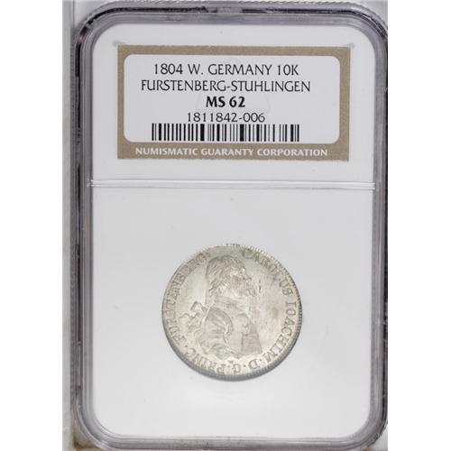 <B>Furstenberg-Stuhlingen. Karl Joachim 10 Kreuzer 1804-W, </B></I>KM38, MS62 NGC, light original silver-gray toning, very scarce type.