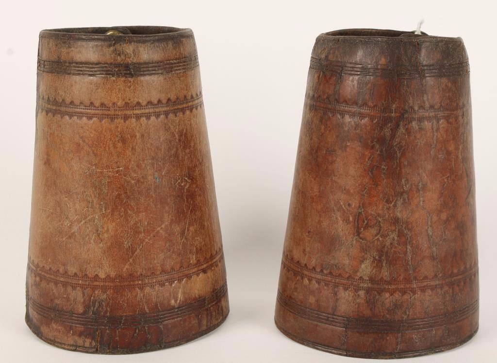 Brown leather with line work, shows heavy wear and use, brass snaps.
