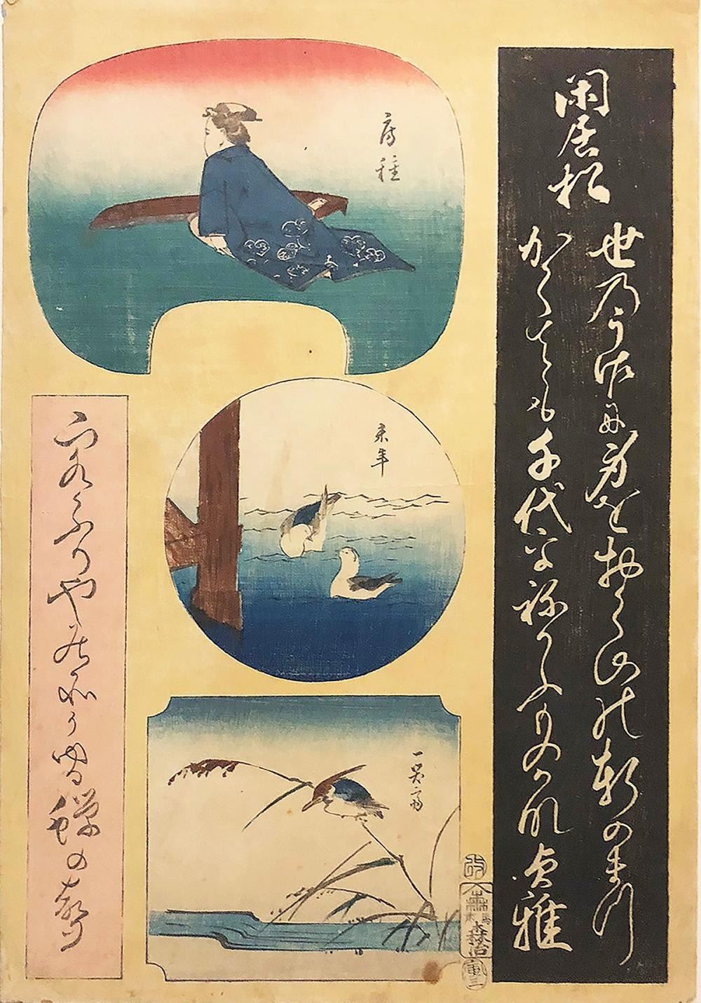 Fusatane- "Three Views" Japanese Woodblock Print, Fine Condition, Small stained lower center, Oban Tate-e, 14.5 x 10