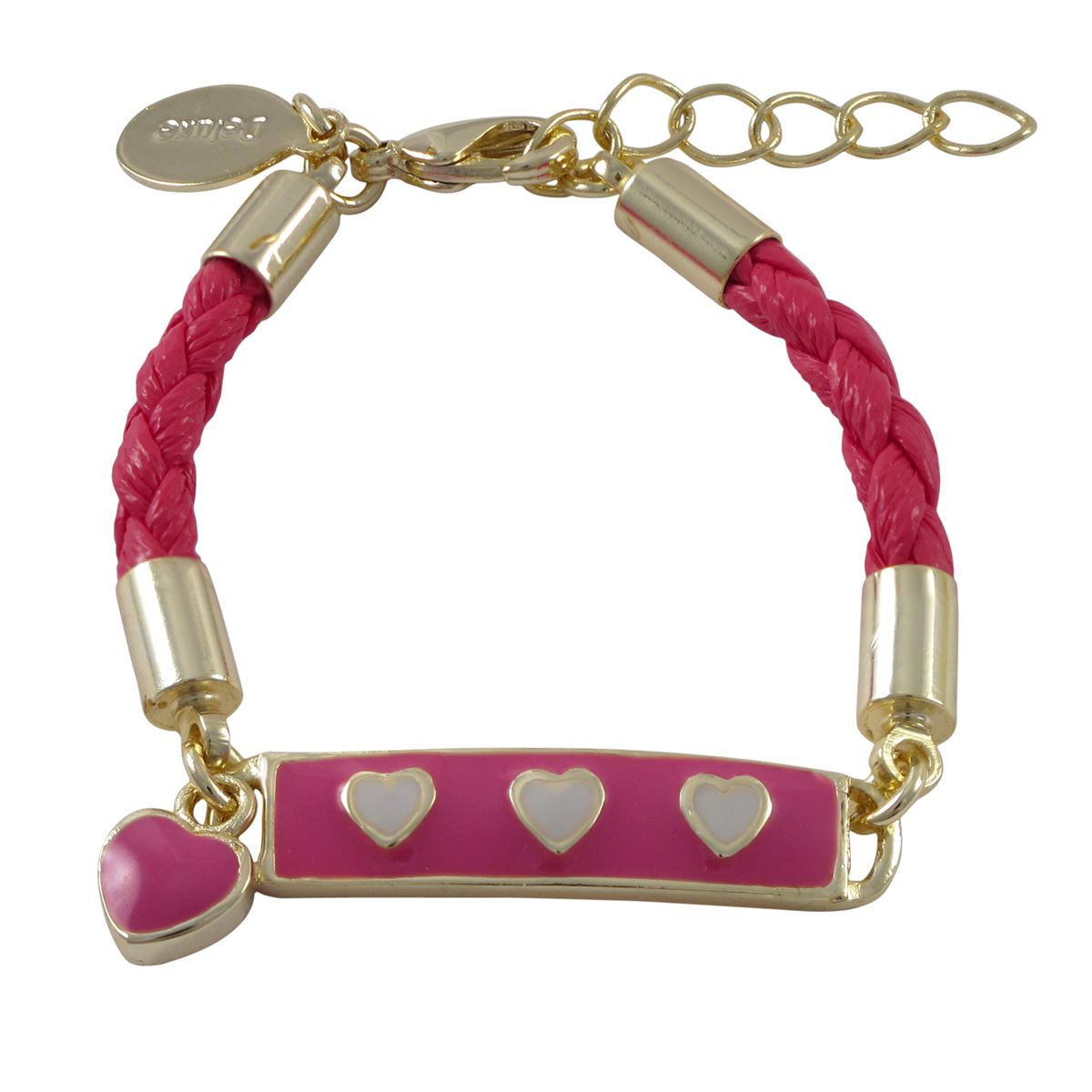 Fuschia Enamel Bar With White Hearts, Fuschia Cord Gold Plated Brass Bracelet, 4&Quot; 1&Quot;