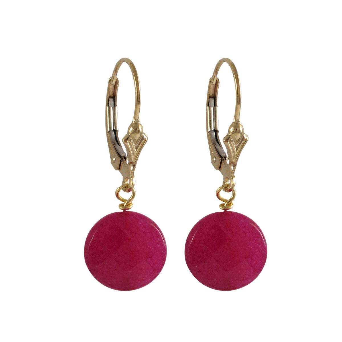 Fuschia Semi Precious 10Mm Round Flat Stone On Gold Filled Lever Back Earrings, 1.18"