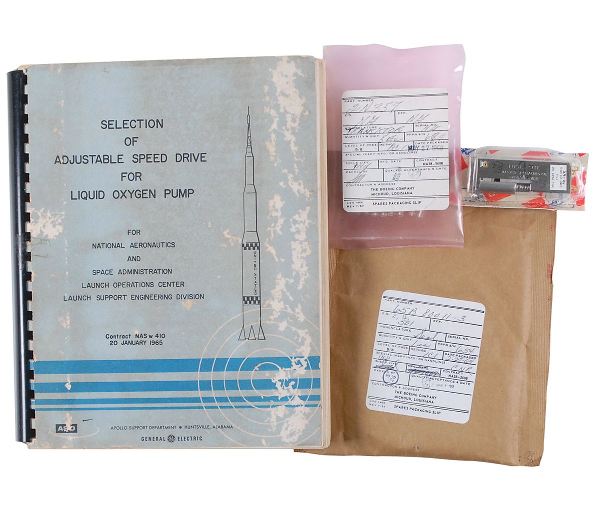 Two items: a fuse light switch, used by ground support associated with the Saturn V First Stage, still housed in its original packaging and with its brown paper sleeve with its Boeing packaging slip affixed to one side and accompanied by a still-sealed package of five transistors, with its Boeing label; and a spiral-bound manual entitled “Selection of Adjustable Speed Drive for Liquid Oxygen Pump,” issued by General Electric as part of the Apollo Support Department, dated January 20, 1965. Some dampstaining and scattered surface loss to manual’s cover, otherwise fine condition.