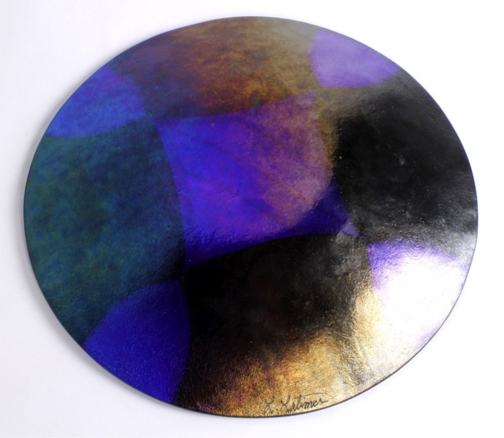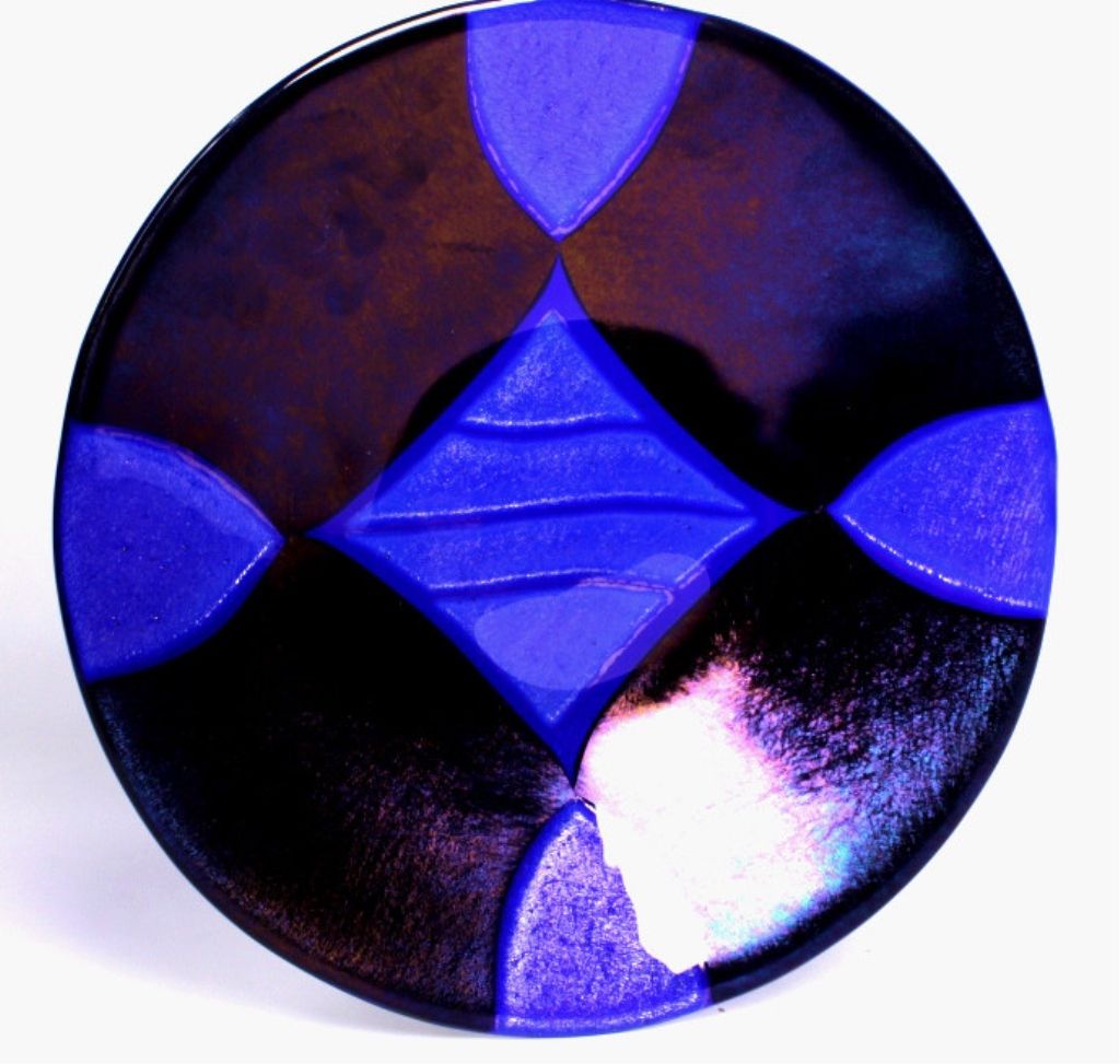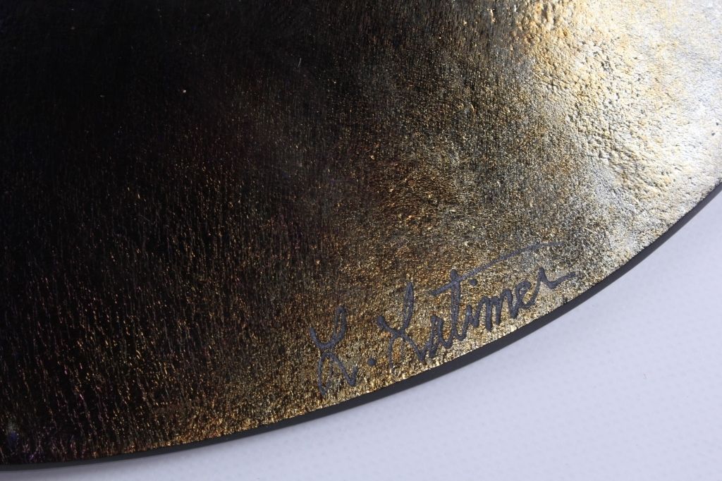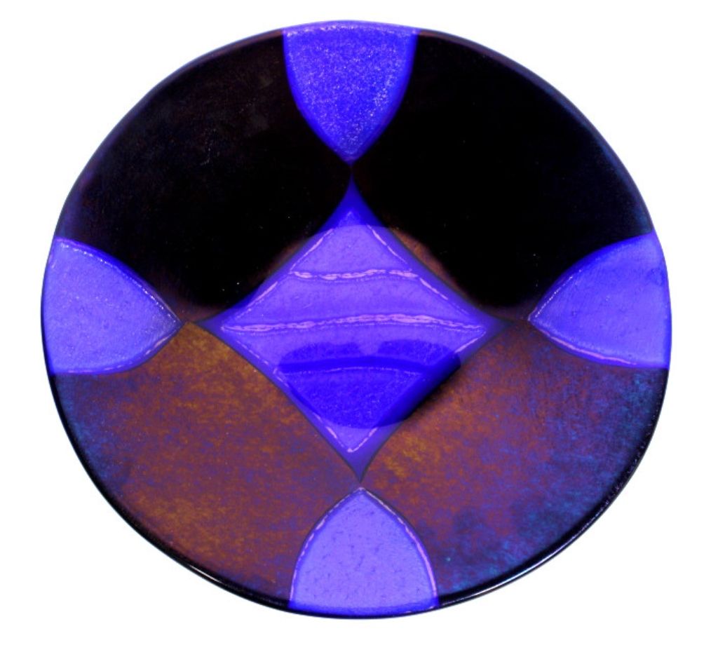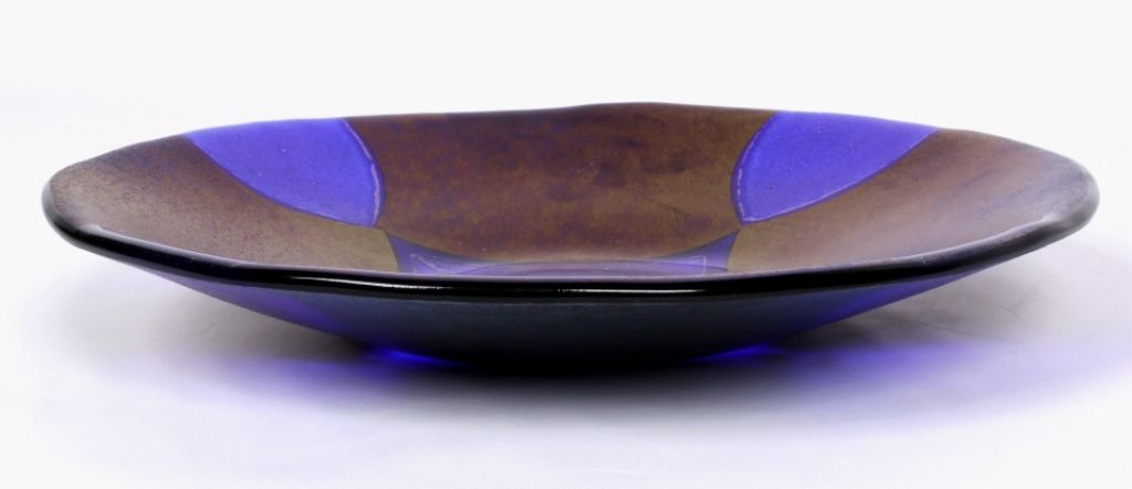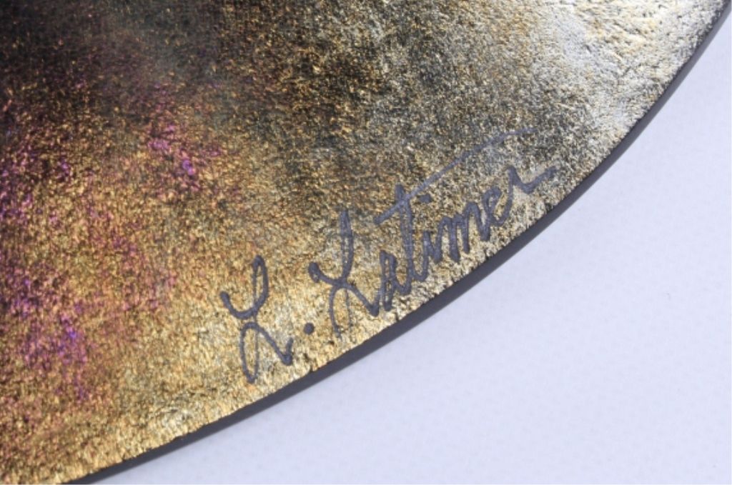 This is a iridescent fused art glass that has artist inserts. This piece is hand blown and made by Latimer. Has a wonderful color with a spectrum of colors. The piece is in great condition. The original artwork measures 1.275" tall and 10.125" diameter.