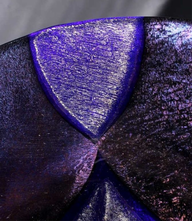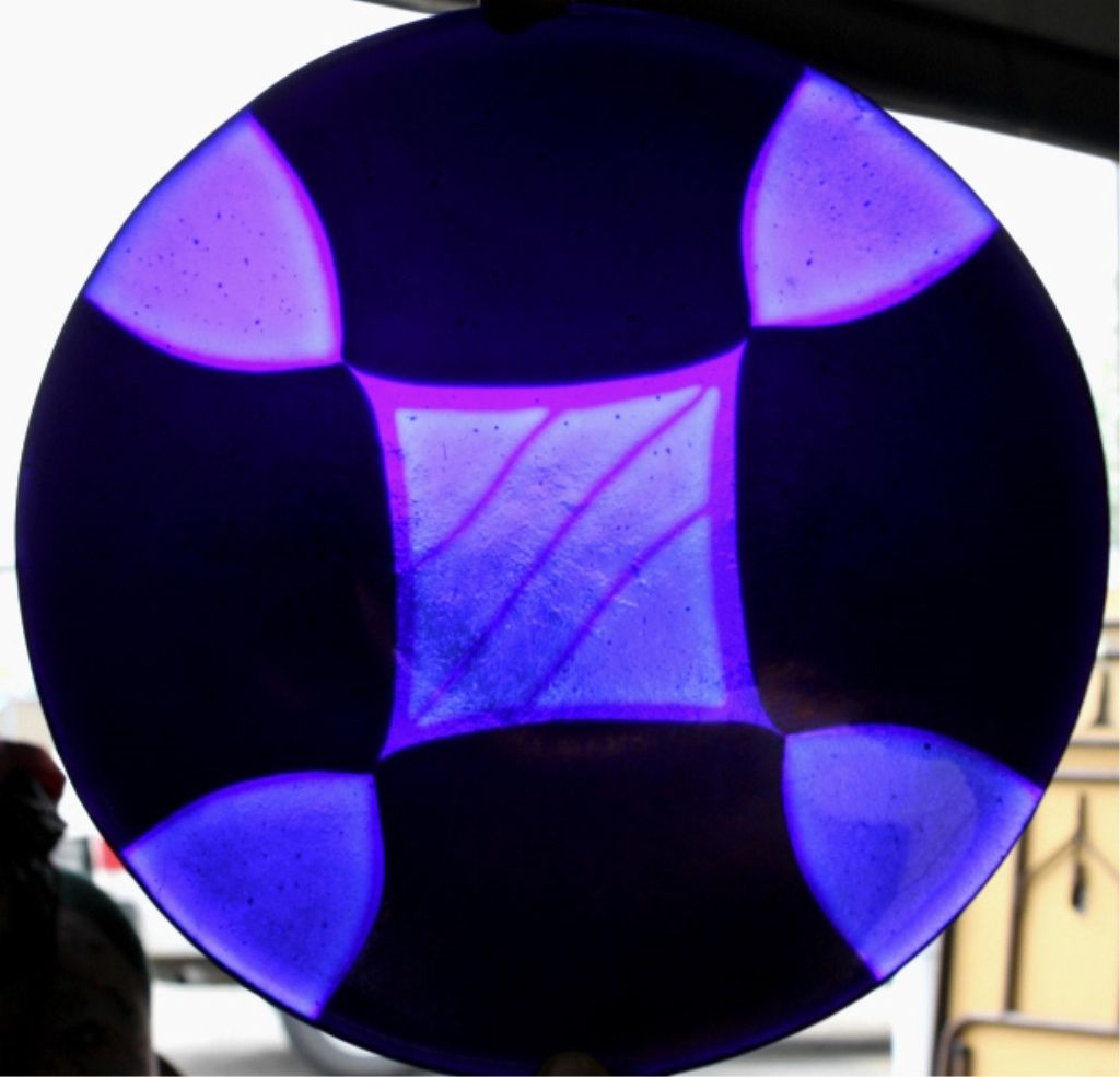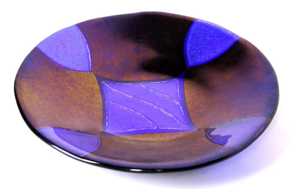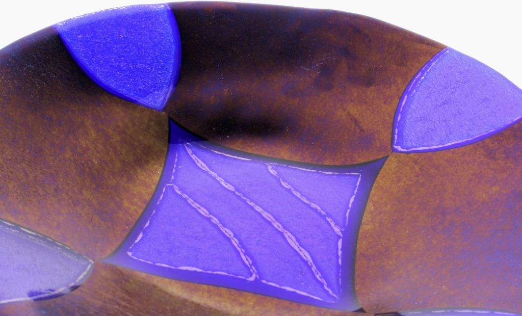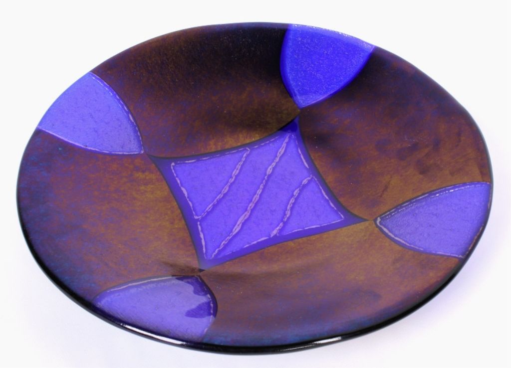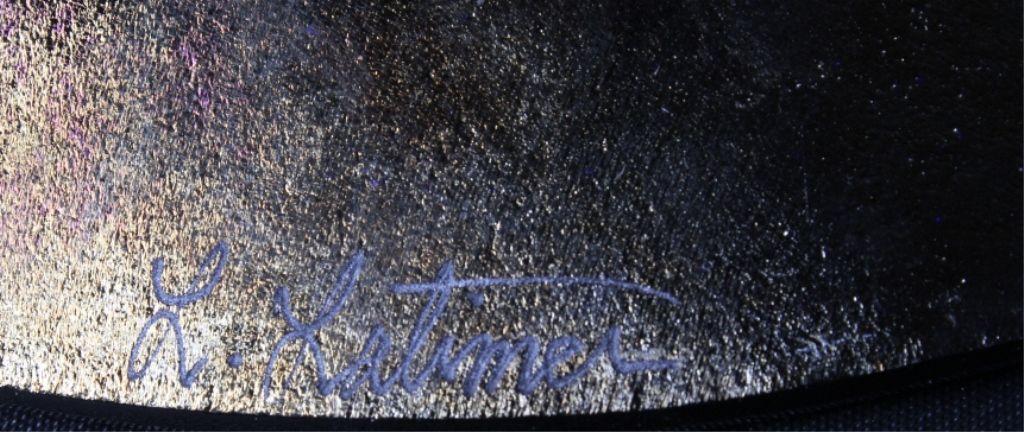 This is a iridescent fused art glass that has artist inserts. This piece is hand blown and made by Latimer. Has a wonderful color with a spectrum of colors. The piece is in great condition. The original artwork measures 1.275" tall and 10.125" diameter.