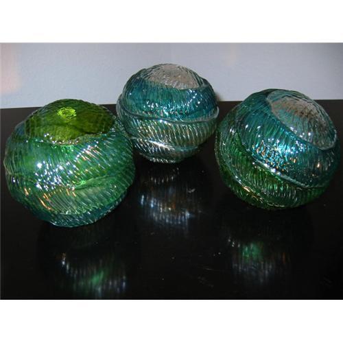 These Stunning Fusion Shimmer balls are in green, silver colors with irrediscent accents. They are stain glasses, hand made in Czech Republic and are marked with gold Label. They are in excellent condition and never been used. Would make magnificent designer accents. they are 6 inch and would make amazing table top paperweight accessories.