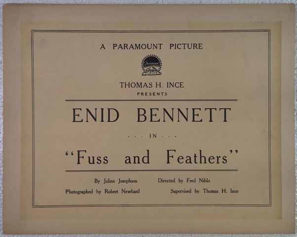 Fuss and Feathers (Thomas H. Ince Corporation. Producer: Thomas H. Ince. Distributed by Famous Players-Lasky Corporation, 1918) lobby card. Drama, Comedy, Romance. Starring Enid Bennett, Douglas MacLean, J.P. Lockney, Charles K. French, Sylvia Ashton, Robert McKim, Lucille Young. Directed by Fred Niblo. Some edge wear, light creases, some tears, tape. Very Fine. (11"x14").
