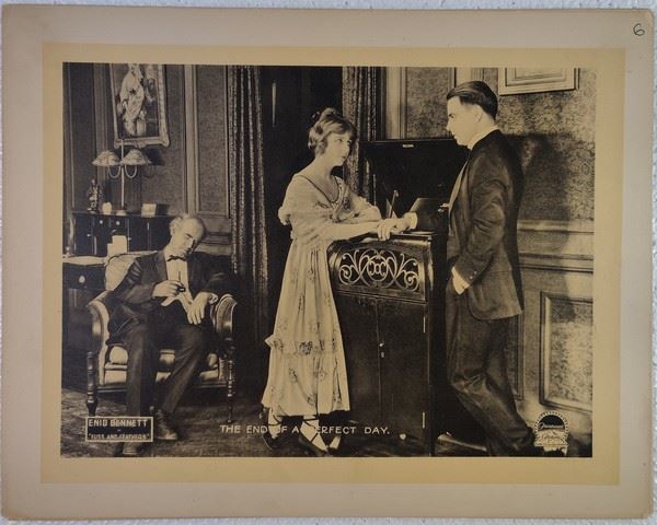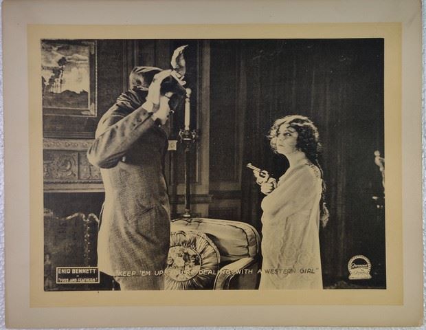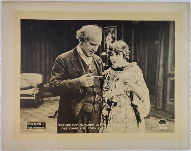 Fuss and Feathers (Thomas H. Ince Corporation. Producer: Thomas H. Ince. Distributed by Famous Players-Lasky Corporation, 1918) lobby card. Drama, Comedy, Romance. Starring Enid Bennett, Douglas MacLean, J.P. Lockney, Charles K. French, Sylvia Ashton, Robert McKim, Lucille Young. Directed by Fred Niblo. Some edge wear, light creases, some tears, tape. Very Fine. (11"x14").