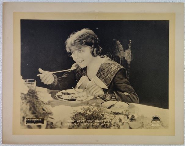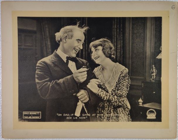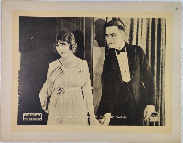 Fuss and Feathers (Thomas H. Ince Corporation. Producer: Thomas H. Ince. Distributed by Famous Players-Lasky Corporation, 1918) lobby card. Drama, Comedy, Romance. Starring Enid Bennett, Douglas MacLean, J.P. Lockney, Charles K. French, Sylvia Ashton, Robert McKim, Lucille Young. Directed by Fred Niblo. Some edge wear, light creases, some tears, tape. Very Fine. (11"x14").