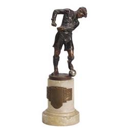 Football player Pained bronze on alabaster base. Marked: C. Brehmer. Trademark of Bergman from Wien. Around:1910 Alabaster is injured. 22 cm