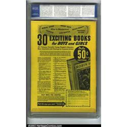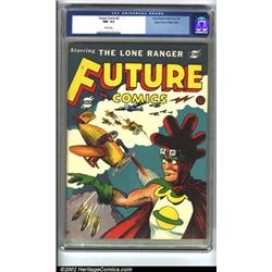 Future Comics #2 Mile High pedigree (David McKay Publications, 1940) CGC NM- 9.2 White pages. A totally bizarre comic, even by 1940s standards, this cover has to be seen to be believed. Do they really have chickens on Saturn? This guy must think so. David McCay, a strip publisher, decided to step off the beaten path for this series, which only ran for four issues before the company decided to return to more traditional fare. Overstreet 2002 NM 9.4 value = $1,350. Important notice: We expect to be auctioning lots at the rate of 200-250 per hour. Sometimes eBay Premier live bid software cannot keep up with that pace, so we strongly recommend that you place a realistic proxy bid now as insurance to avoid disappointment. Also please note that all Heritage/CAA lots purchased through eBay Premier carry a 20% Buyer's Premium.