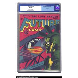 Future Comics #4 (David McKay Publications, 1940) CGC VF+ 8.5 Off-white to white pages. Like the other issues in Future Comic's short run, this one is a Gerber "6," with only 50-200 copies estimated to exist. No other copies have been graded higher by CGC. Overstreet 2002 VF 8.0 value = $625. Important notice: We expect to be auctioning lots at the rate of 200-250 per hour. Sometimes eBay Premier live bid software cannot keep up with that pace, so we strongly recommend that you place a realistic proxy bid now as insurance to avoid disappointment. Also please note that all Heritage/CAA lots purchased through eBay Premier carry a 20% Buyer's Premium. Please make sure you read the Terms and Conditions.