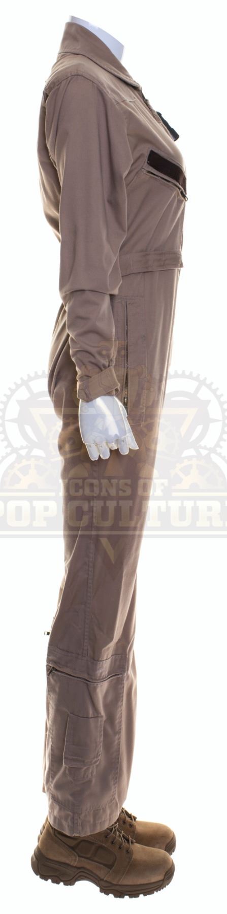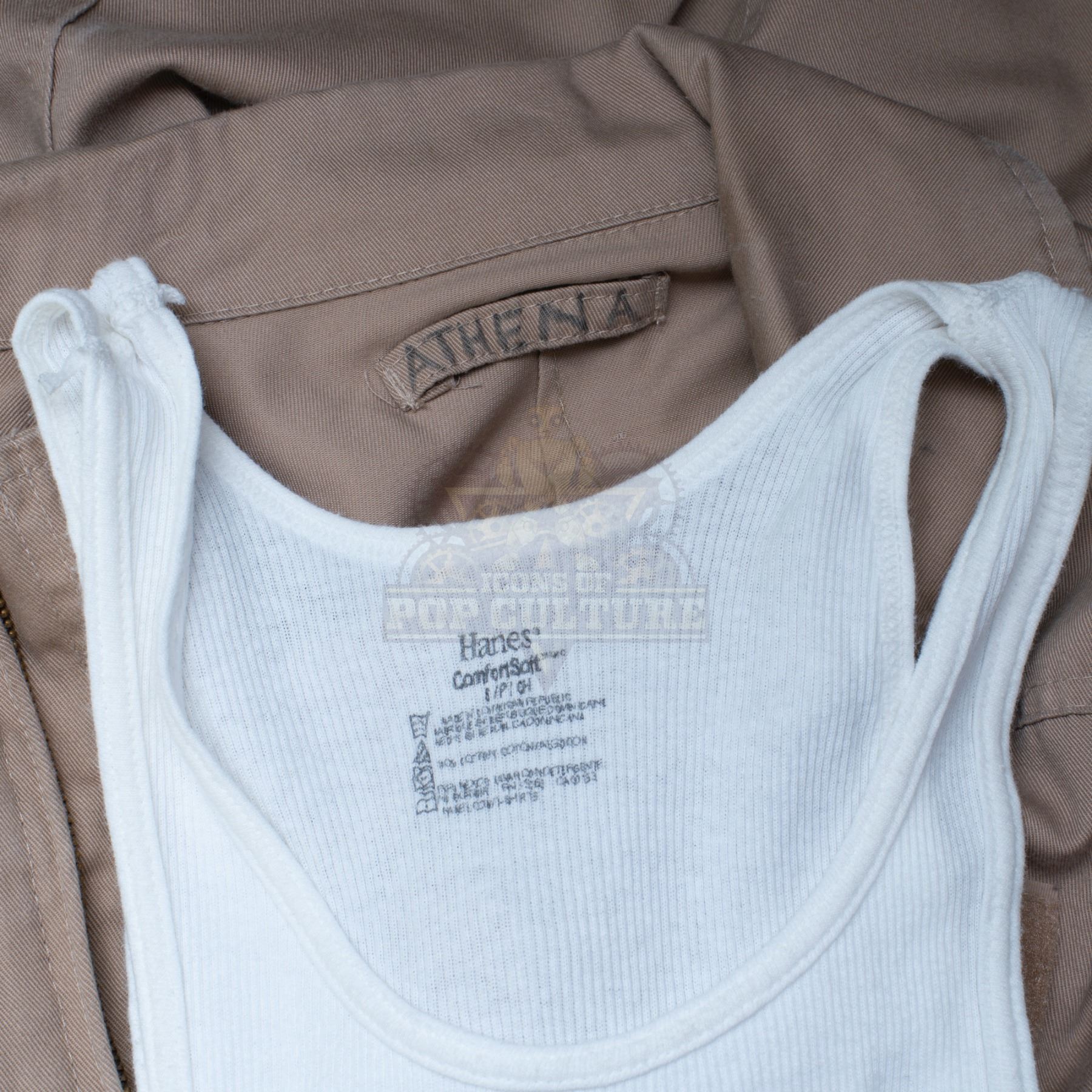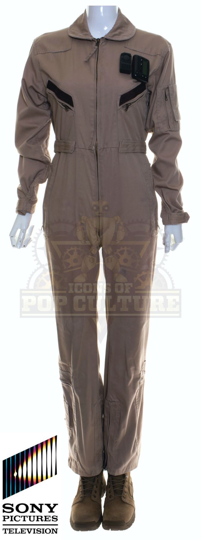 This outfit was acquired by the production for use by Katherine LaNasa as “Athena” in the season two episodes titled “Countdown to a Prologue” and “J1: Judgement Day”. The outfit consists of a tan flight suit with various zippered pockets, two communication devices that attach by Velcro to the left chest, a pair of tan combat boots and a white tank top. Included with the outfit are two production used costume tags that detail the entire outfit, change and scene numbers used.
