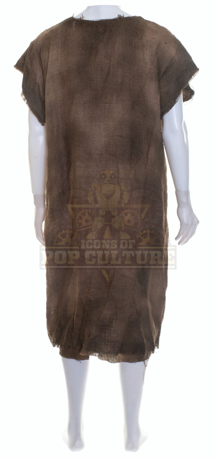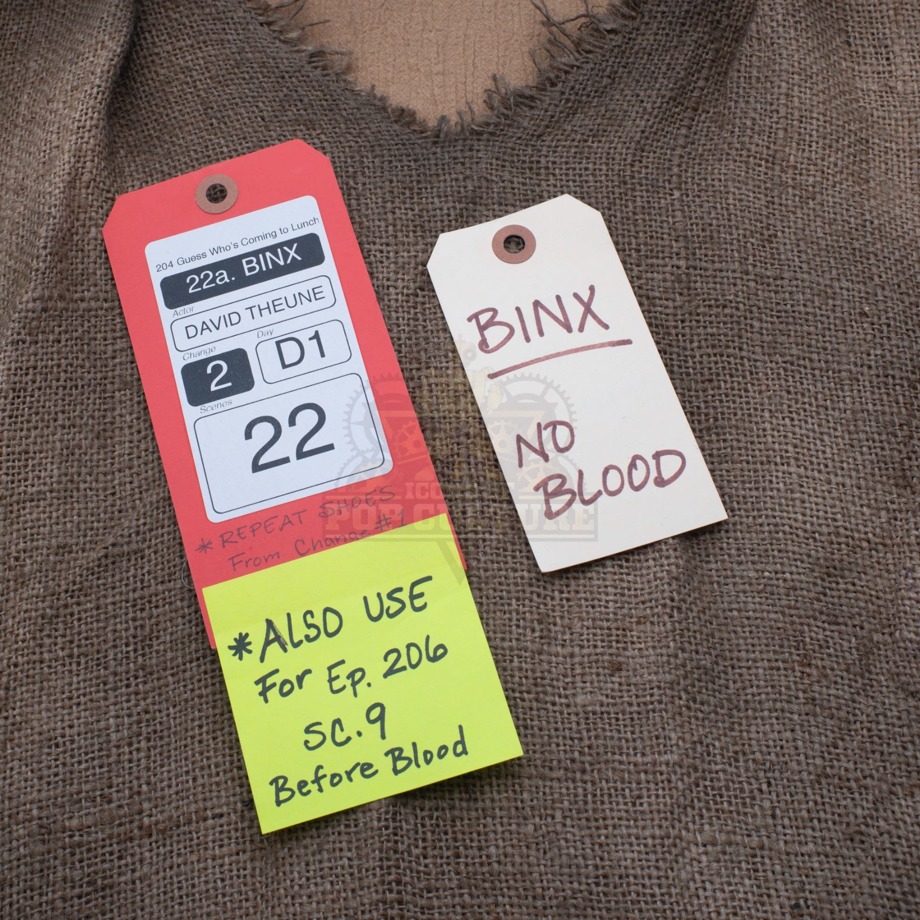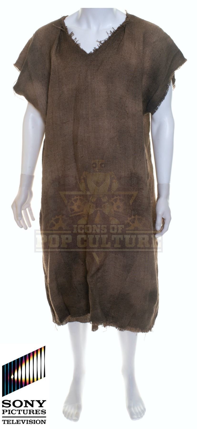 This tunic was custom-made by the production for use by David Theune as “Binx” in the season two episode titled “Guess Who's Coming to Lunch”. The tunic is made from burlap material with cotton lining and is distressed for use during filming. Included with the tunic is a production used costume tag that details the entire outfit, change and scene numbers used.