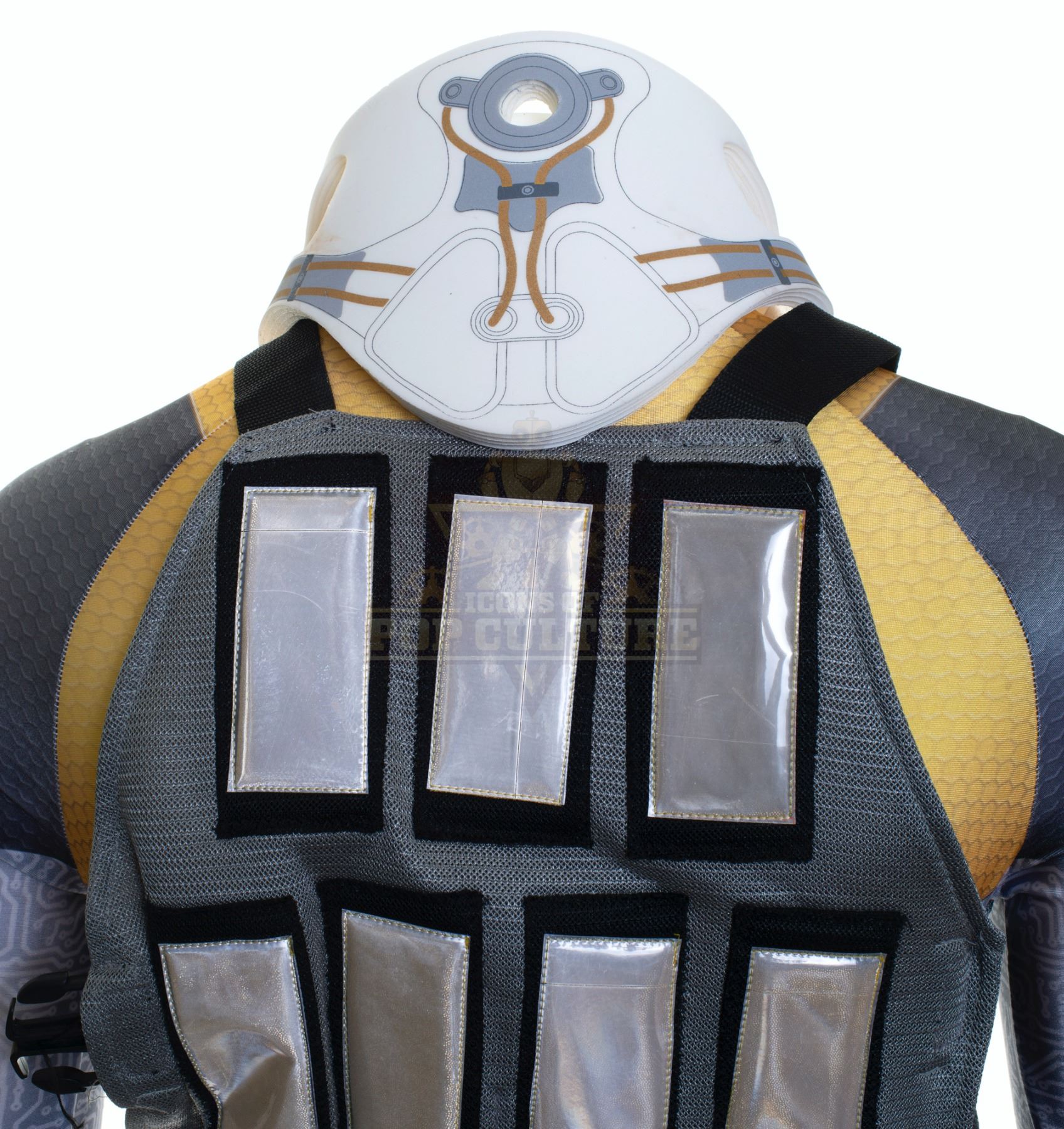 This outfit was custom-made by the production for use by Tim Johnson Jr. as “Jimmy McGurgan” in the season two episode titled “The I of the Tiger”. The outfit consists of a yellow, charcoal & light grey jumpsuit with honey comb, circuit board print and a number “1” applied to the right arm, a grey mesh solar panel vest and a pair of cloth covered shoes. Included with the outfit is a stunt/background Cerebral Port Collar, a pair of prop fitness trackers and a production used costume tag that details the entire outfit, change and scene numbers used.