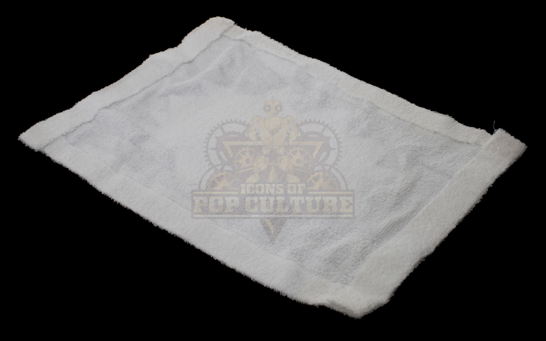 This hand towel was acquired and customized by the production for use by various actors and as set dressing in the season one episode titled “Prelude to an Apocalypse”. The white hand towel features the “Joosh” branded energy drink graphic applied to one side and measures 11.5” x 16”.