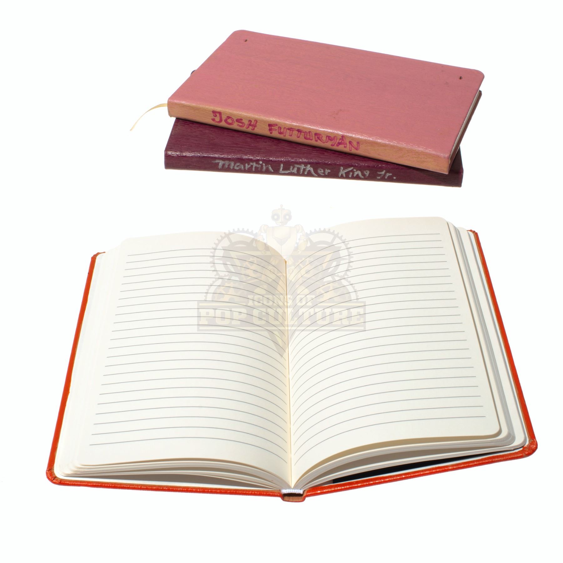 These books were acquired by the production for use by Josh Hutcherson as “Josh Futturman” and as set dressing in the season three episode titled “The Land After Time”. One book is Josh Futturman’s personal diary of his time with Nathalie Wood and features “Josh Futturman” written down the spine and a few pages of repeating text. The two library books are blank on the inside, one features “Martin Luther King Jr.” written down the spine and the other features “Keith Moon”.
