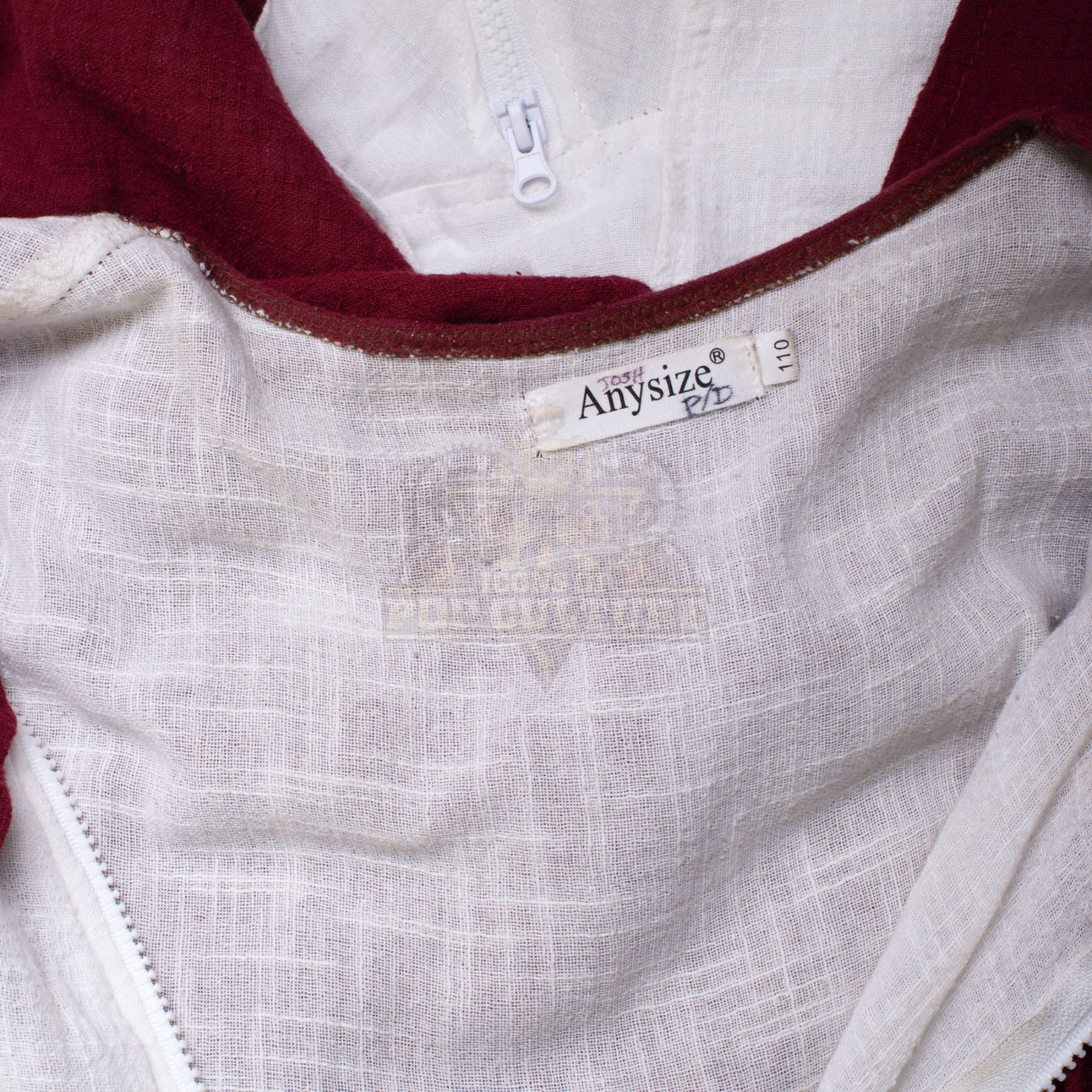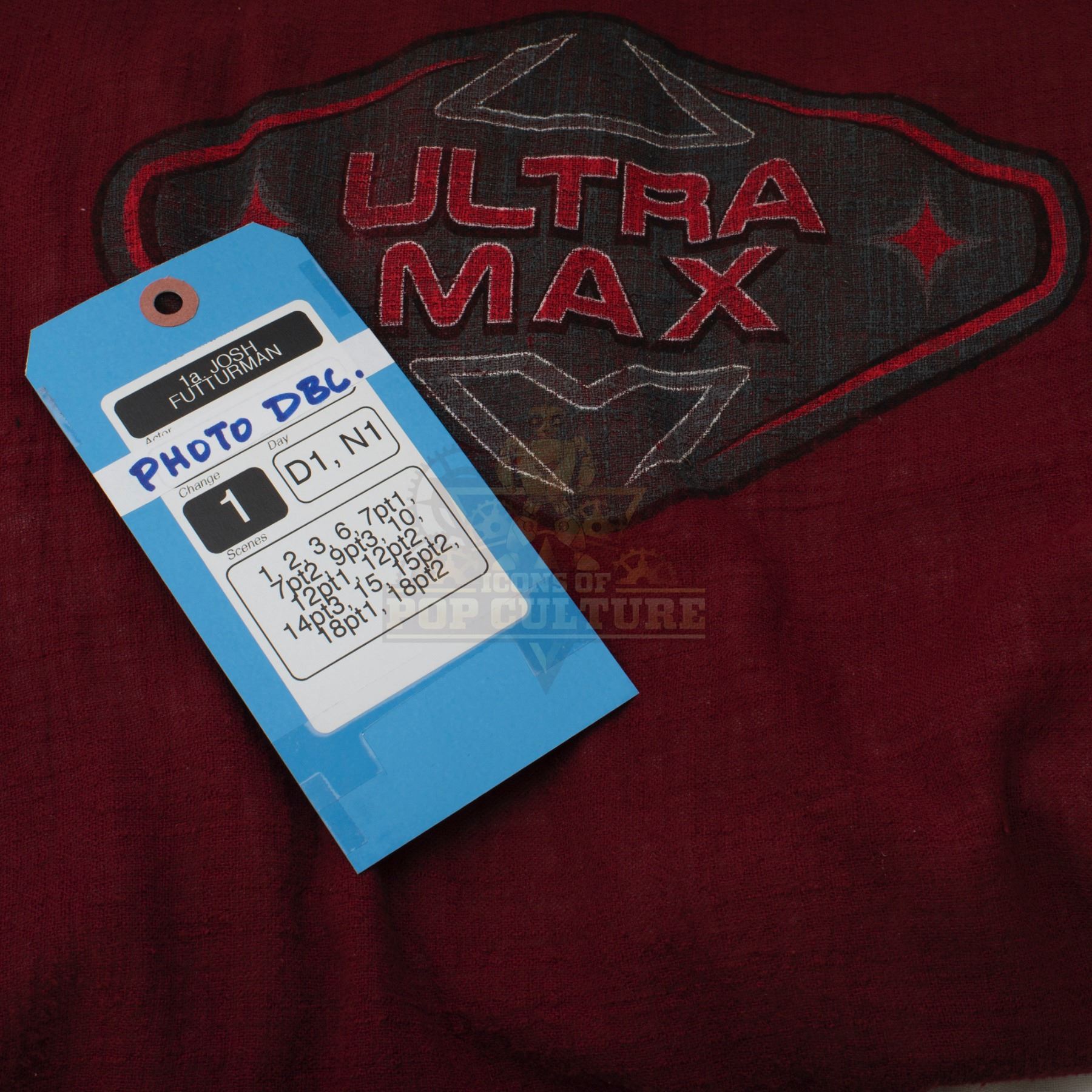 This outfit was acquired and customized by the production for use by Josh Hutcherson’s photo double as “Josh Futturman” in the season two episode titled “Ultra-Max”. The outfit consists of a white jumpsuit with attached burgundy smork that features the “Ultra Max” logo on the back and a pair of white socks. Included with the outfit is a production used costume tag that details the entire outfit, change and scene numbers used.
