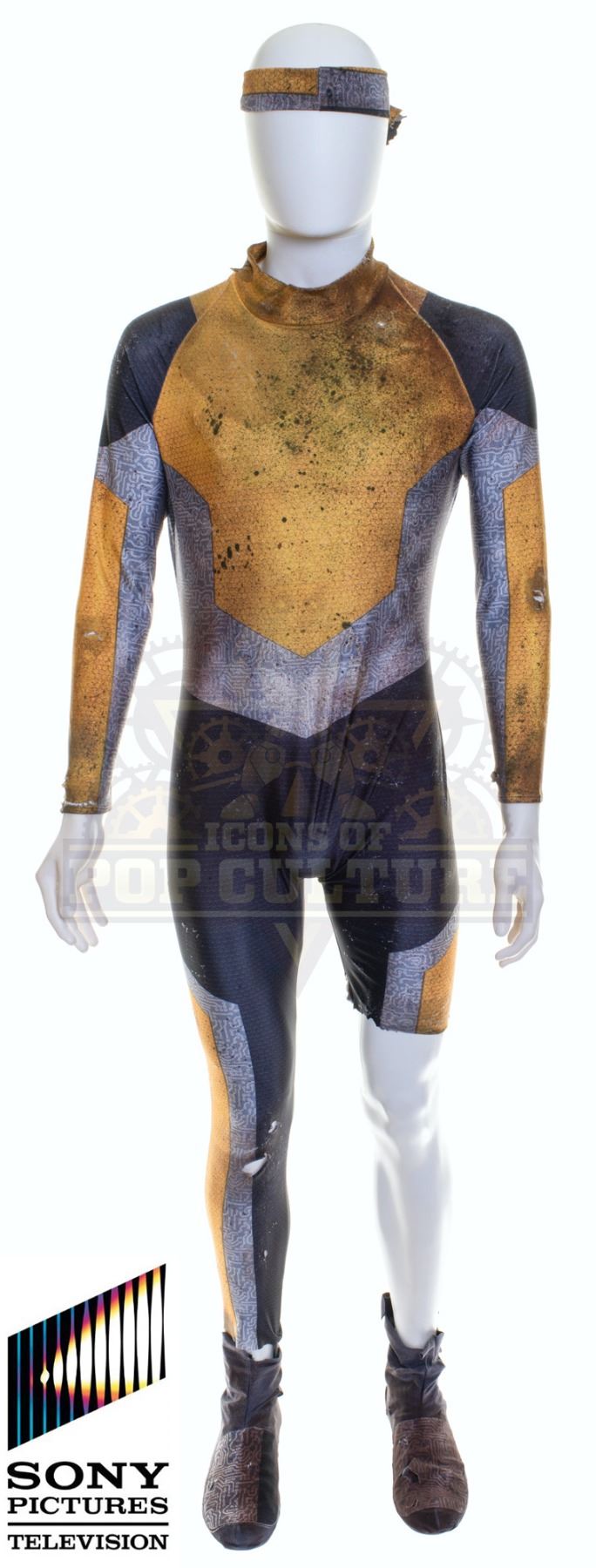 This outfit was custom-made by the production for use by Josh Hutcherson as an “Alternate Timeline Josh Futturman” in the season two episode titled “Ultra-Max”. The good news, he is not the Alternate Timeline Josh that accidentally gave the Time Travel Device to bin Laden. The outfit consists of a distressed “Mons” training jumpsuit, a pair of shoes and a bandana made from the torn off section of the jumpsuit’s left leg. Included with the outfit is a production used costume tag that details the entire outfit, change and scene numbers used.