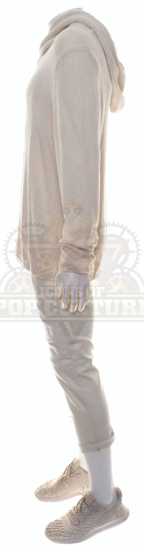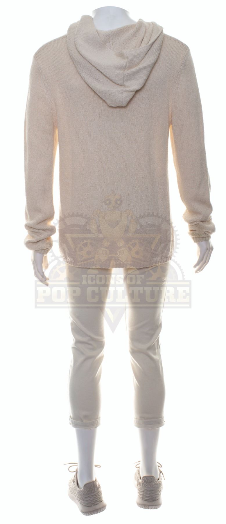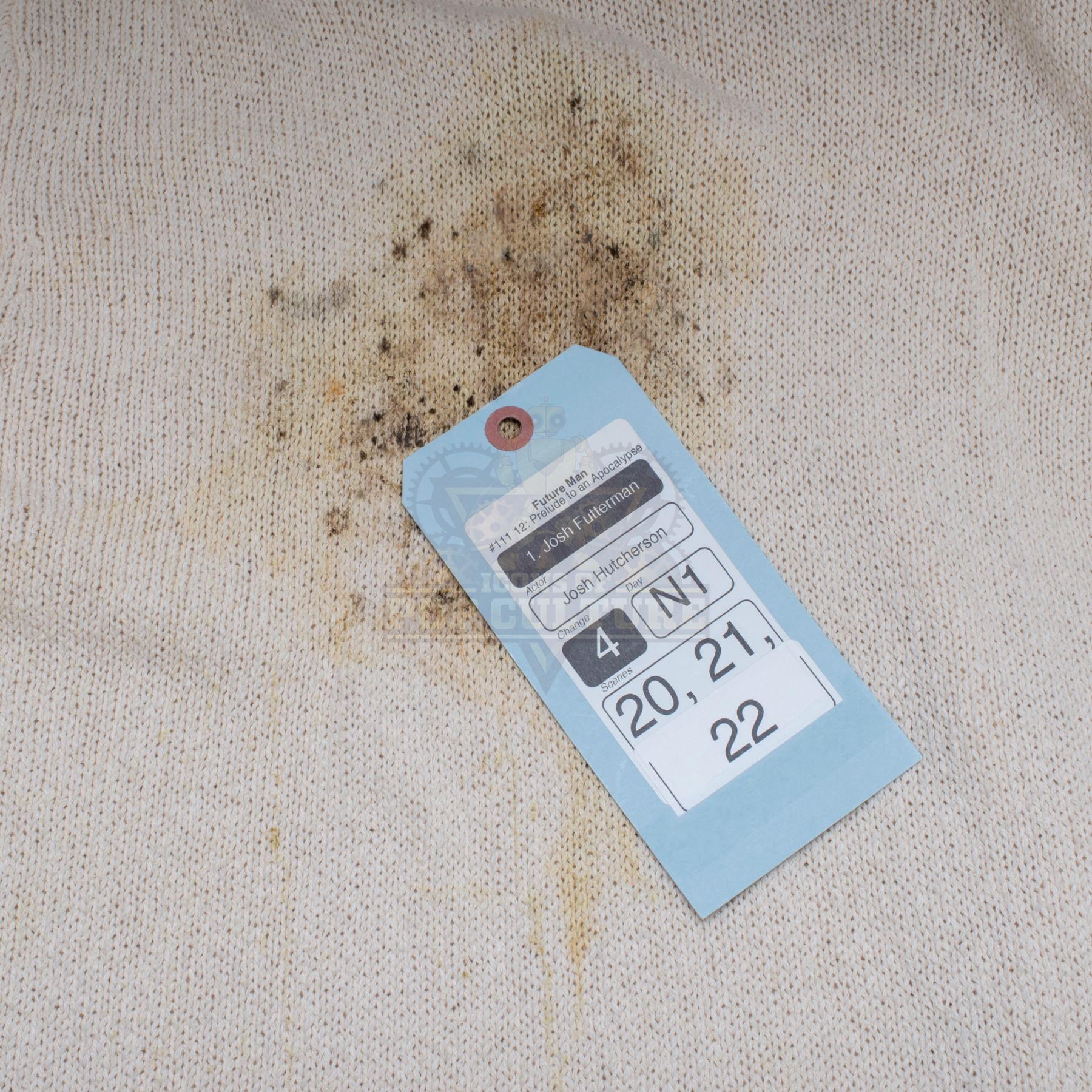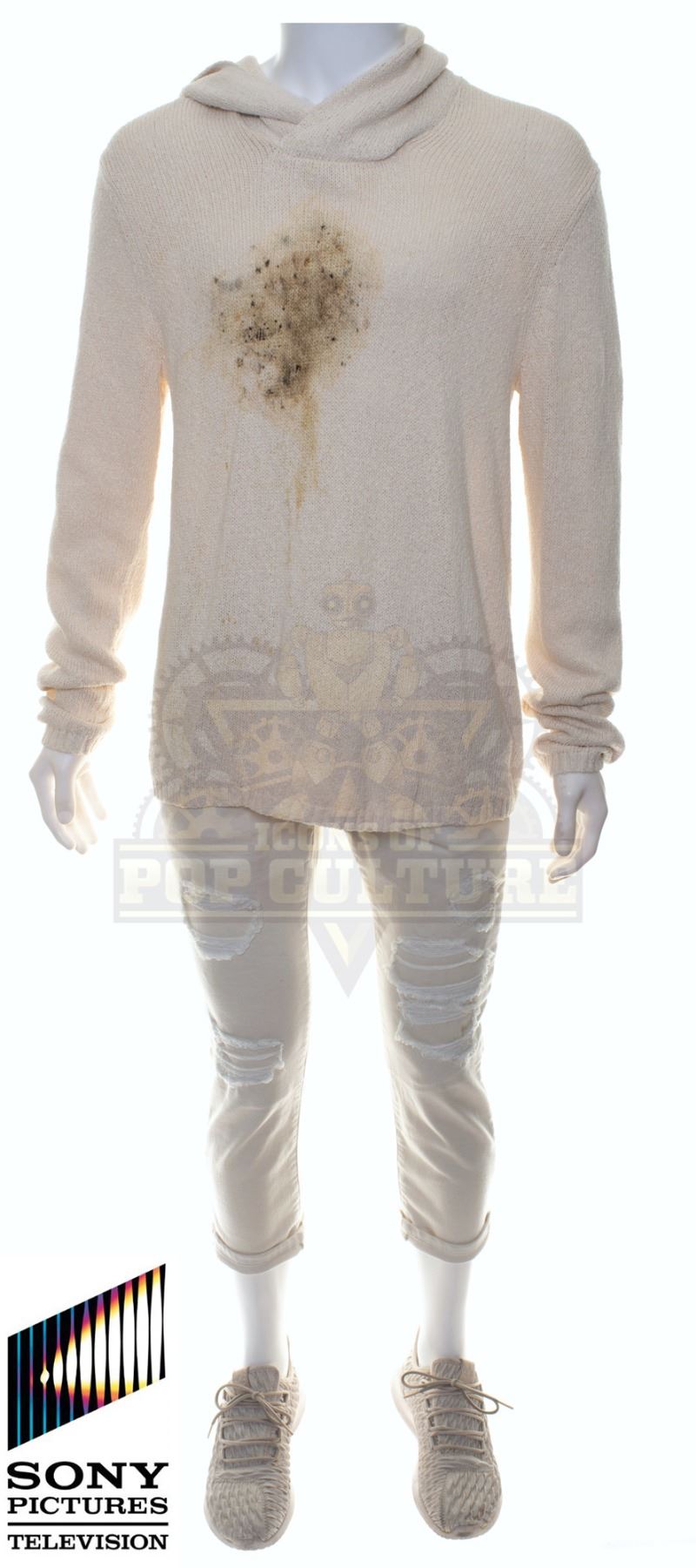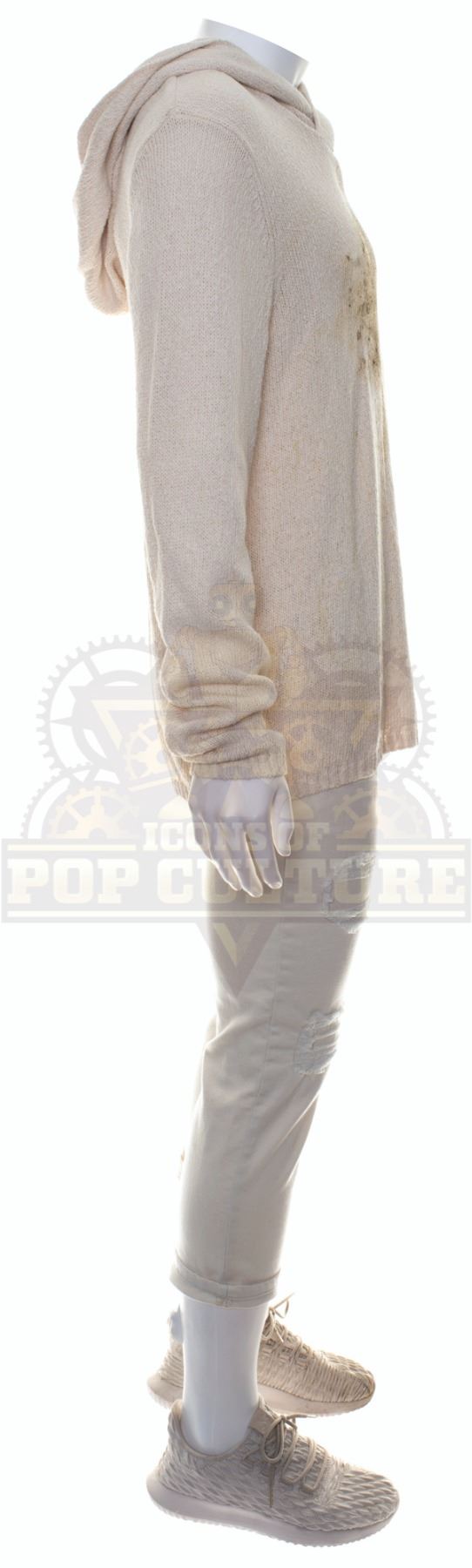 This outfit was acquired by the production for use by Josh Hutcherson as “Josh Futturman” in the season one episode titled “Prelude to an Apocalypse”. The outfit consists of a white hooded sweater that is stained with pea soup, a white sleeveless t-shirt, a pair of distressed white denim jeans and a pair of white sneakers. Included with the outfit is a production used costume tag that details the entire outfit, change and scene numbers used.