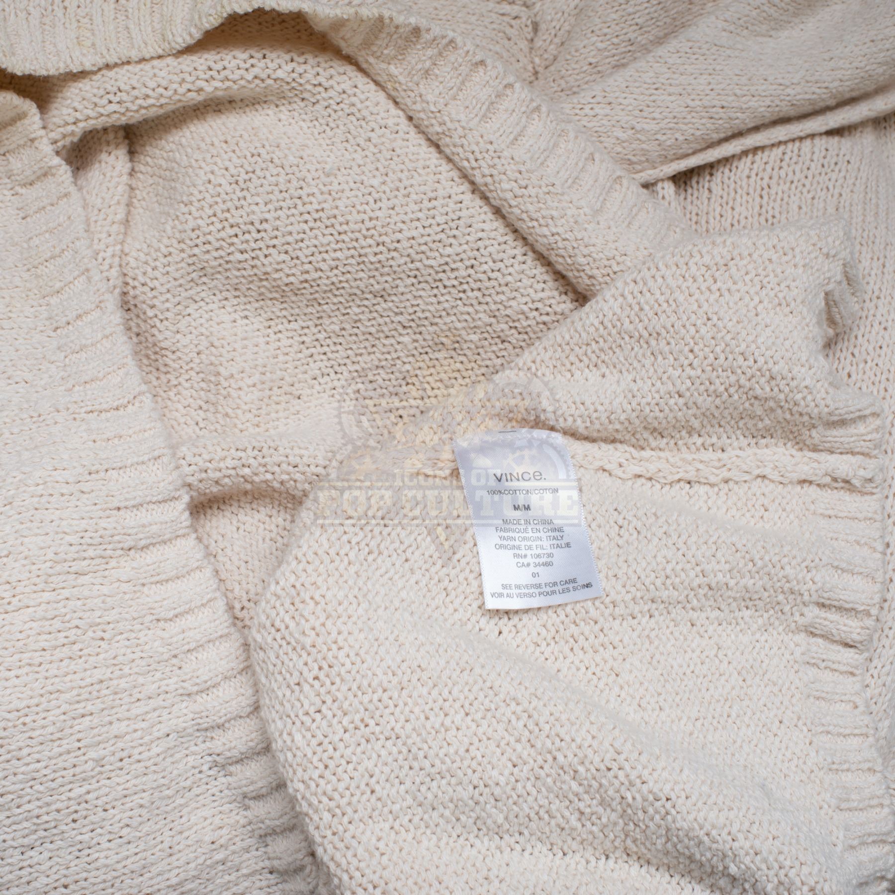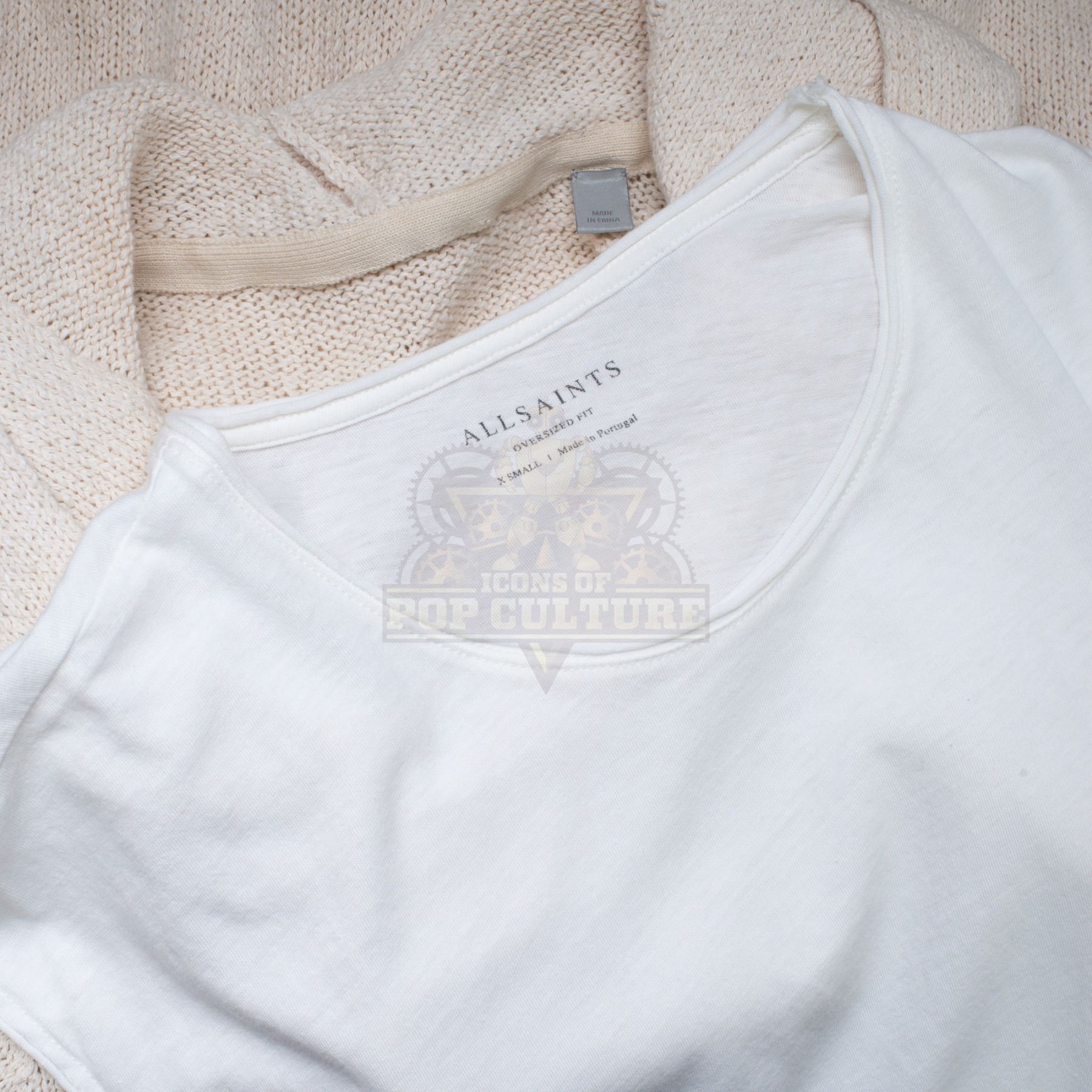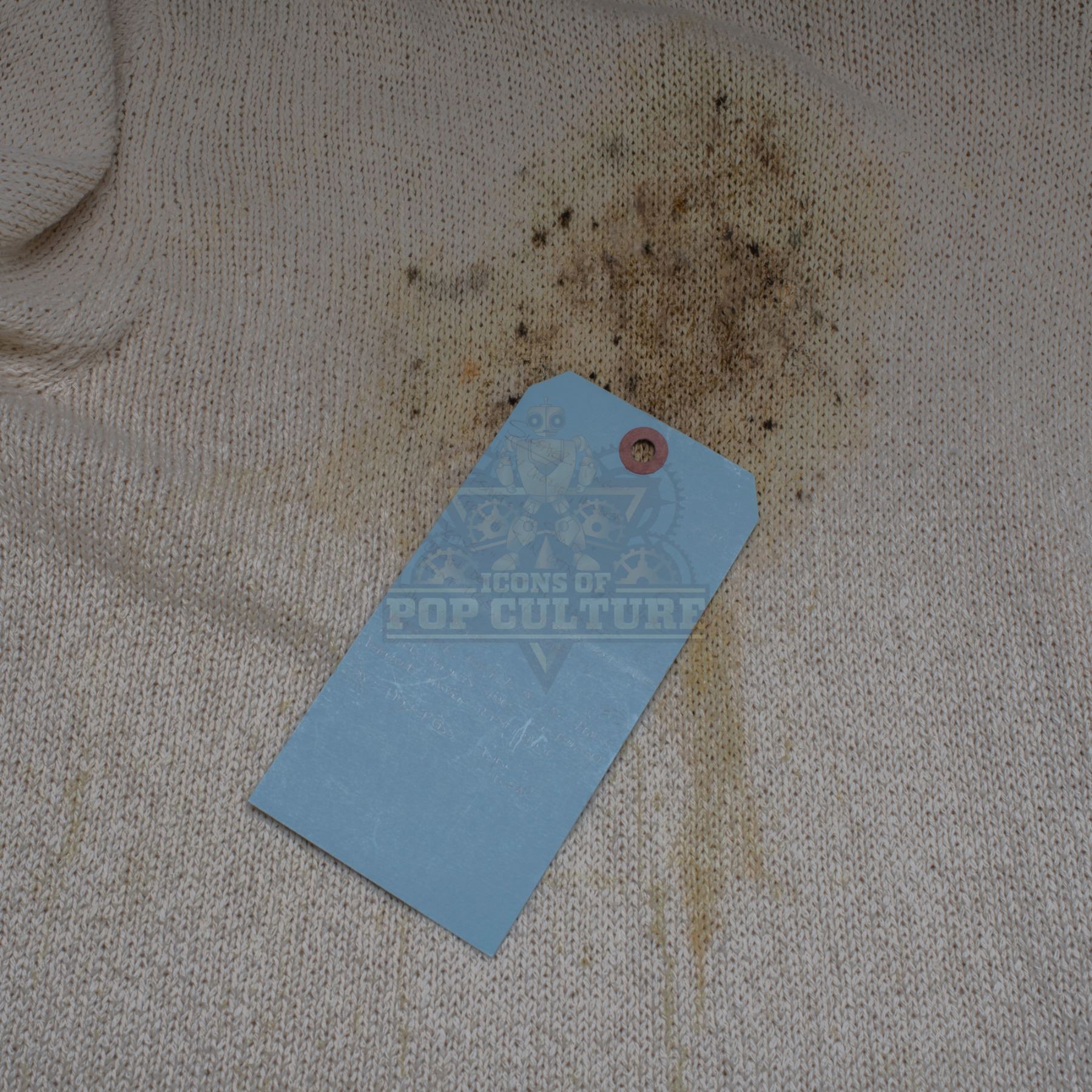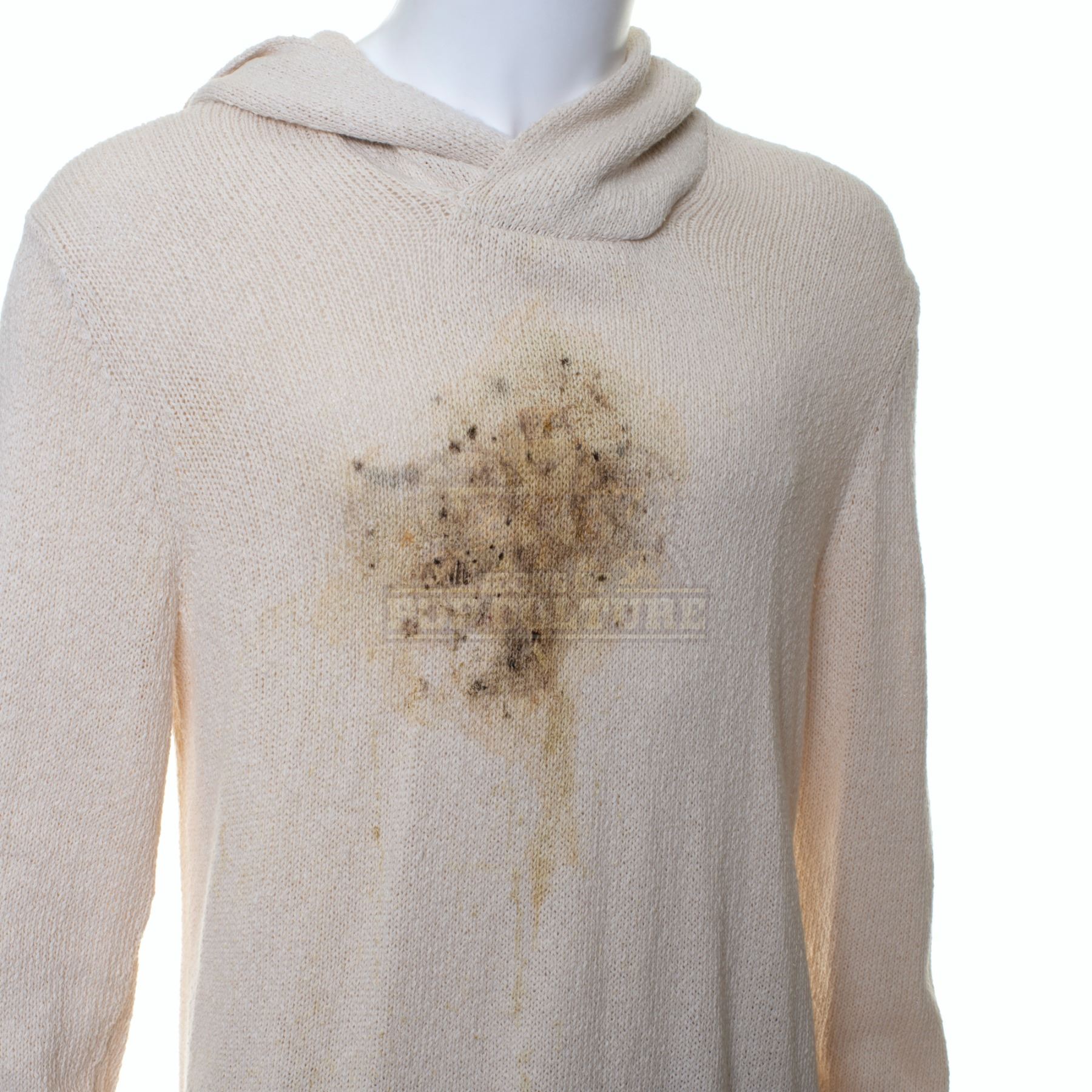 This outfit was acquired by the production for use by Josh Hutcherson as “Josh Futturman” in the season one episode titled “Prelude to an Apocalypse”. The outfit consists of a white hooded sweater that is stained with pea soup, a white sleeveless t-shirt, a pair of distressed white denim jeans and a pair of white sneakers. Included with the outfit is a production used costume tag that details the entire outfit, change and scene numbers used.