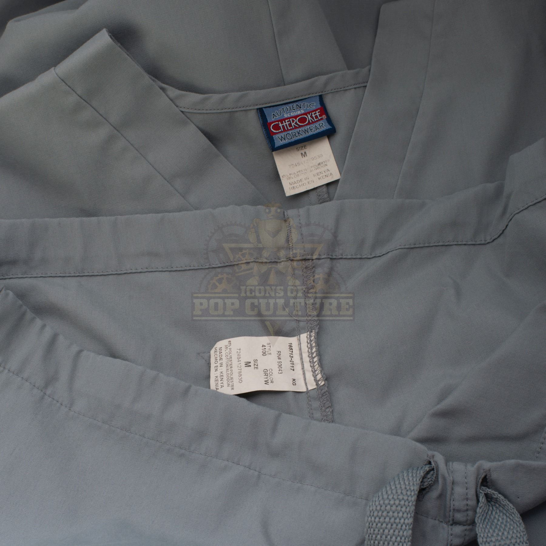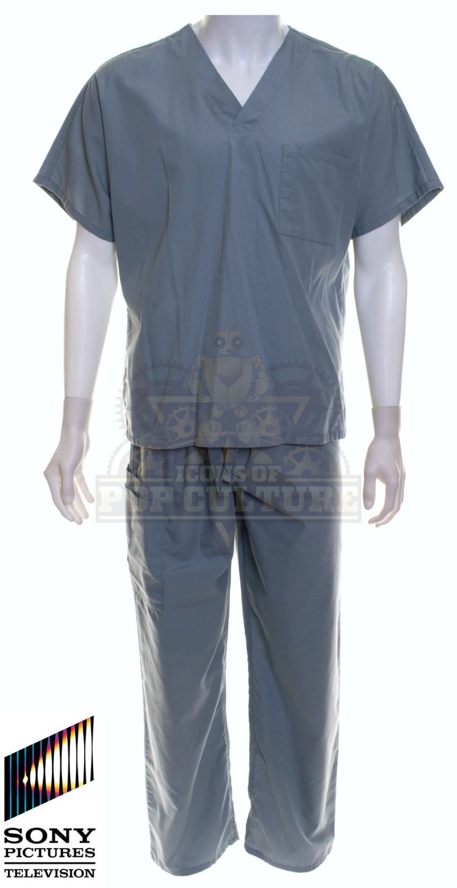 This uniform was acquired by the production for use by Josh Hutcherson as “Josh Futturman” in the season one episode titled “A date With Destiny”. The uniform consists of a short sleeve scrub top with “Alamore Asylum” in large black letters across the back and a pair of matching scrub pants. Included with the uniform is a production used costume tag that details the entire outfit, change and scene numbers used.