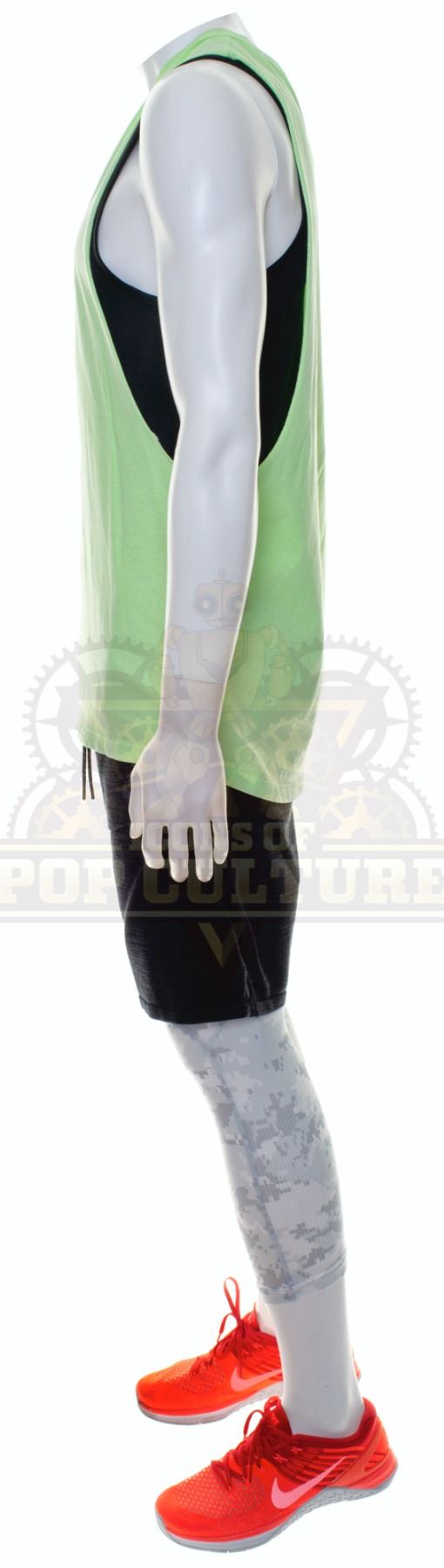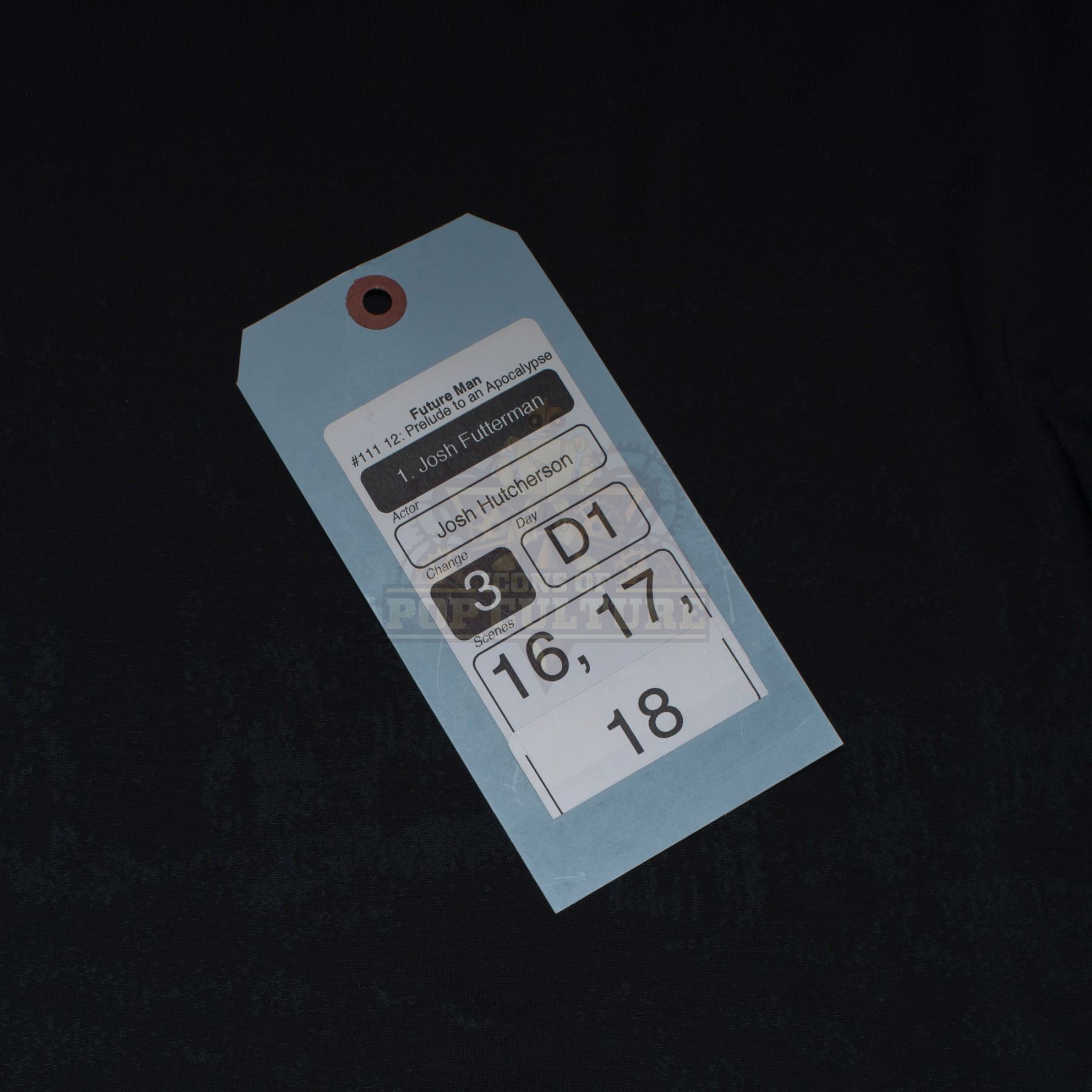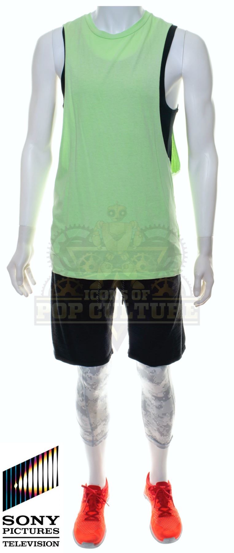 This outfit was acquired by the production for use by Josh Hutcherson as “Josh Futturman” in the season one episode titled “Prelude to an Apocalypse”. The outfit consists of a sleeveless green t-shirt, black tank top, a pair of digital camouflage compression pants, a pair of black shorts and a pair of orange sneakers. Included with the outfit is a production used costume tag that details the entire outfit, change and scene numbers used.