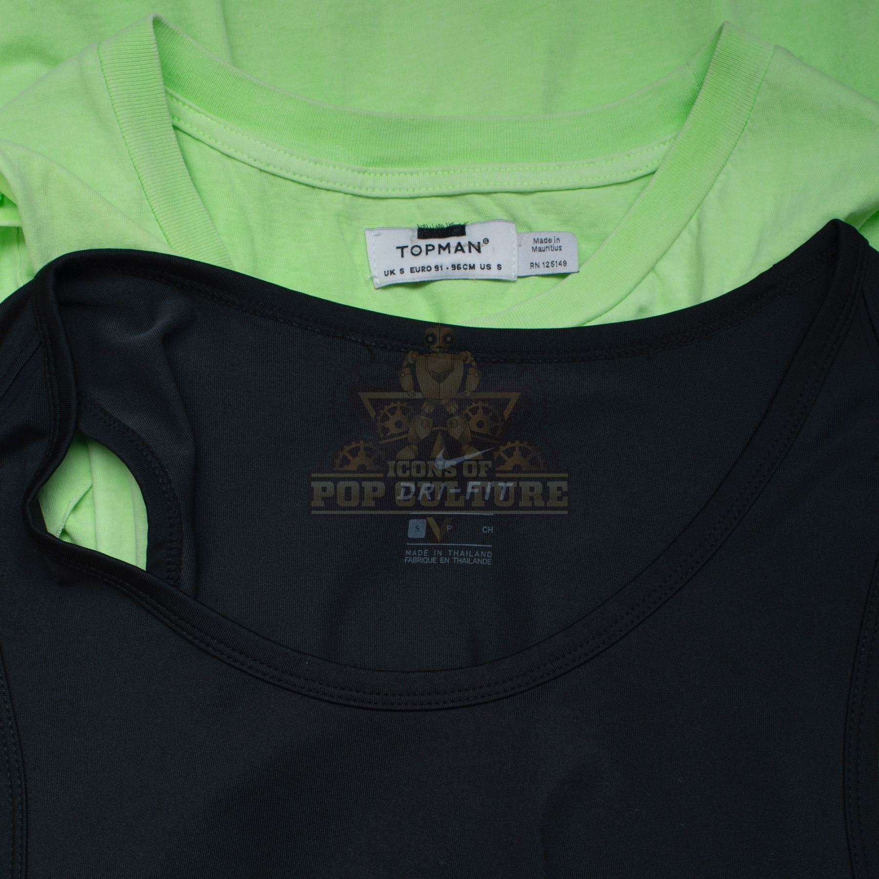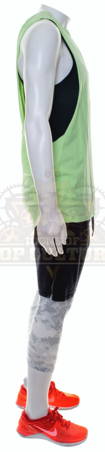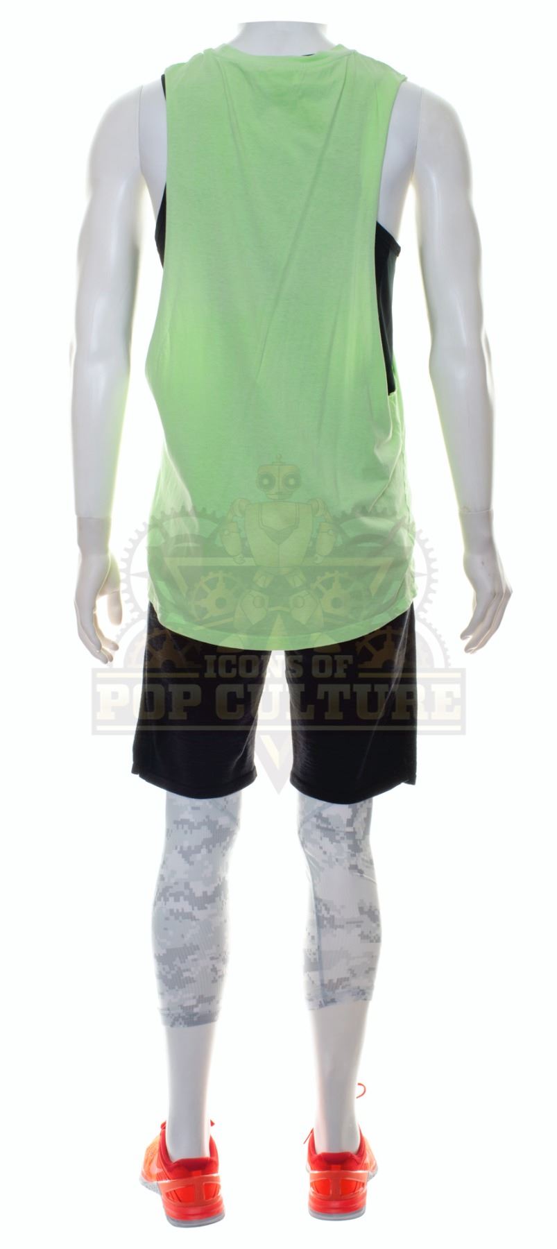 This outfit was acquired by the production for use by Josh Hutcherson as “Josh Futturman” in the season one episode titled “Prelude to an Apocalypse”. The outfit consists of a sleeveless green t-shirt, black tank top, a pair of digital camouflage compression pants, a pair of black shorts and a pair of orange sneakers. Included with the outfit is a production used costume tag that details the entire outfit, change and scene numbers used.