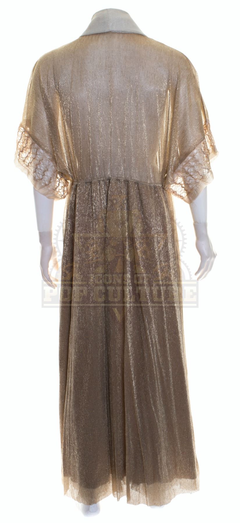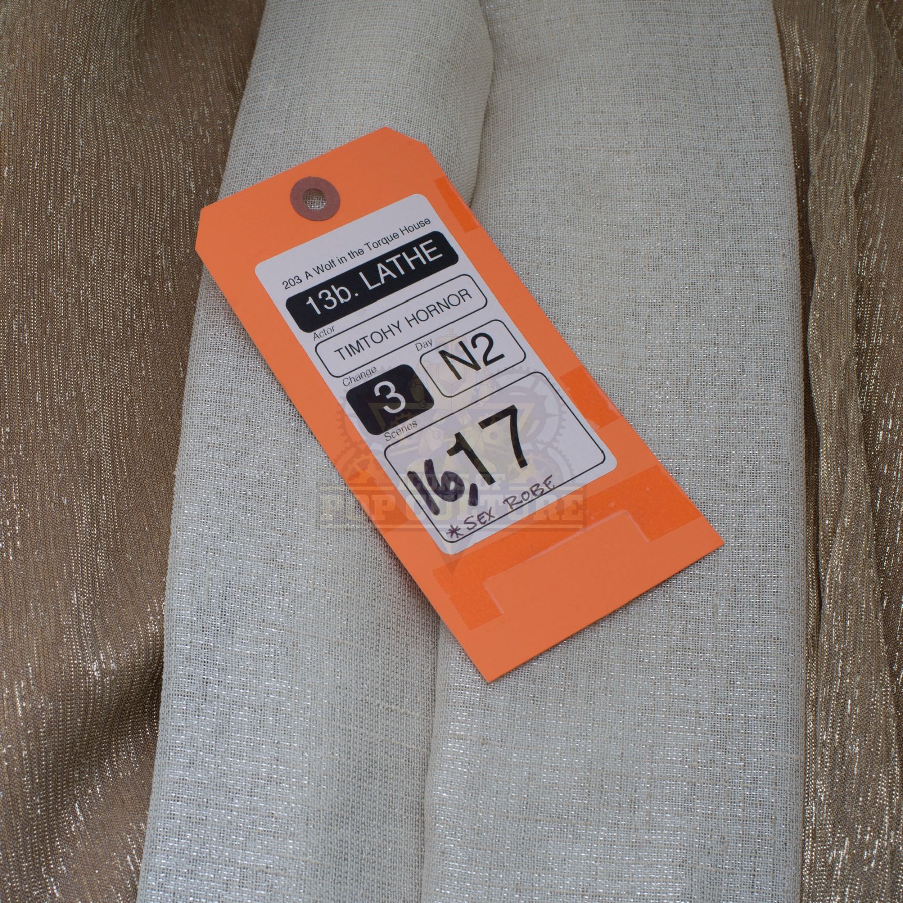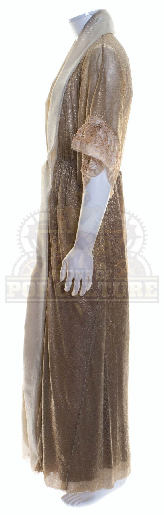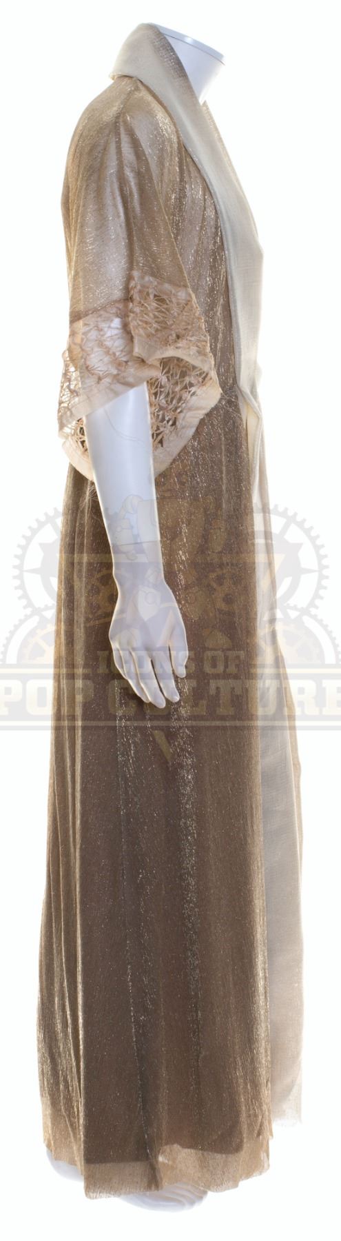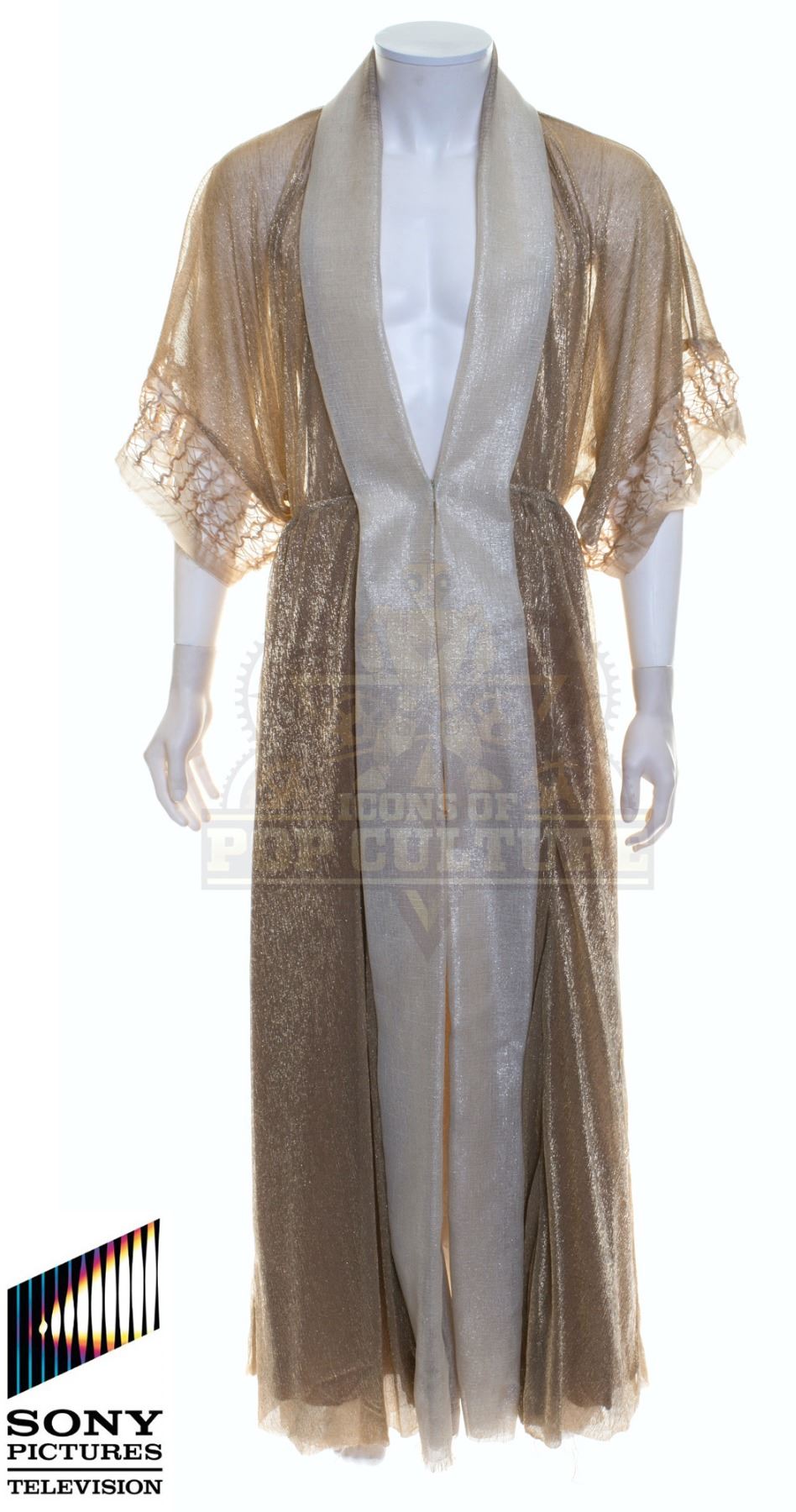 This robe was acquired by the production for use by Timothy Hornor as “Lathe” in the season two episode titled “A Wolf in the Torque House”. The sheer robe features cream and gold sections and short sleeves. Included with the robe is a production used costume tag that details the robe, change and scene numbers used.