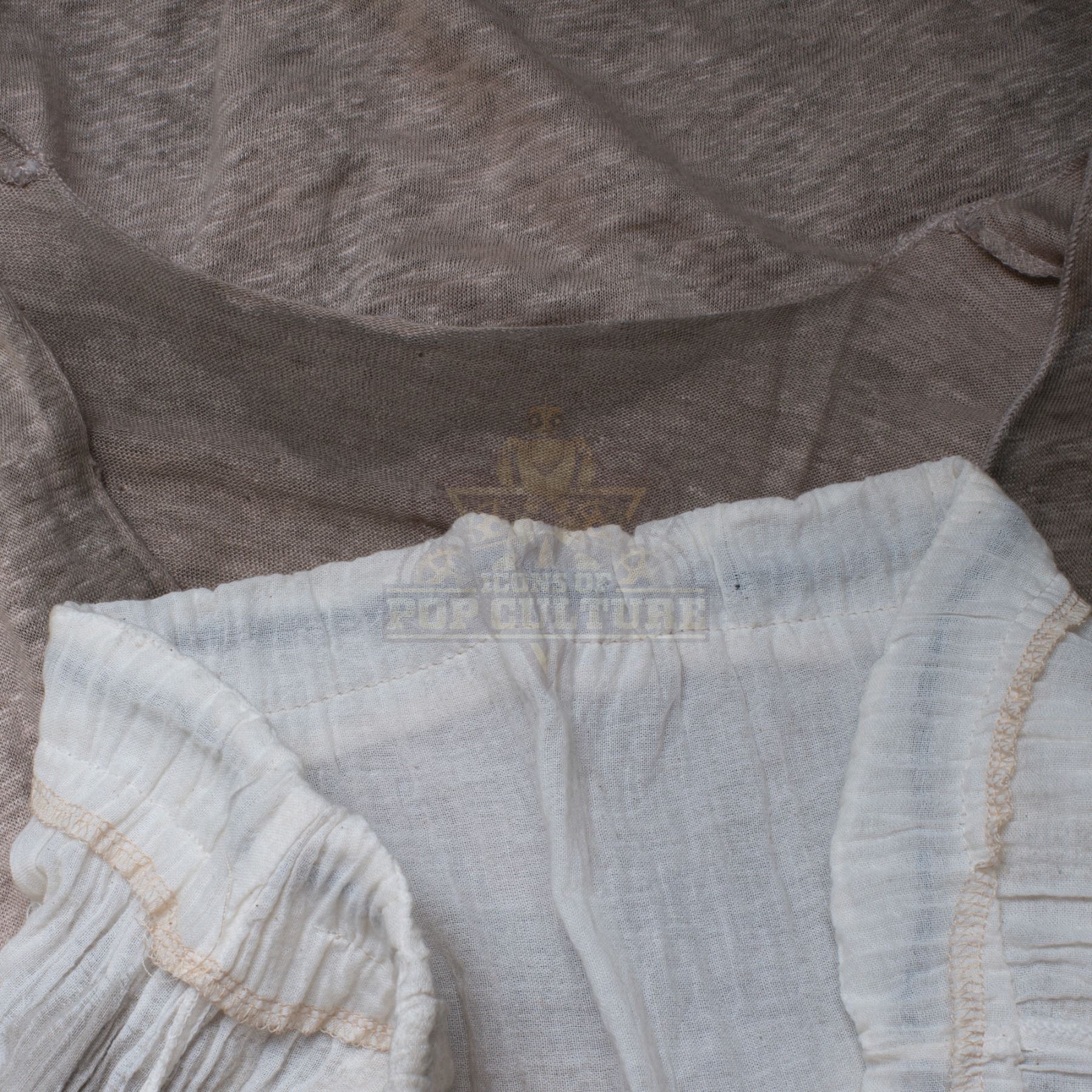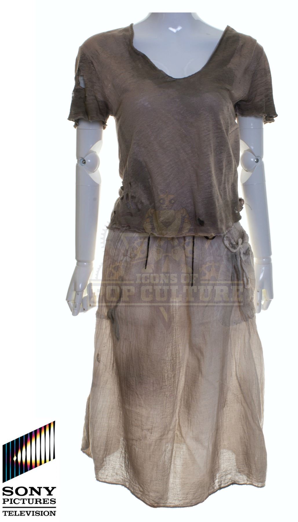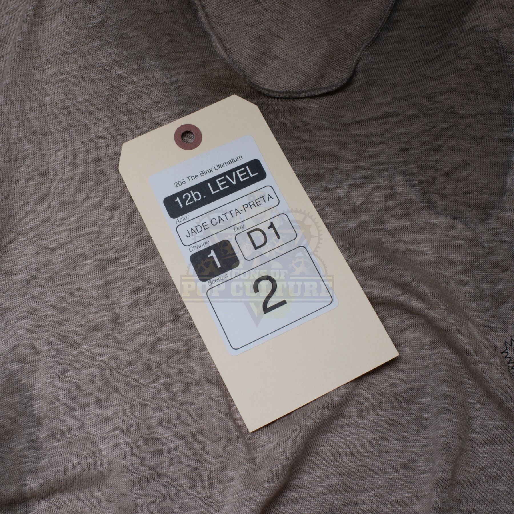 This outfit was acquired and customized by the production for use by Jade Catta-Preta as “Level” in the season two episode titled “The Binx Ultimatum”. The outfit is distressed for filming and consists of a short sleeve top and an off-white skirt. Included with the outfit is a production used costume tag that details the change and scene numbers used.