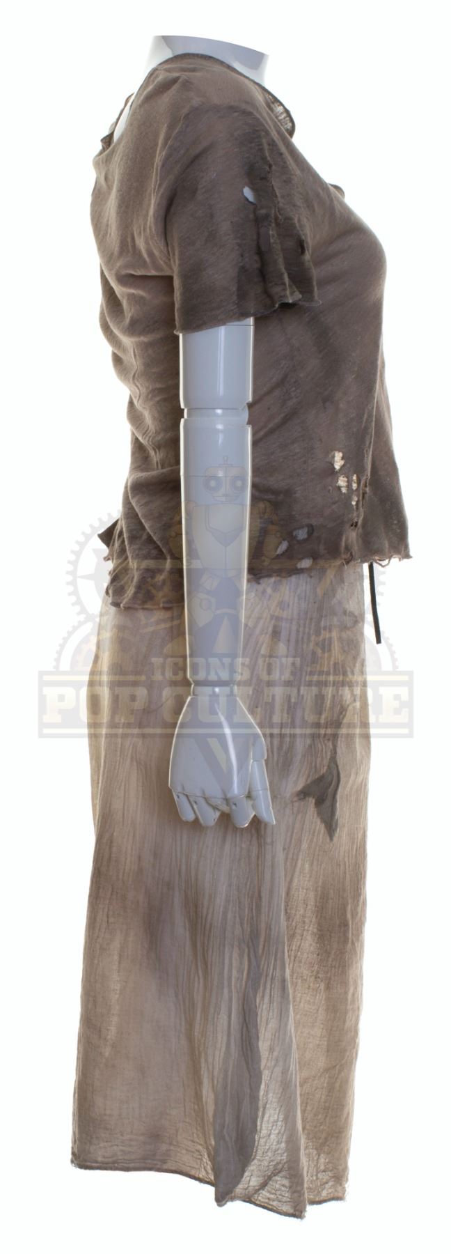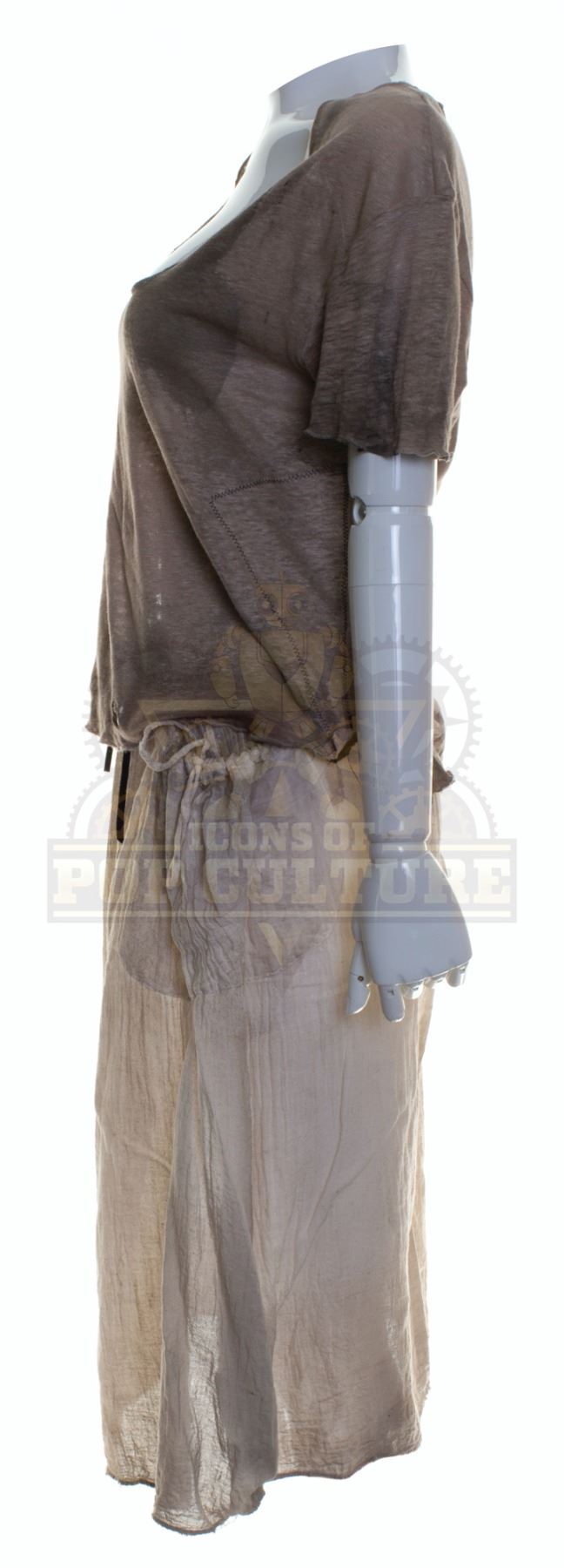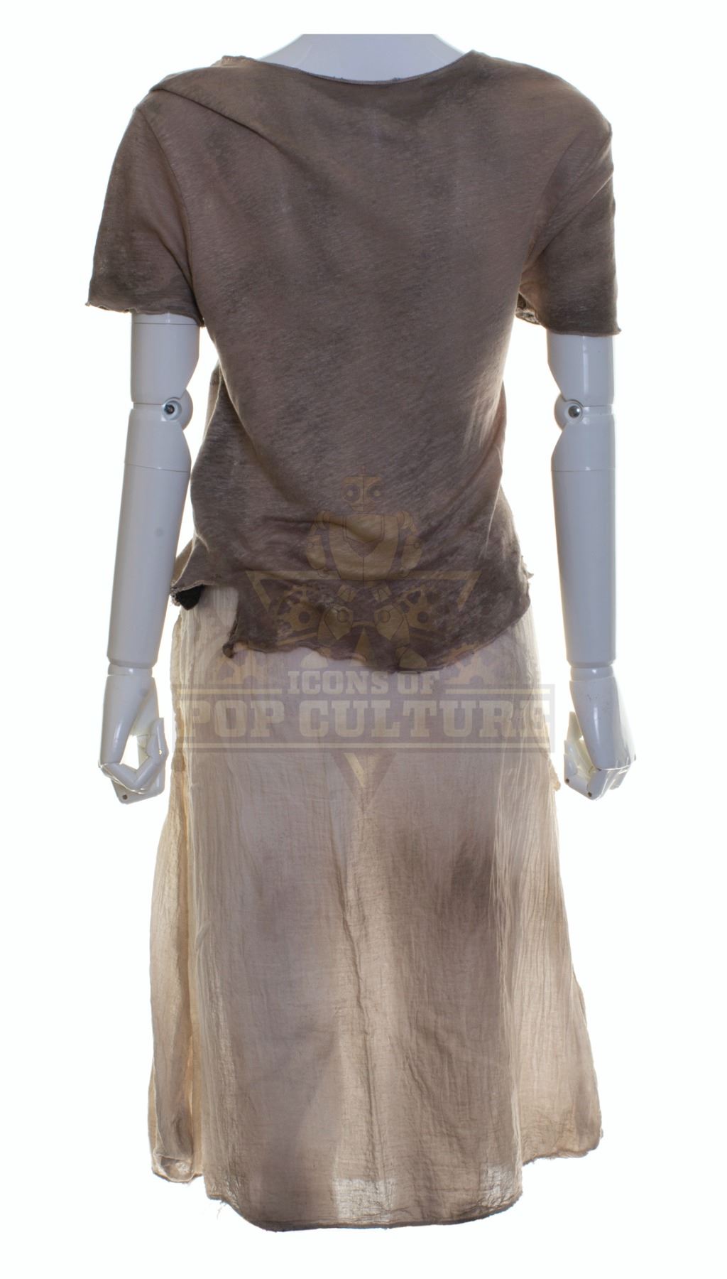 This outfit was acquired and customized by the production for use by Jade Catta-Preta as “Level” in the season two episode titled “The Binx Ultimatum”. The outfit is distressed for filming and consists of a short sleeve top and an off-white skirt. Included with the outfit is a production used costume tag that details the change and scene numbers used.