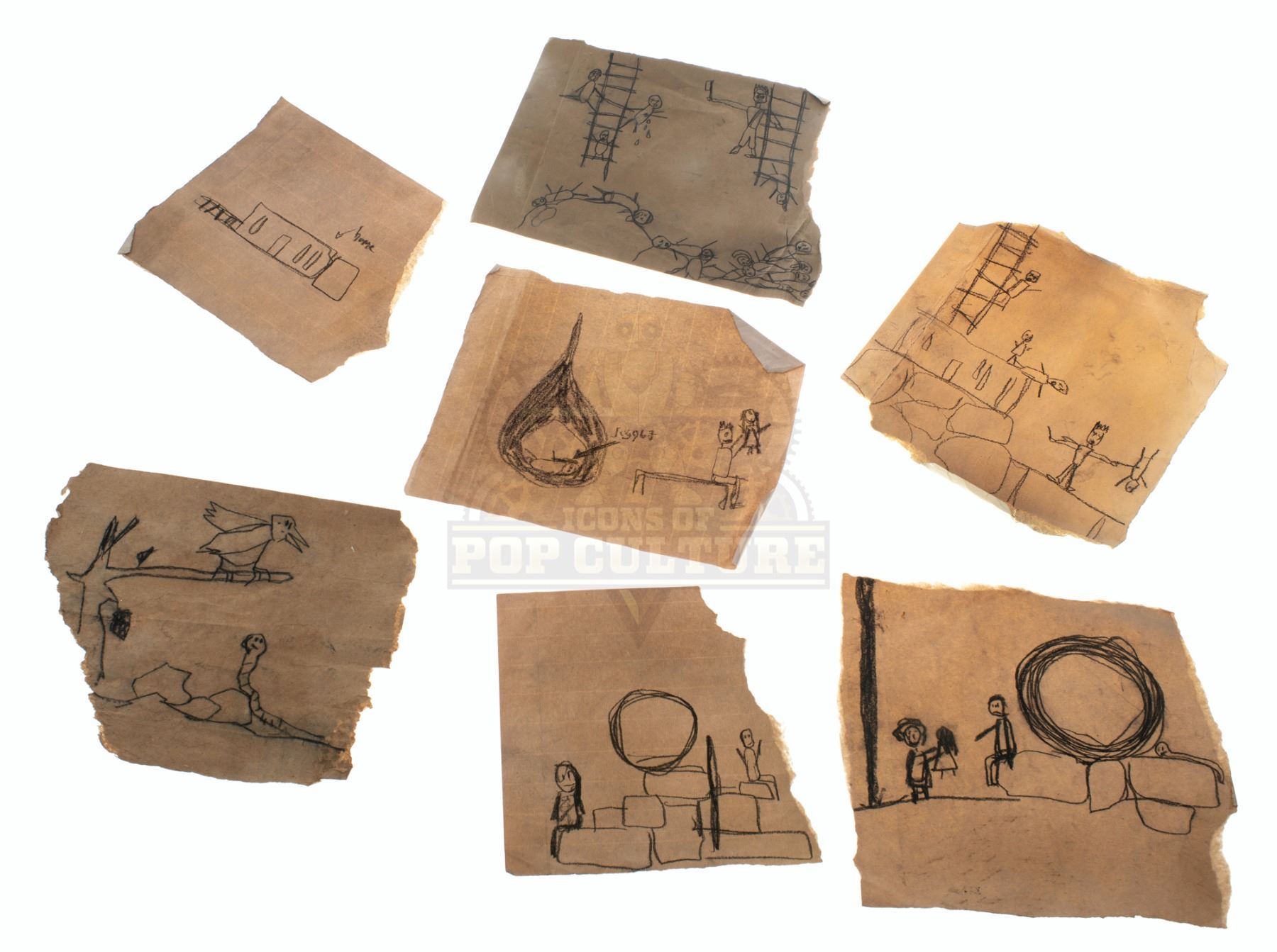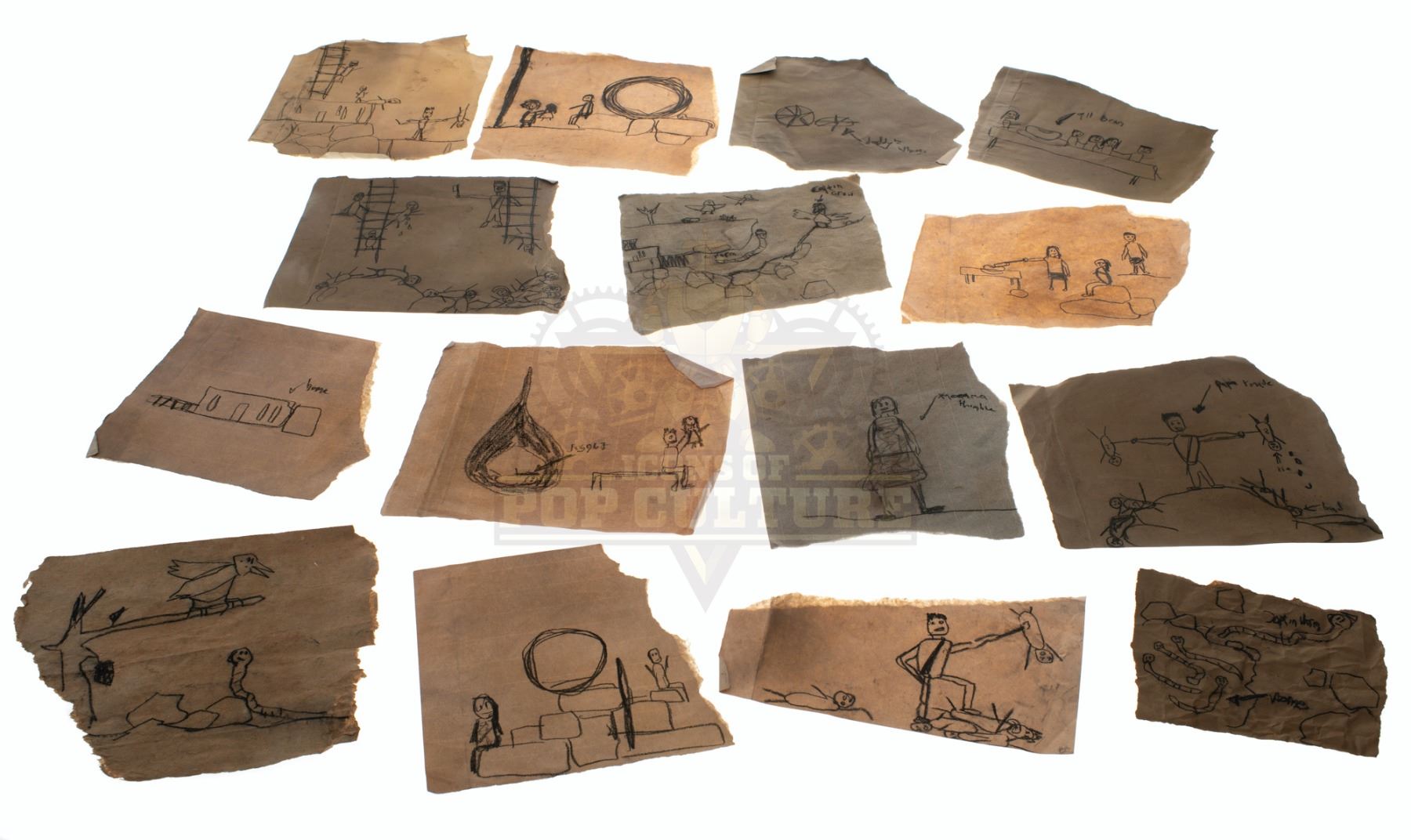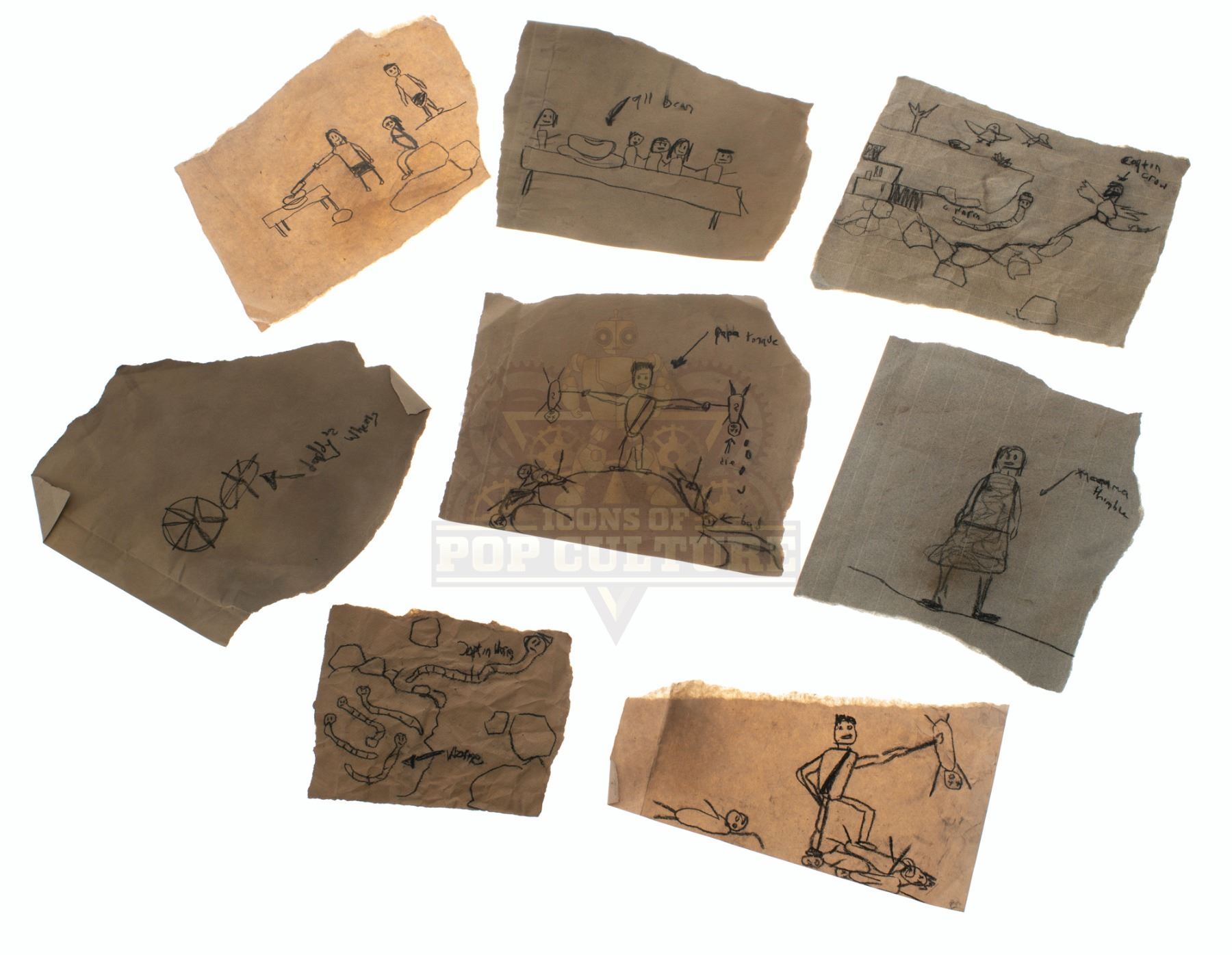 These drawings were custom-made by the production for use by Derek Wilson as “Wolf” in the season two episode titled “A Wolf in the Torque House”. The drawings by Lugnut features members of her family, Colonel Worm, wheels and the all bean. The fifteen random sized sections of paper range in size from 7.5” x 6” to 11.5” x 11”.