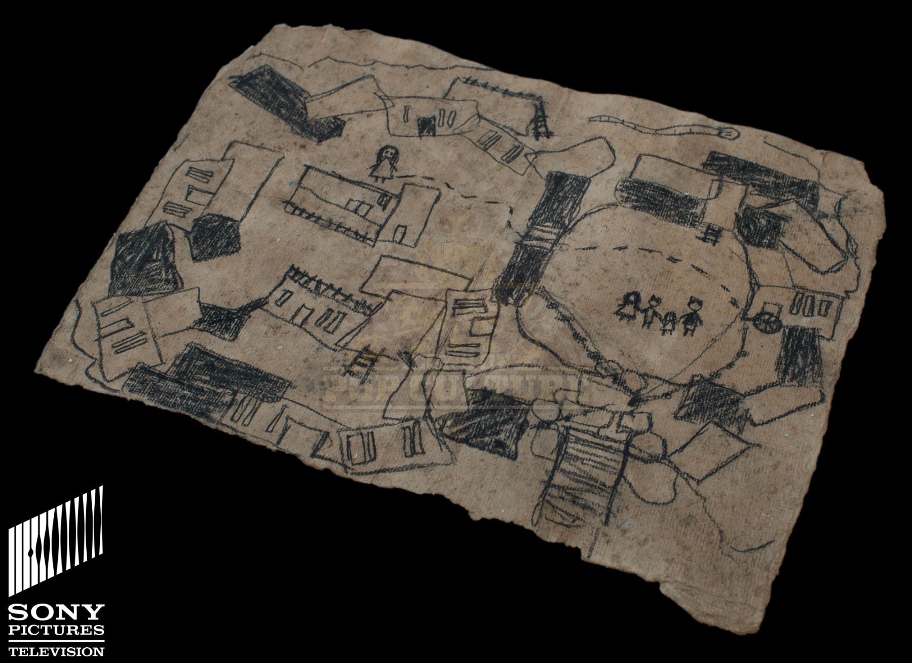 This prop map was custom-made by the production for use by Derek Wilson as “Wolf” in the season two episode titled “A Wolf in the Torque House”. The map was drawn by Lugnut to help Wolf “remember” the locations and details of the “NAG”. Map measures 11.75” x 9”.