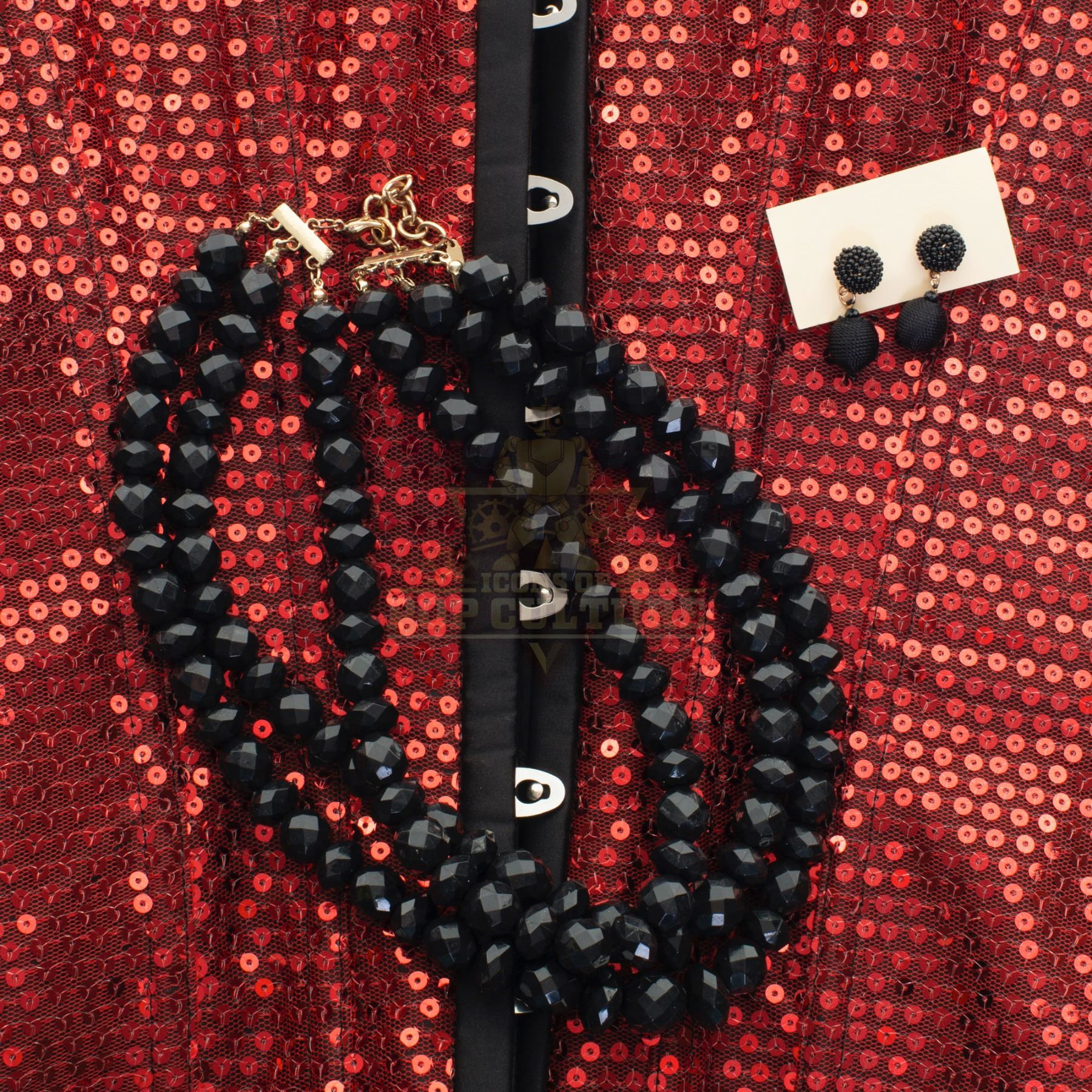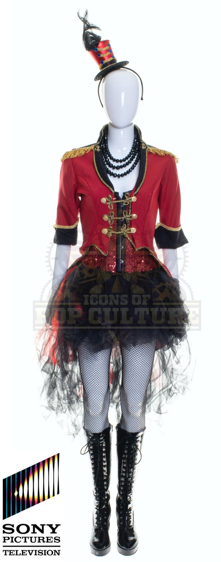 This outfit was acquired by the production for use by Libby Matthews as “Networking” in the season two episode titled “Exes and OS”. The outfit consists of a red tail coat, red corset, a pair of fishnet pantyhose, black and red skirt a pair of black boots, a black “stone” necklace, a pair of earrings and a top hat.