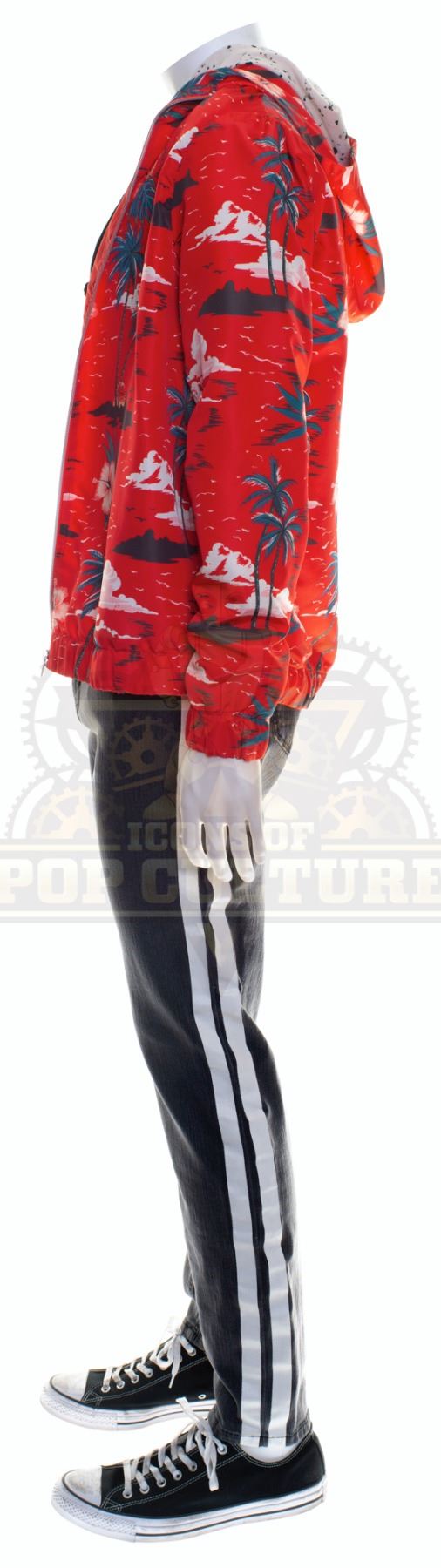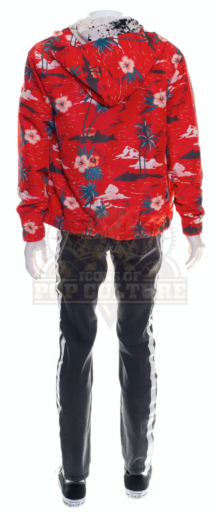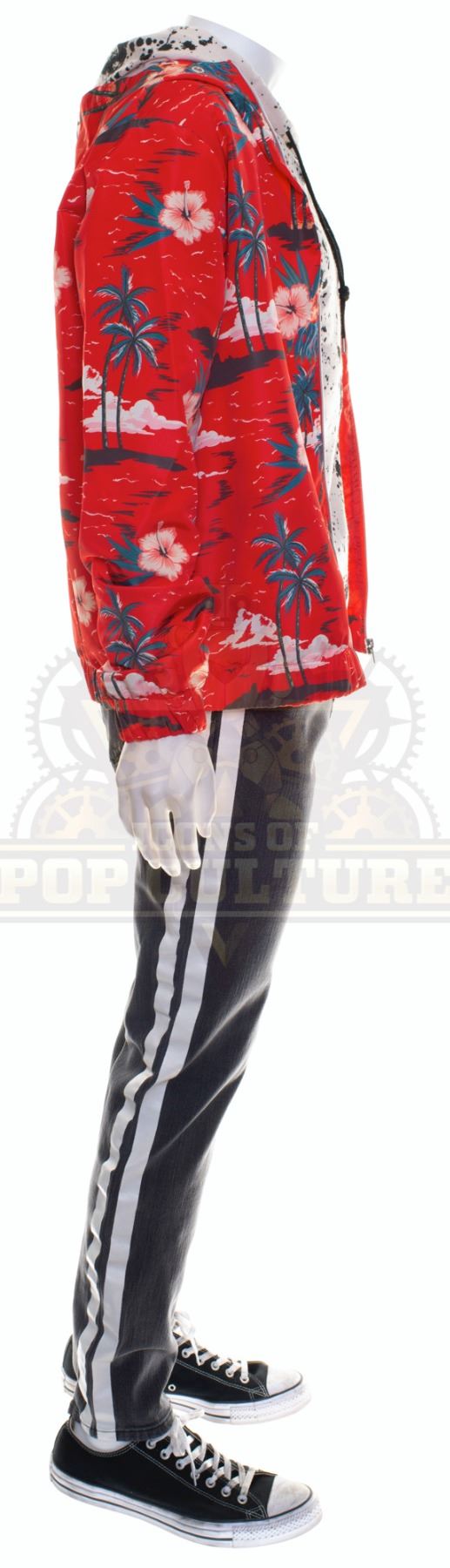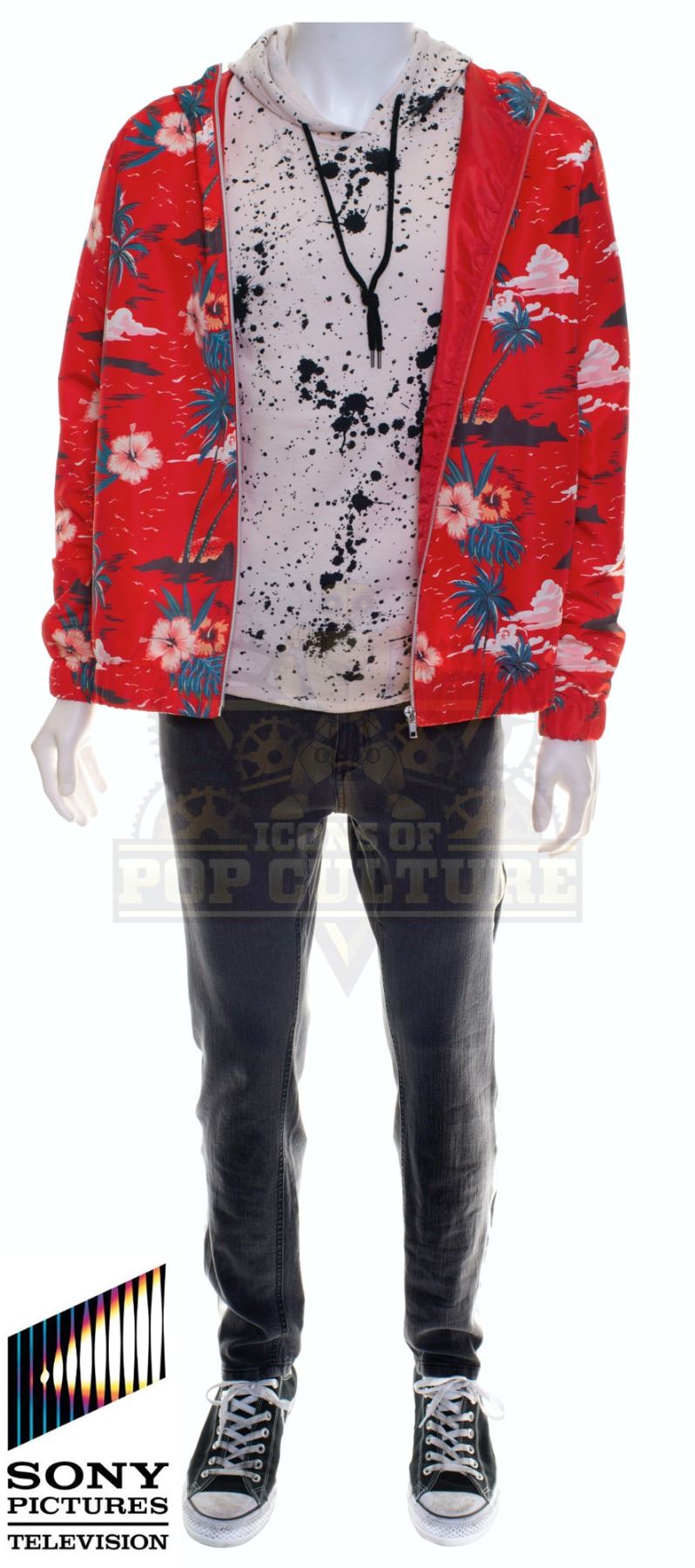 This outfit was acquired by the production for use by Paul Scheer as “Paul” in the season two episode titled “Countdown to Prologue”. The outfit consists of a white shirt with black paint splatters print, a red Hawaiian print jacket, a pair of grey pants with white lines down the sides and a pair of black and white sneakers. Included with the outfit is a production used costume tag that details the entire outfit, change and scene numbers used.