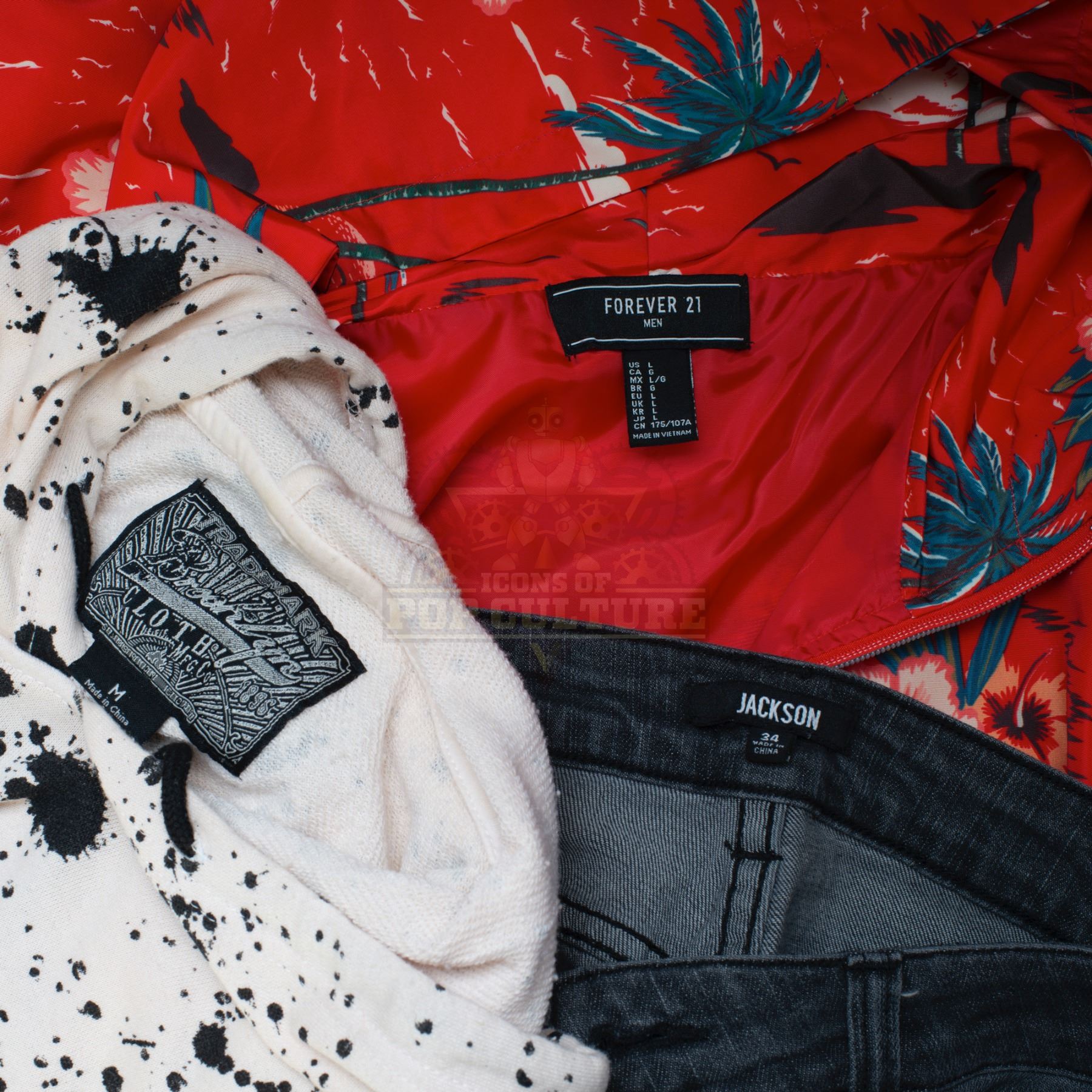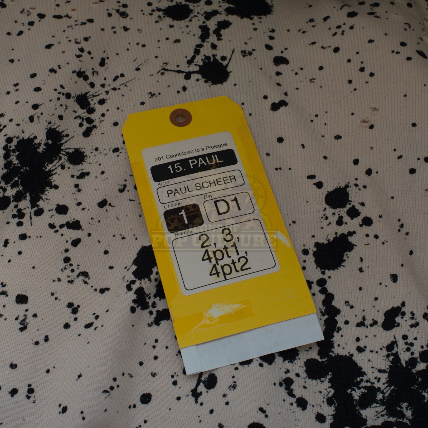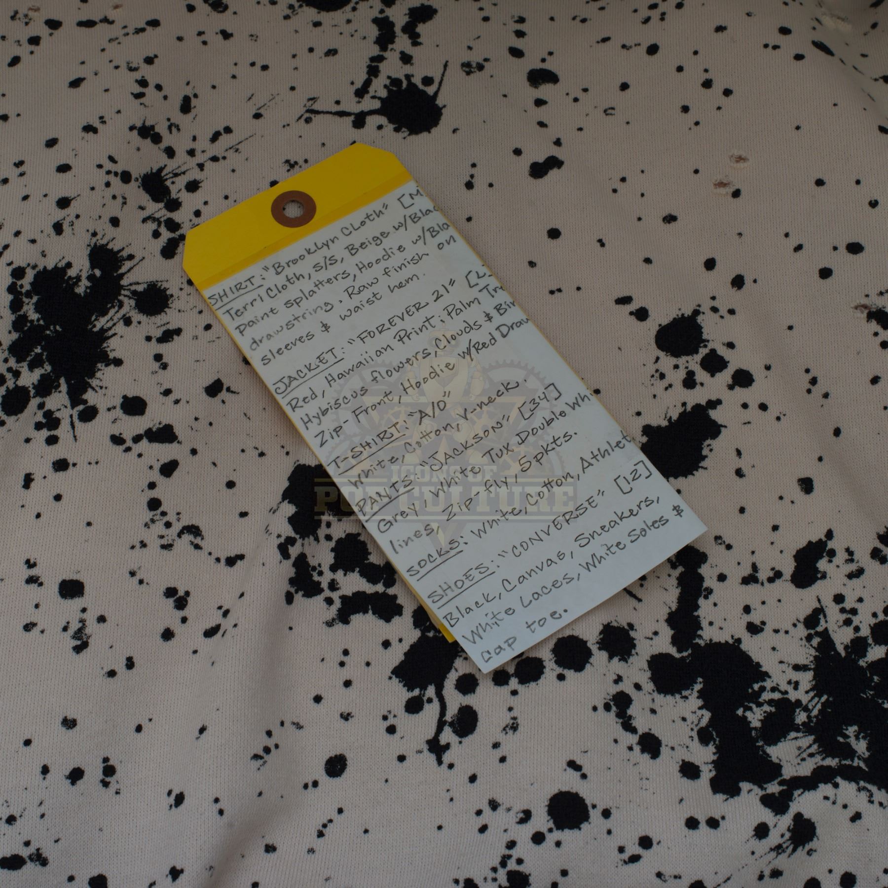 This outfit was acquired by the production for use by Paul Scheer as “Paul” in the season two episode titled “Countdown to Prologue”. The outfit consists of a white shirt with black paint splatters print, a red Hawaiian print jacket, a pair of grey pants with white lines down the sides and a pair of black and white sneakers. Included with the outfit is a production used costume tag that details the entire outfit, change and scene numbers used.