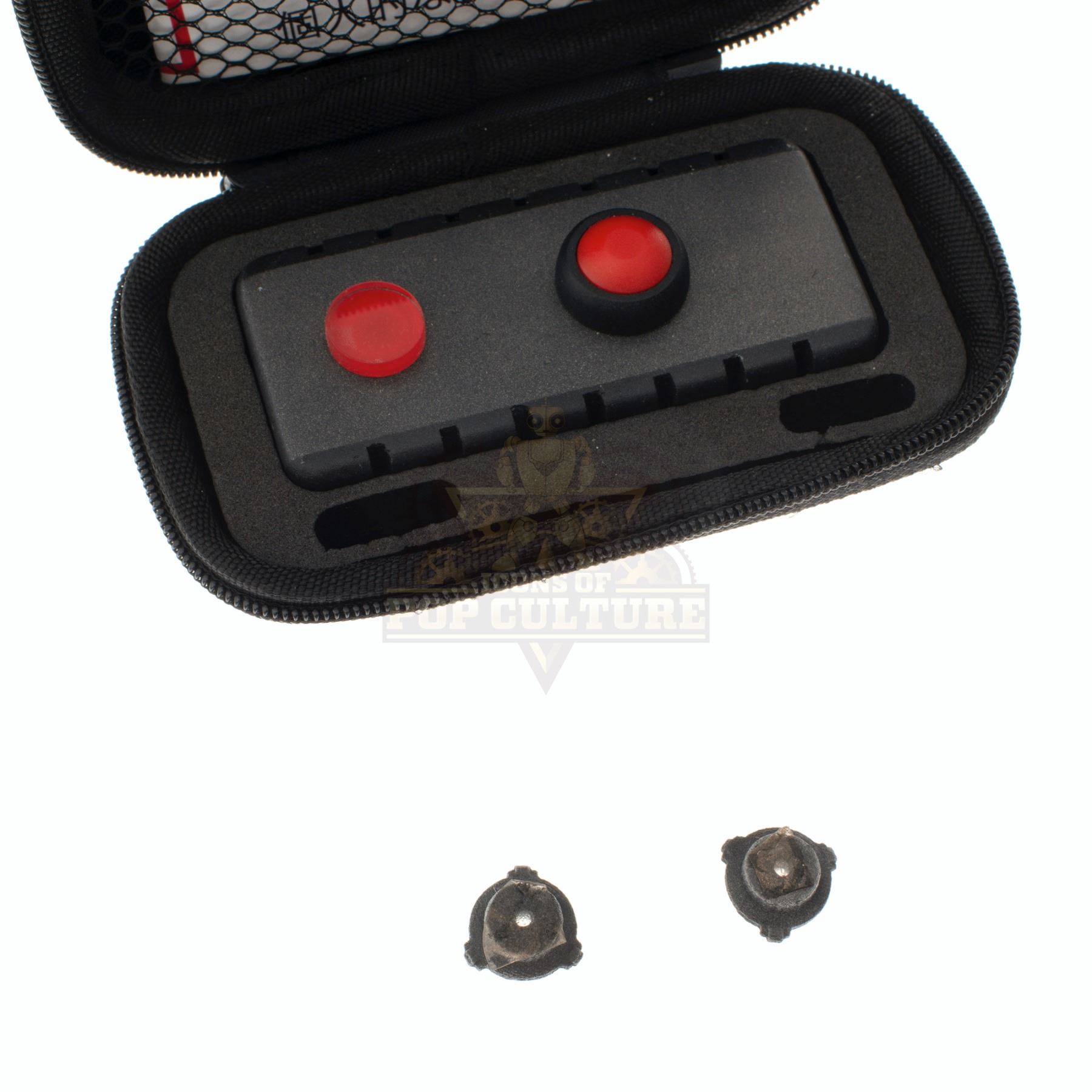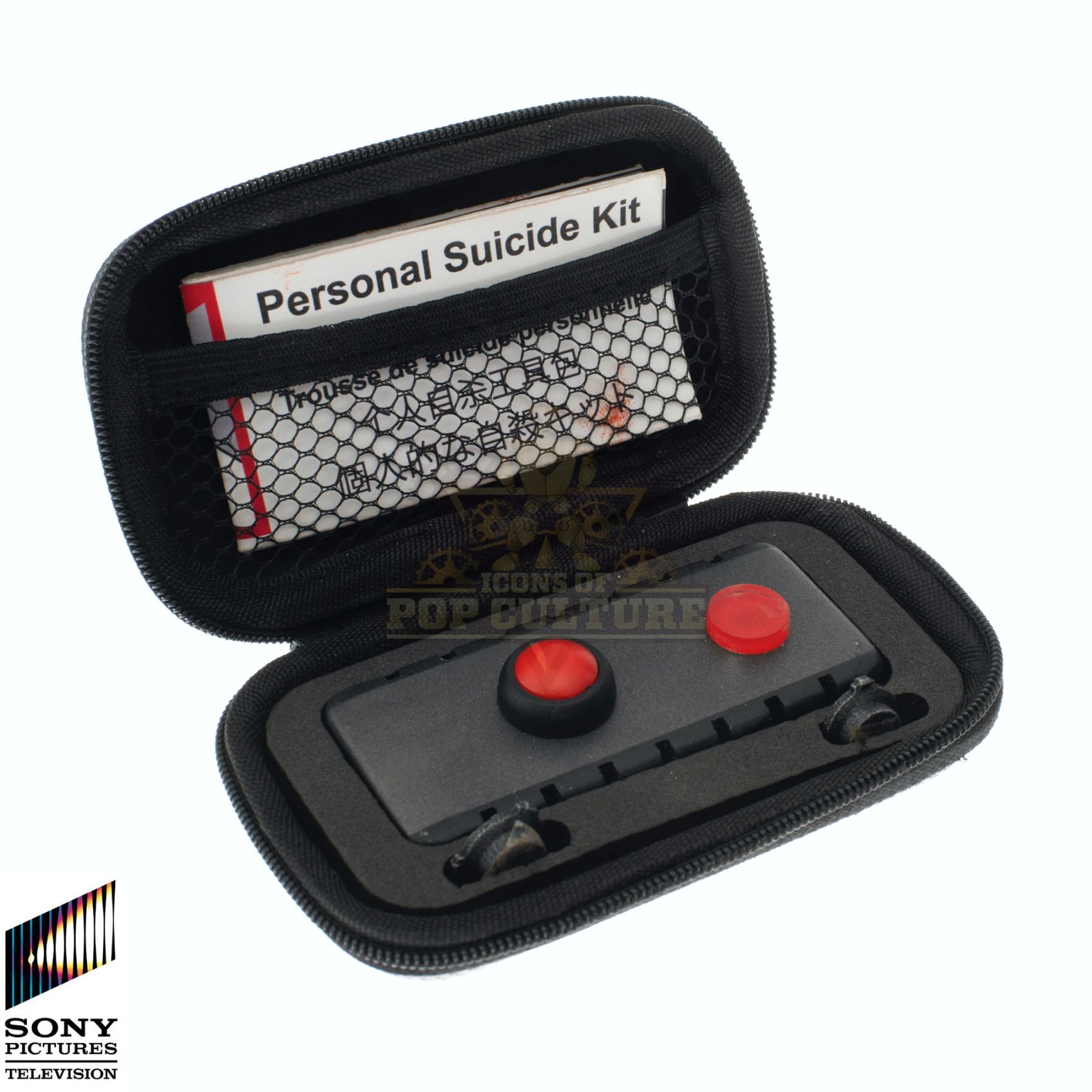 This prop PSK (Personal Suicide Kit) was custom-made by the production for use by various actors in the season two episode titled “The Brain Job”. The 4.5” x 2.5” x 1.25” case contains two temple dots, trigger and visual instruction guide for use. The temple dots can be used on either temple, because it is a good design.