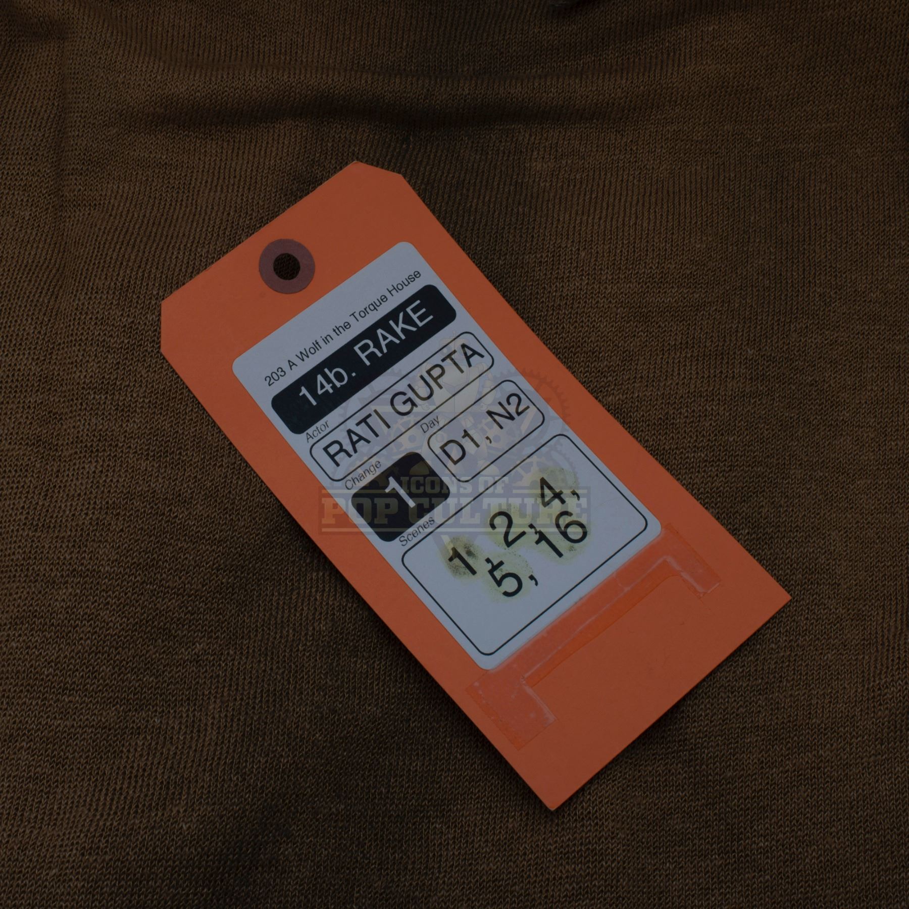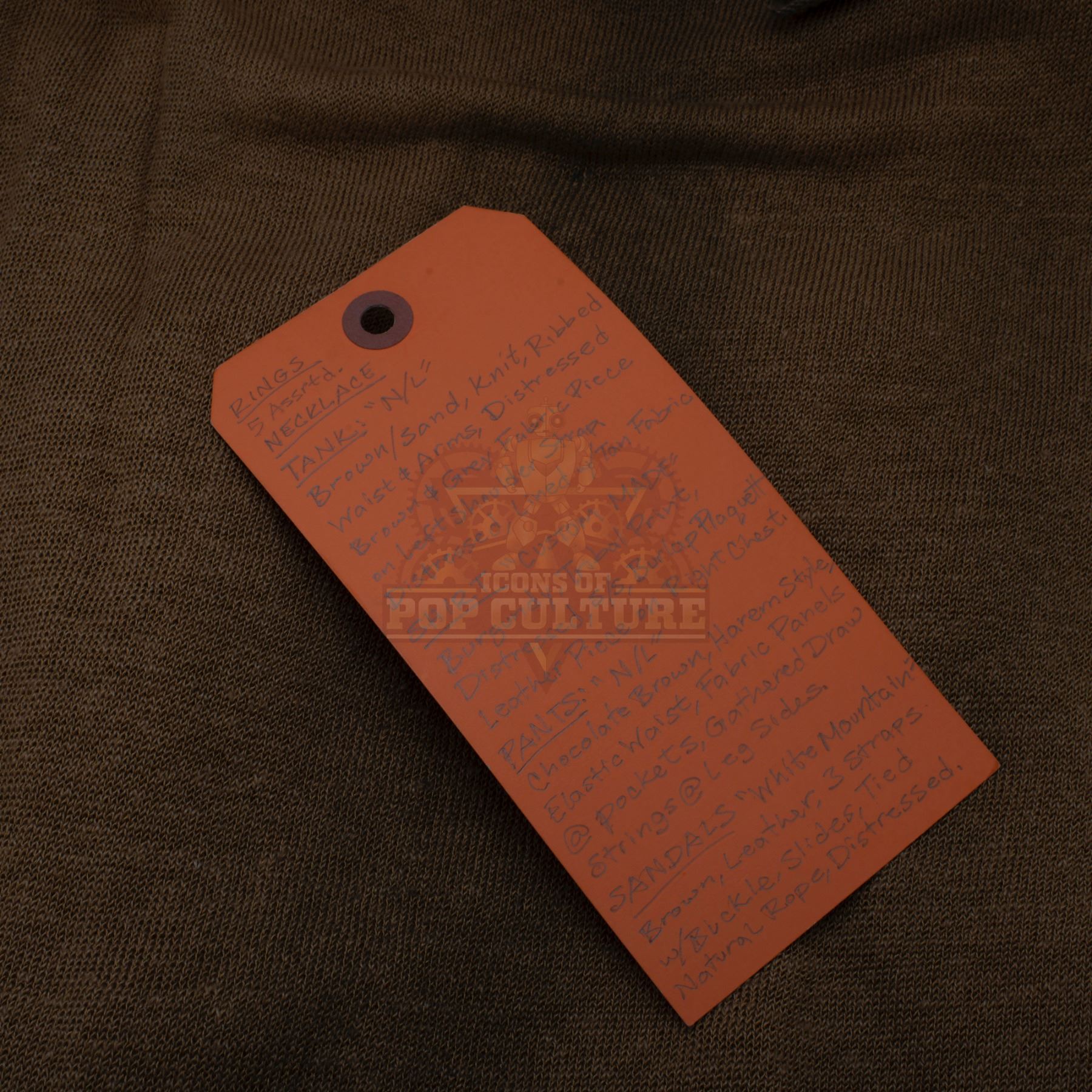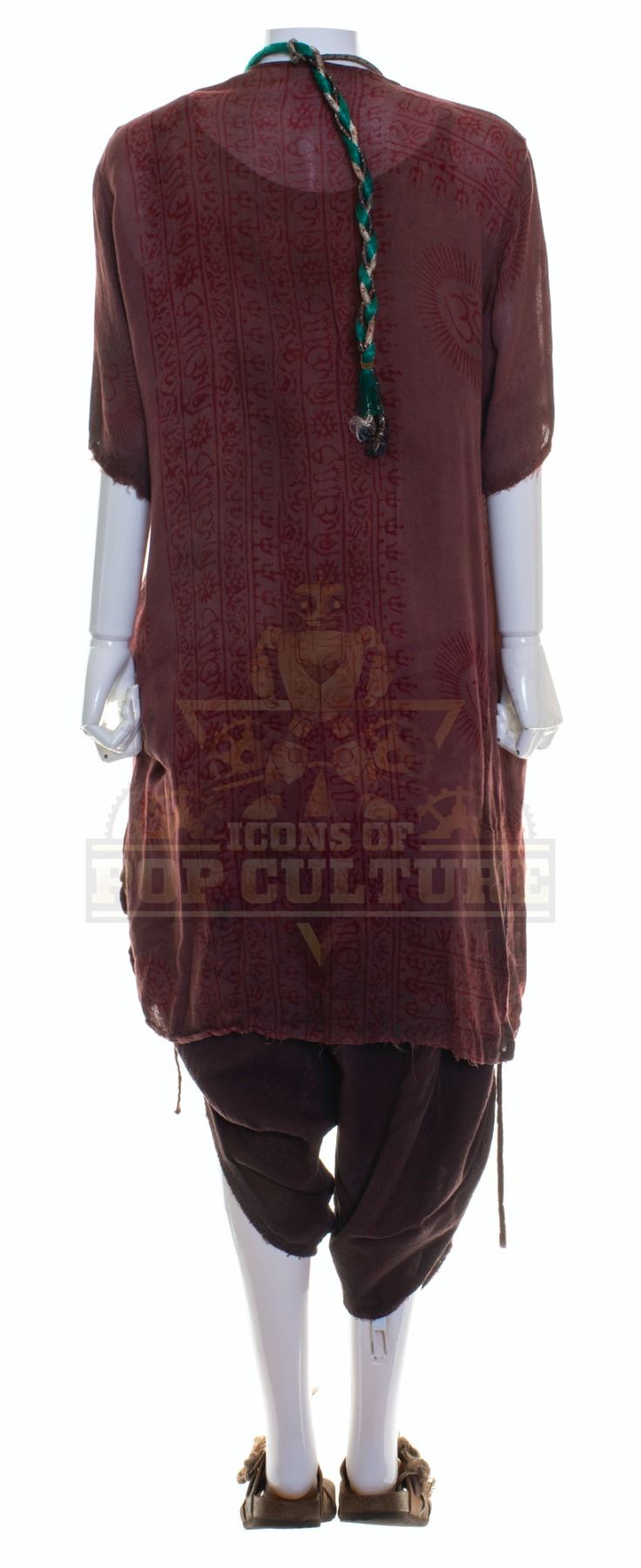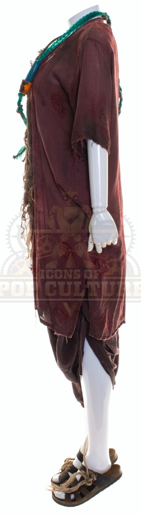 This outfit was acquired and customized by the production for use by Rati Gupta as “Rake” in the season two episode titled “A Wolf in the Torque House”. The outfit is distressed for filming and consists of a sand color tank top, a burgundy tribal print shirt, a pair of brown pants, a pair of sandals and a custom-made necklace. Included with the outfit is a production used costume tag that details the entire outfit, change and scene numbers used.