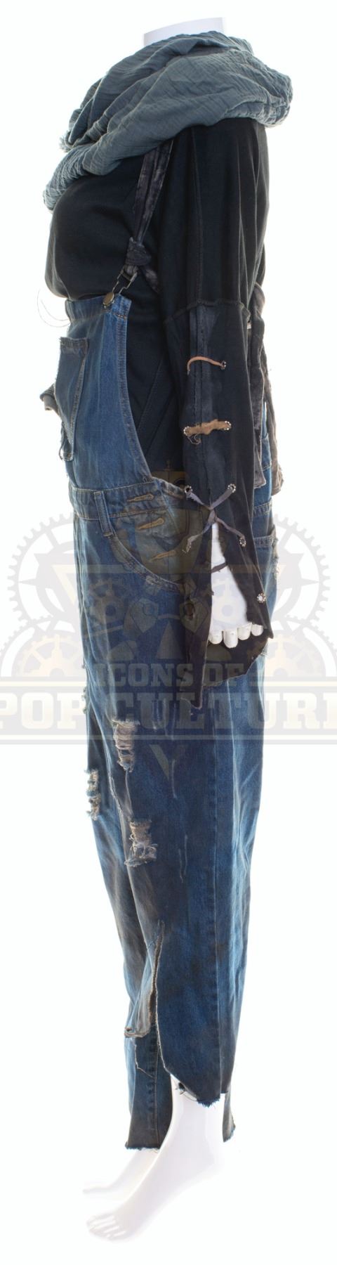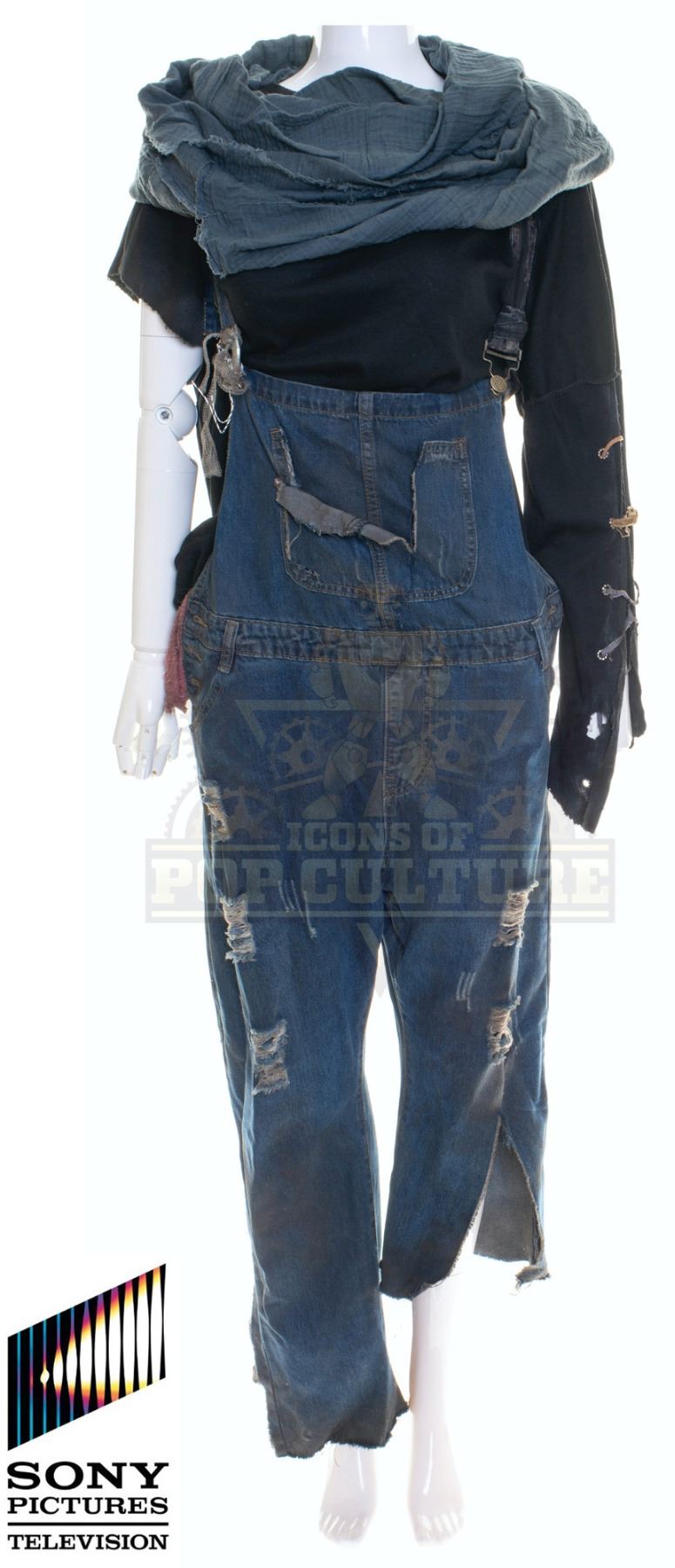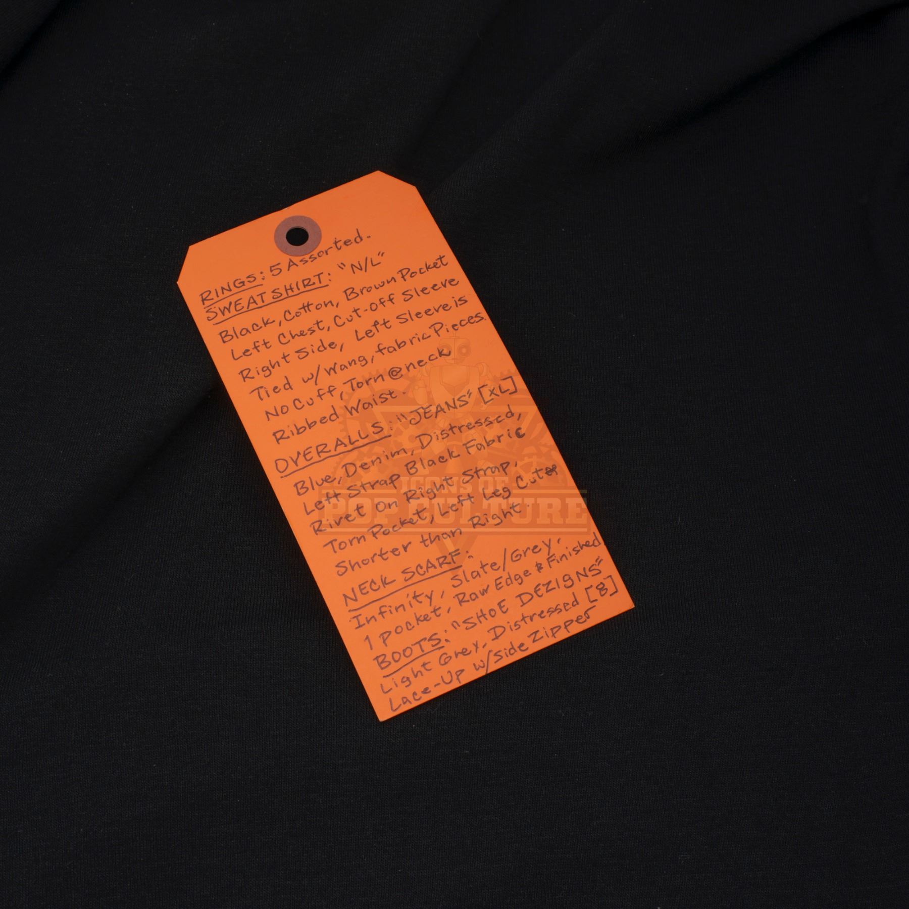 This outfit was acquired and customized by the production for use by Staci Lynn Fletcher as “Rivet” in the season two episode titled “A Wolf in the Torque House”. The outfit is distressed for filming and consists of a black sweatshirt, blue overalls and a neck scarf. Included with the outfit is a production used costume tag that details the entire outfit, change and scene numbers used.