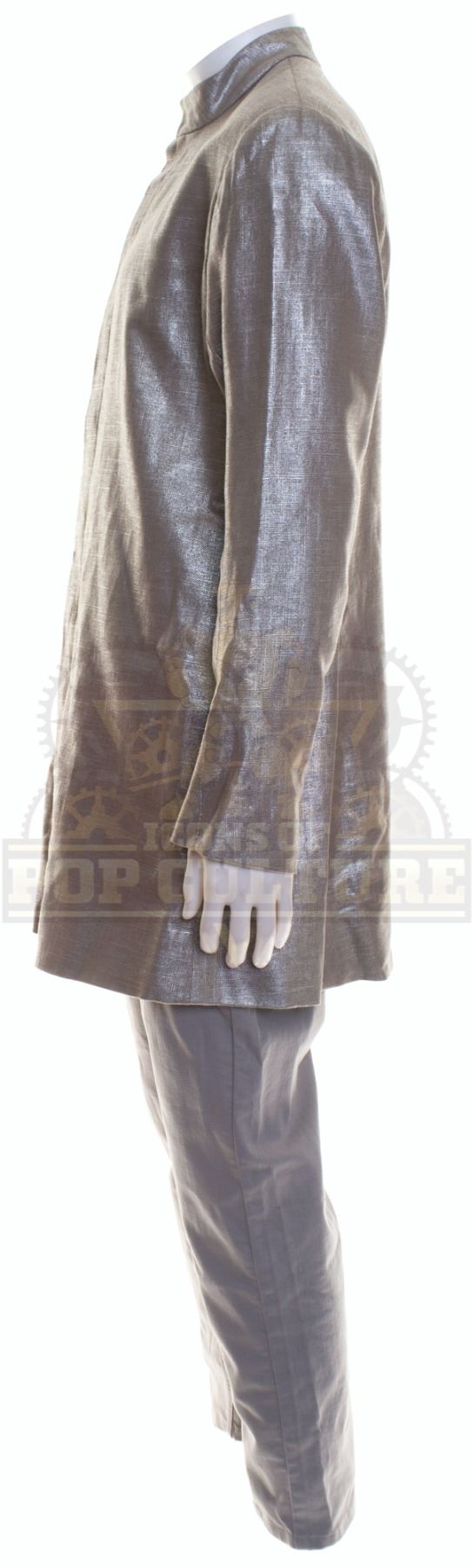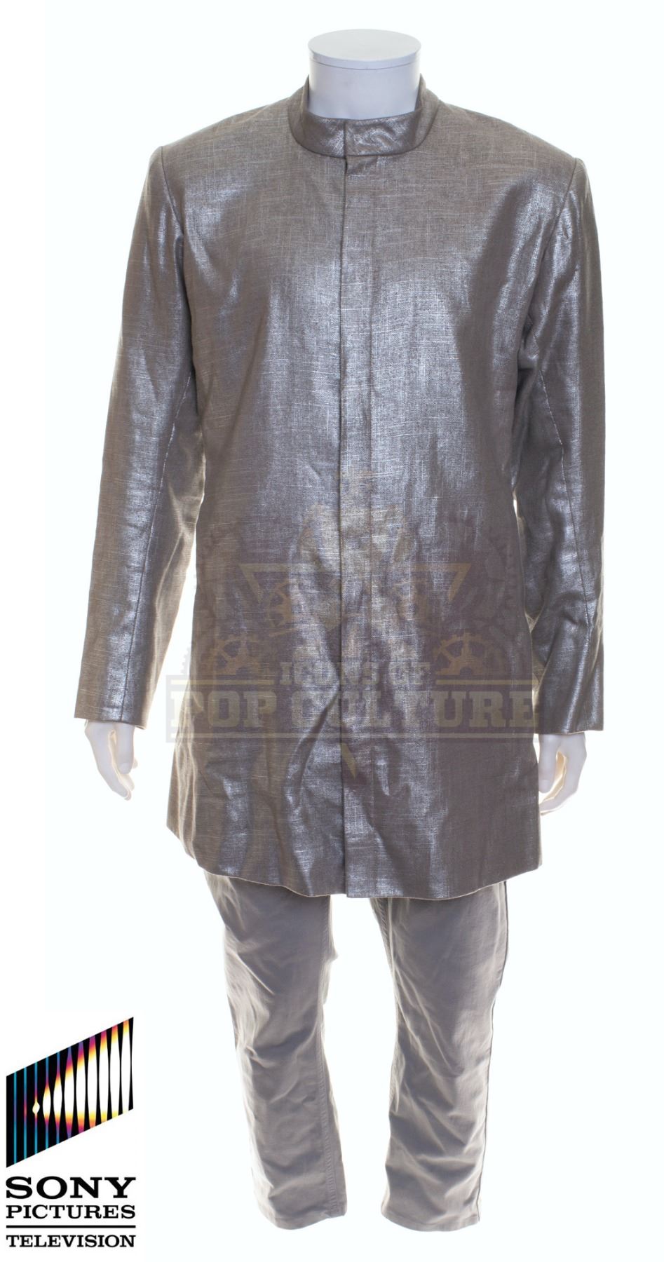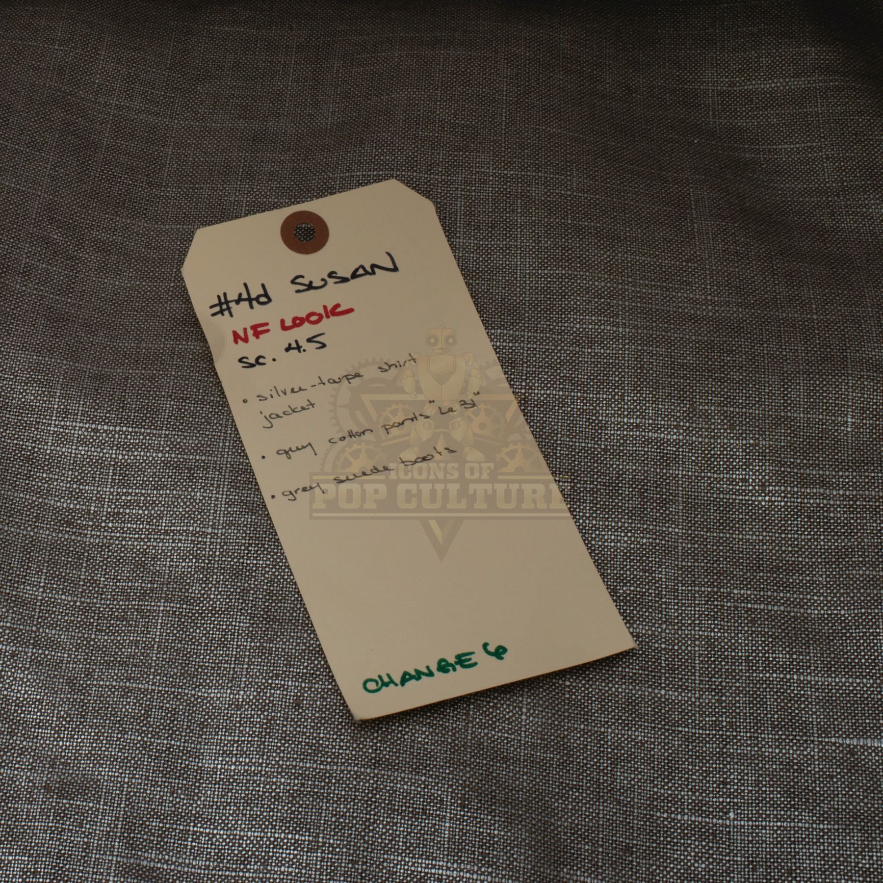 This outfit was acquired by the production for use by Seth Rogen as “Susan” in the season three episode titled “The Outlaw Wild Sam Bladden”. The outfit consists of a silver button front jacket and a pair of grey pants. Included with the outfit is a production used costume tag that details the entire outfit, change and scene numbers used.