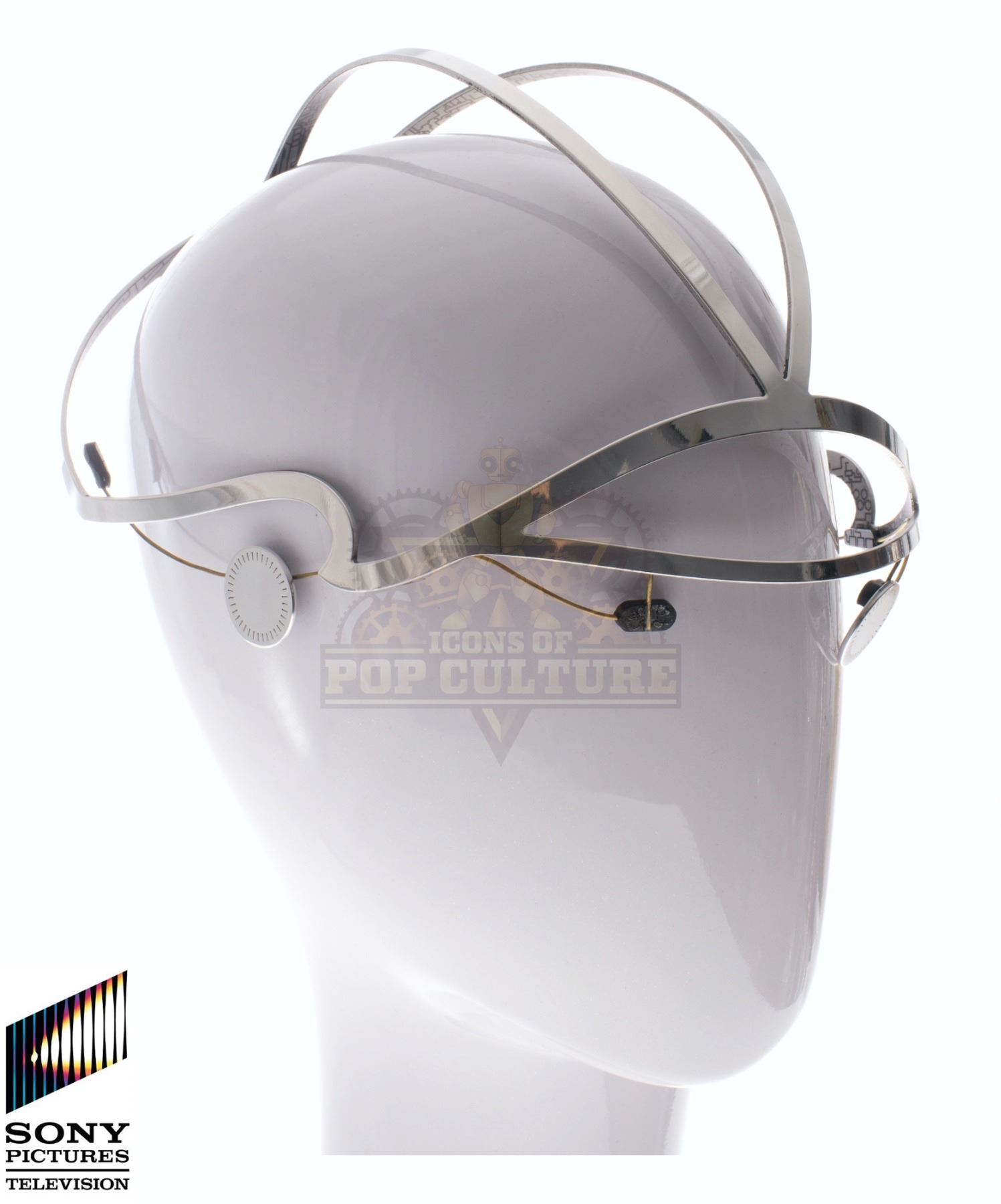 This brain upload simulator (it’s not a hat) was custom-made by the production for use by Eliza Coupe as “Tiger” in the season two episode titled “The Last Horchata”. The device is made of a metal contoured skull cap with attached metal discs (one disc is missing). The device allowed Tiger to enter Stu’s digital realm. Measures 8” x 7” x 5”.