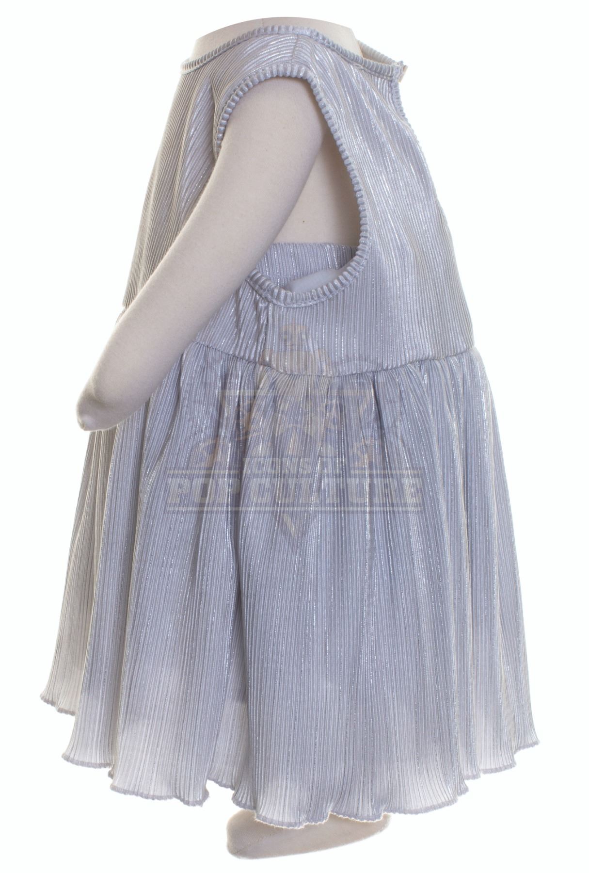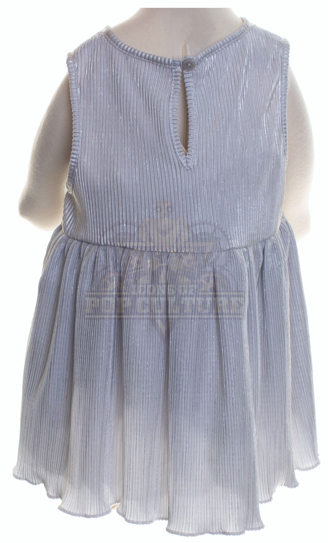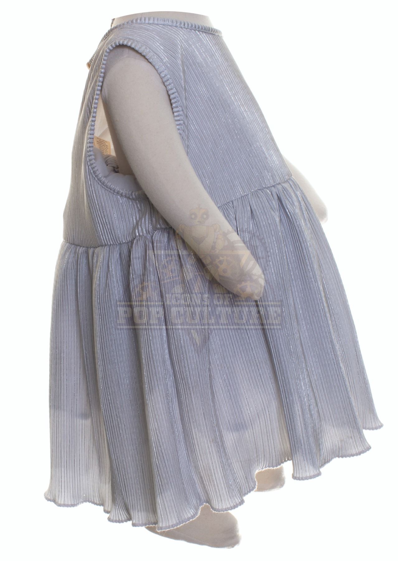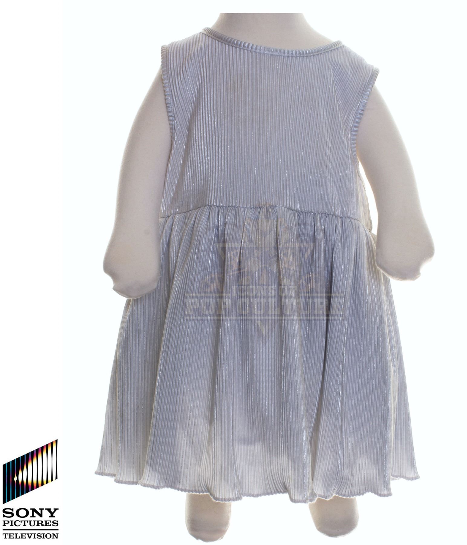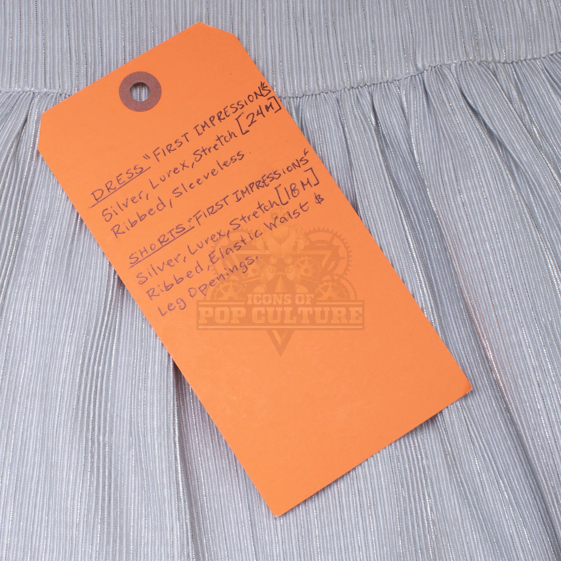This outfit was acquired by the production for use by an uncredited actress as “Toddler Ty-Anne” in the season two episode titled “Exes and OS”. The outfit consists of a silver sleeveless dress and a pair of matching shorts. Included with the outfit is a production used costume tag that details the entire outfit, change and scene numbers used.