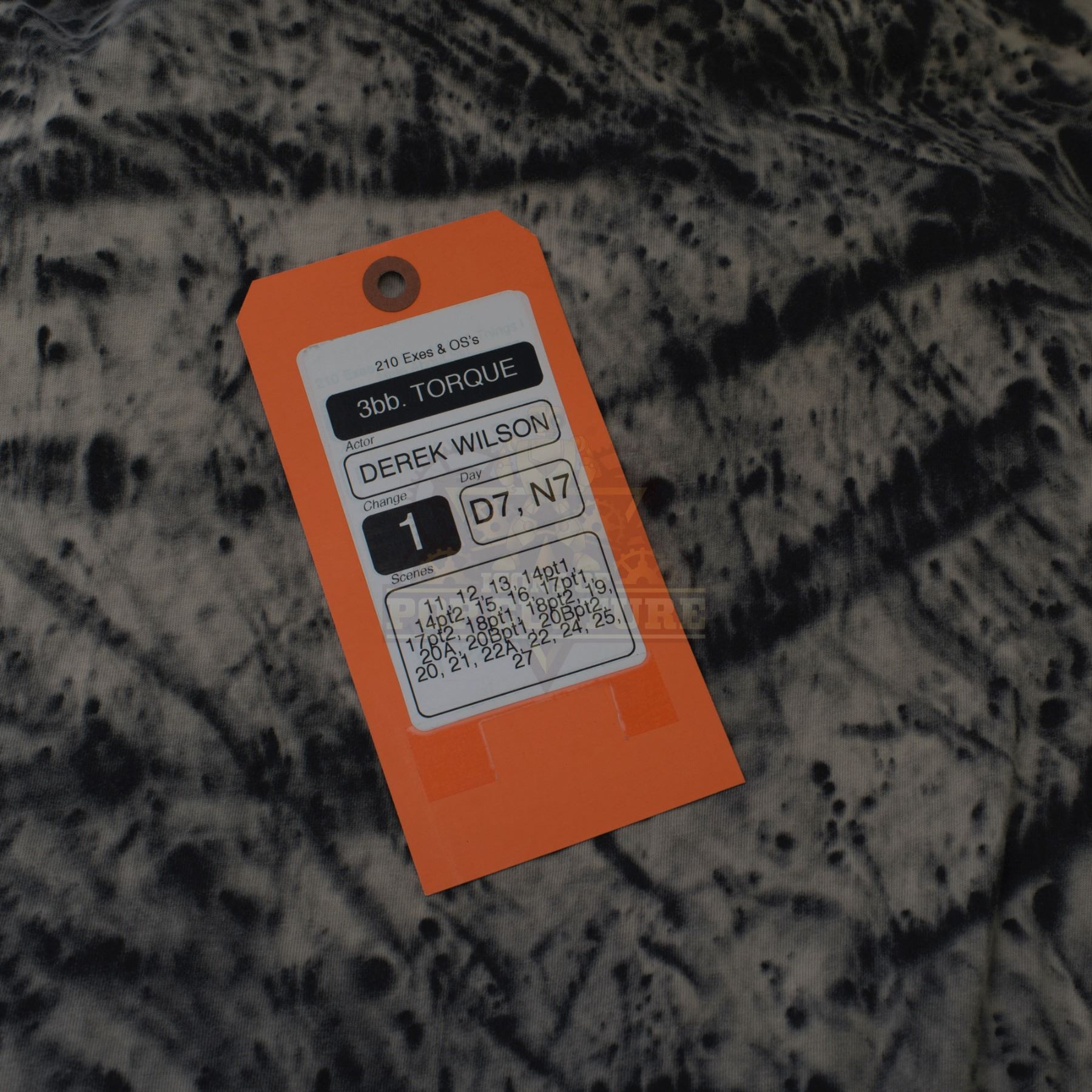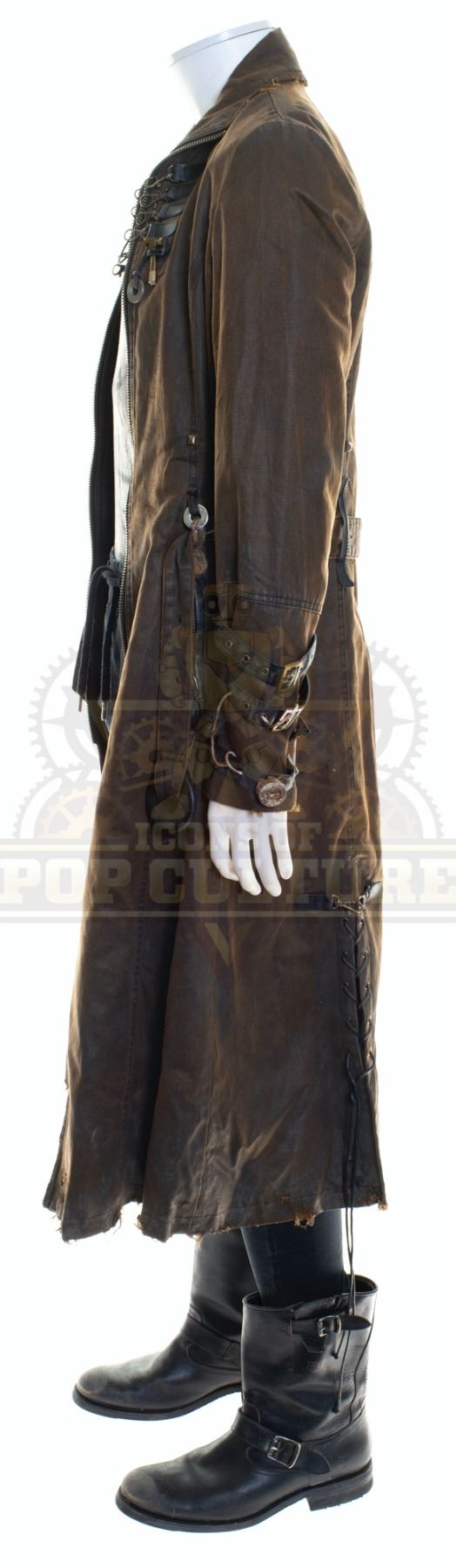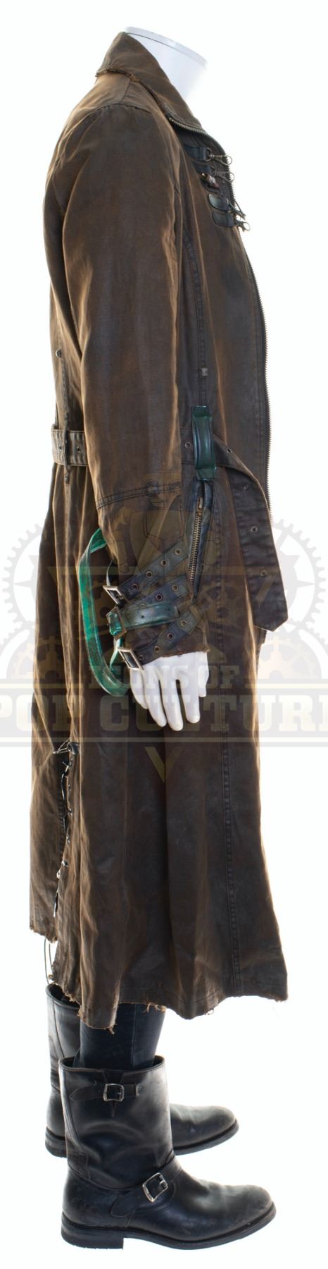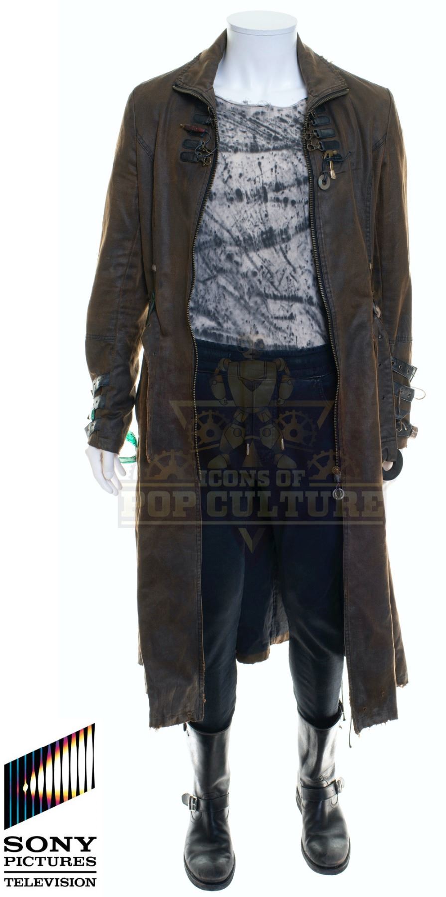 This outfit was acquired by the production for use by Derek Wilson as “Torque” in the season two episode titled “Exes and OS”. The outfit consists of a brown trench coat with various attached components, a Tie-Dye t-shirt, a pair of black pants and a pair of black boots. Included with the outfit is a production used costume tag that details the entire outfit, change and scene numbers used.