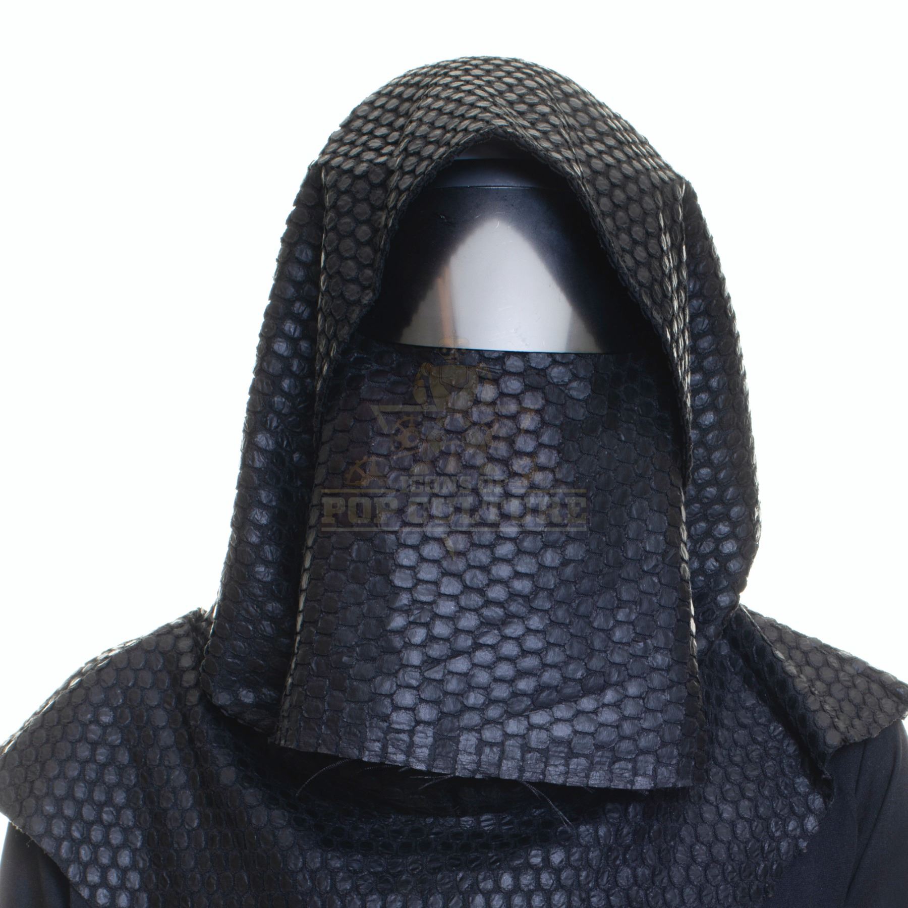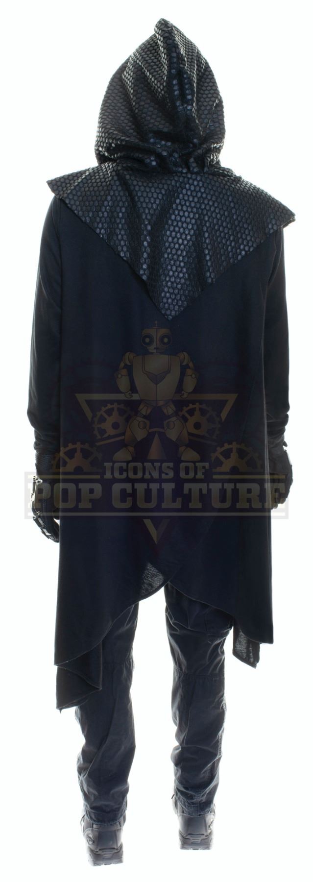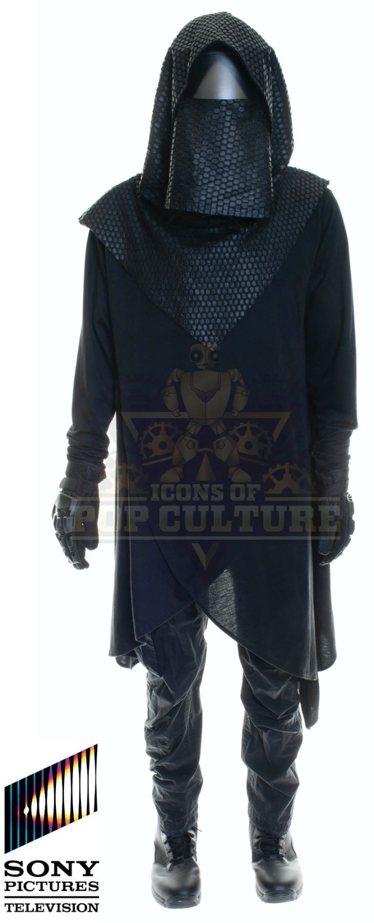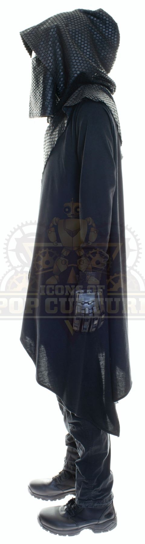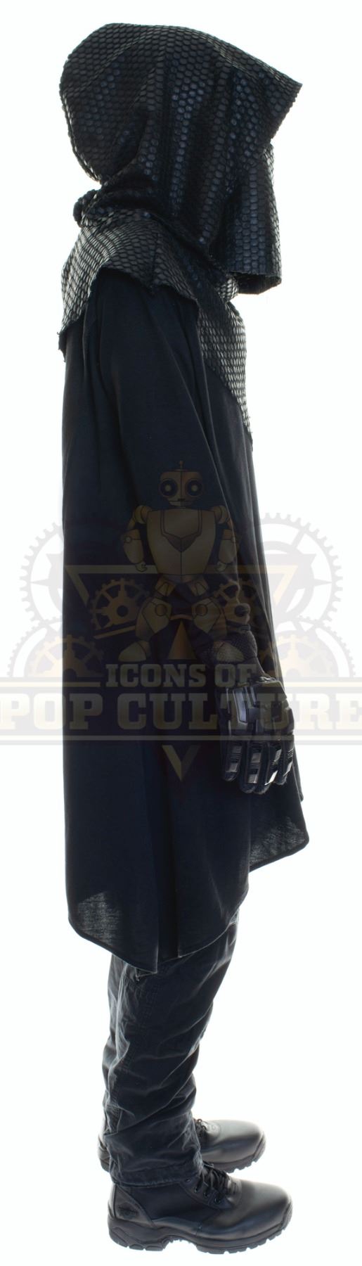 This outfit was acquired by the production for use by an uncredited actor as a “Time Jail Guard” in the season two episode titled “Ultra-Max”. The outfit consists of a black hooded cloak, black t-shirt, a pair of black pants, Plastic visor, a pair of gloves and a pair of black boots.
