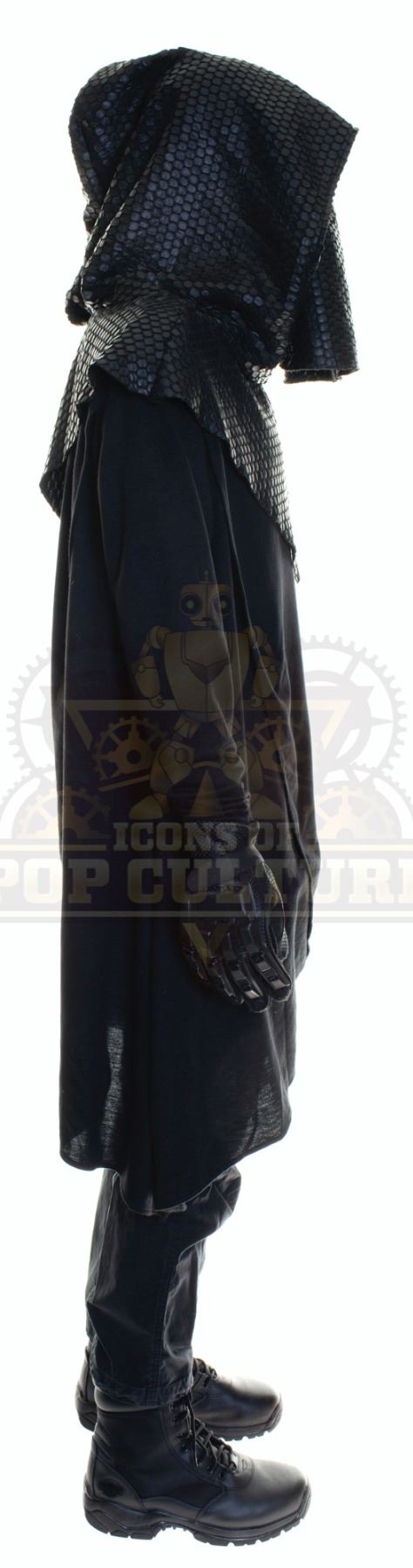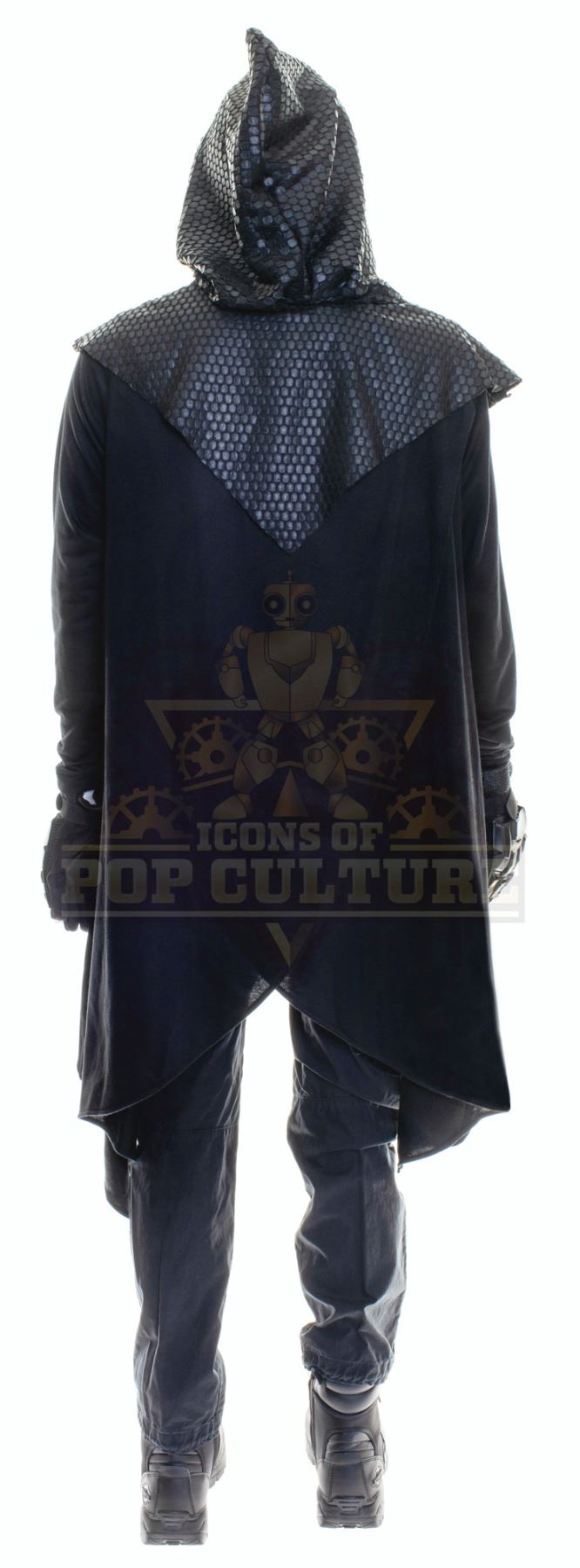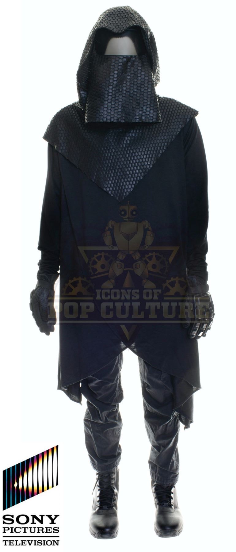 This outfit was acquired by the production for use by an uncredited actor as a “Time Jail Guard” in the season two episode titled “Ultra-Max”. The outfit consists of a black hooded cloak, a pair of black pants, Plastic visor, a pair of gloves and a pair of black boots.