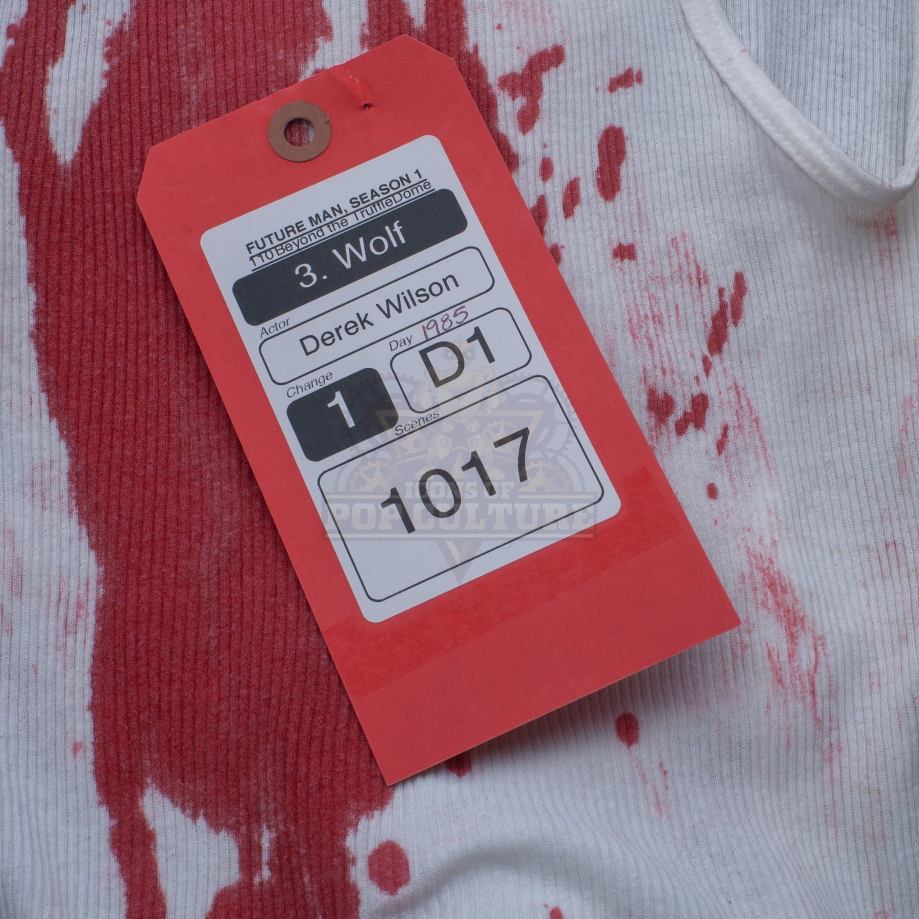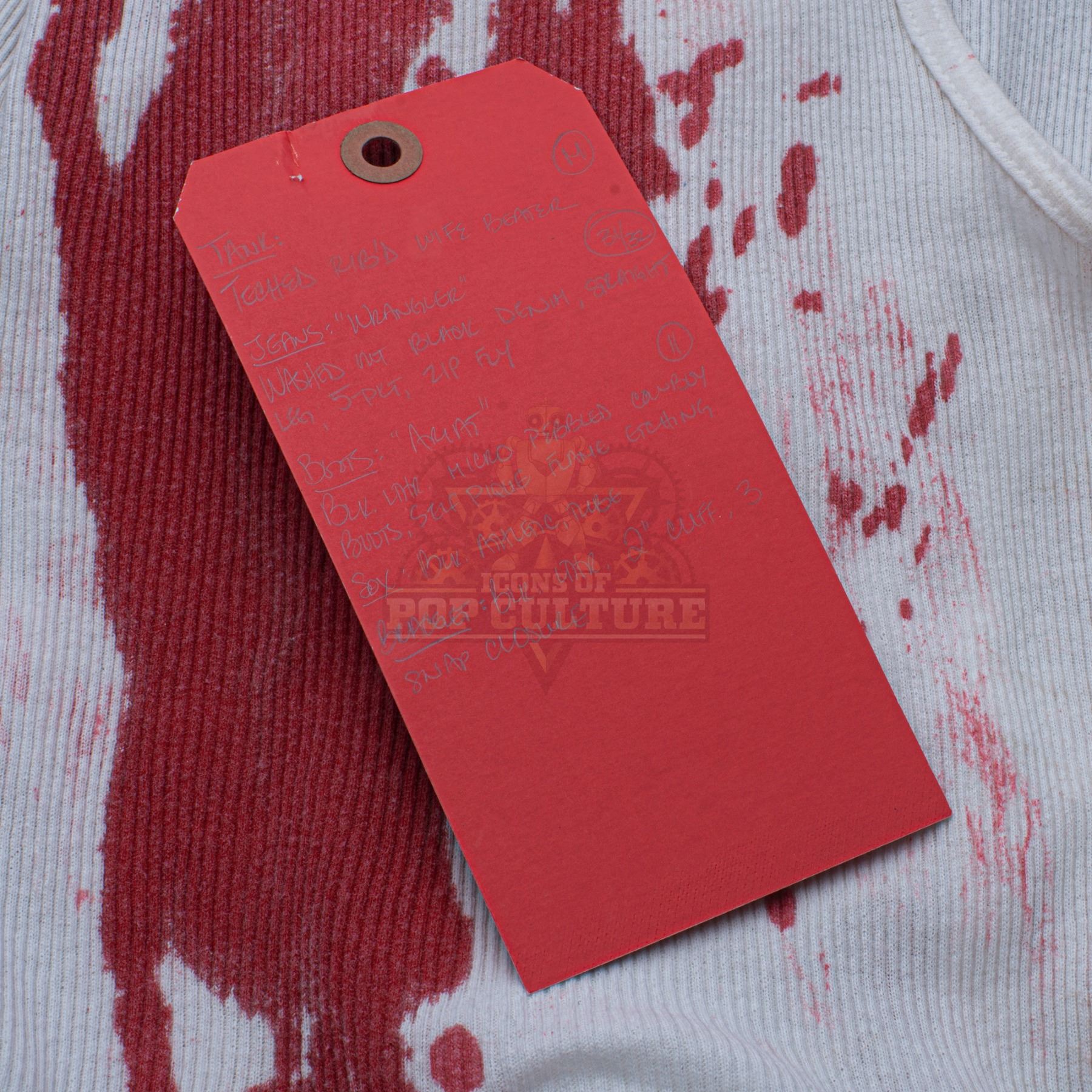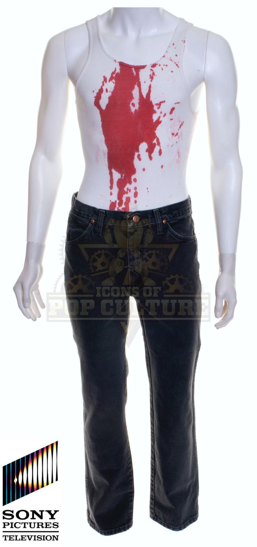 This outfit was acquired by the production for use by Derek Wilson as “Wolf” in the season one episode titled “Beyond the TruffleDome”. The outfit consists of a white studio blood stained tank top and a pair of black denim jeans. Included with the outfit is a production used costume tag that details the entire outfit, change and scene numbers used.