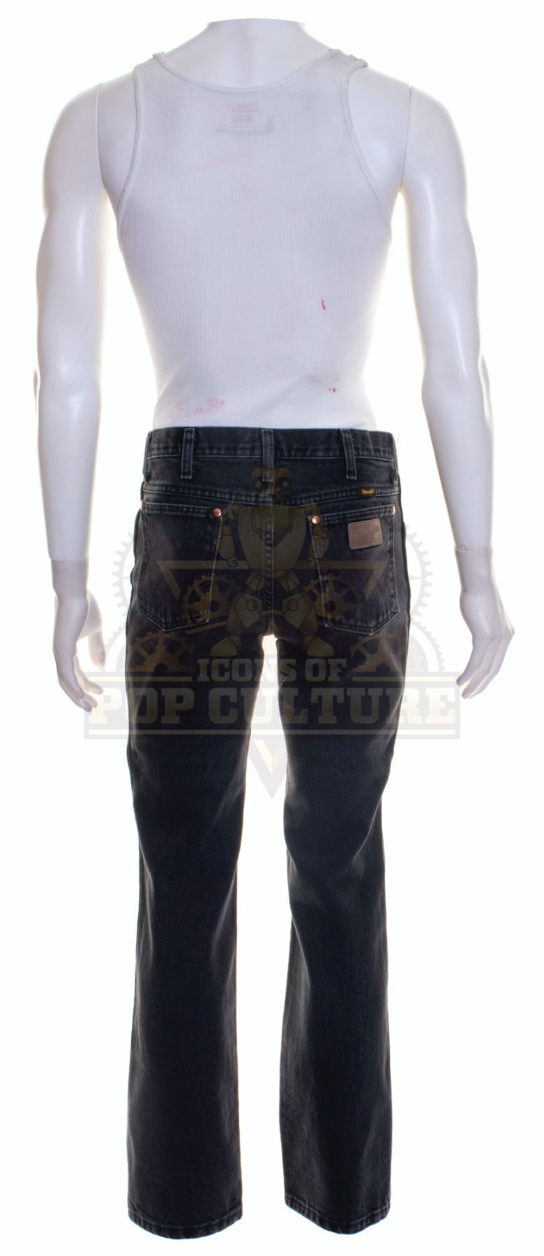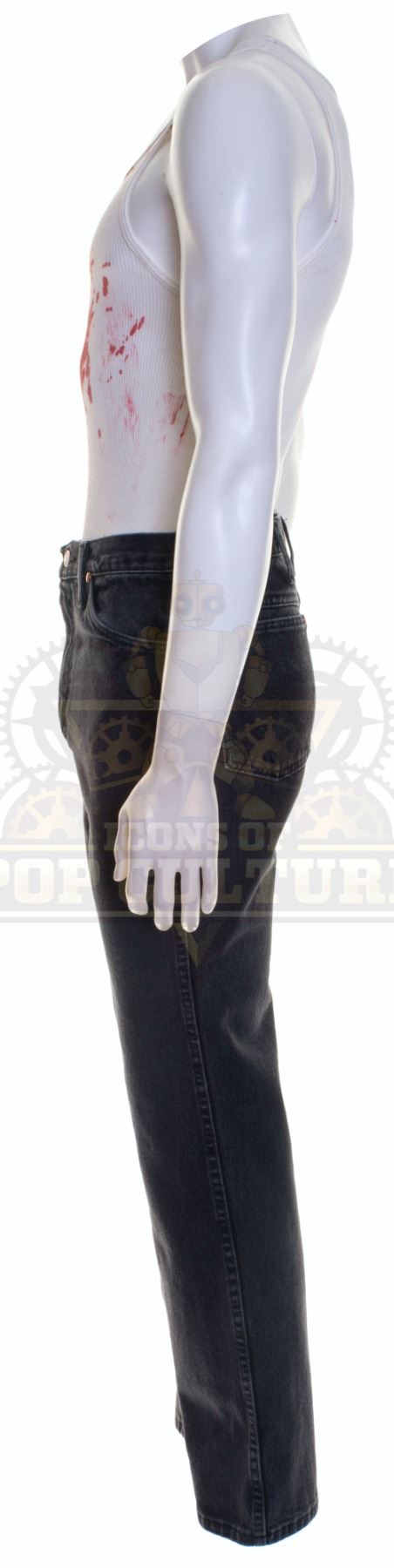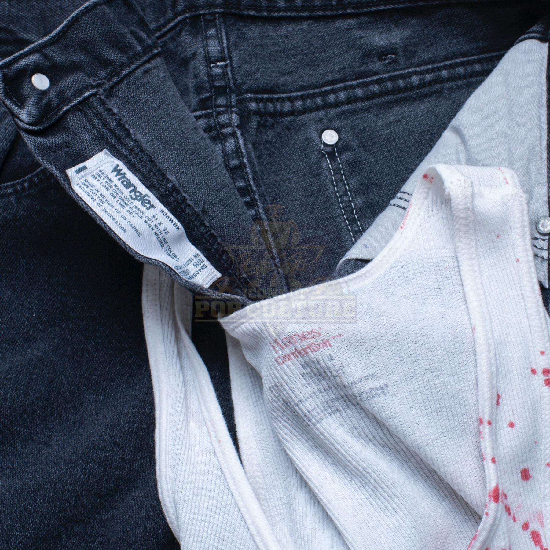 This outfit was acquired by the production for use by Derek Wilson as “Wolf” in the season one episode titled “Beyond the TruffleDome”. The outfit consists of a white studio blood stained tank top and a pair of black denim jeans. Included with the outfit is a production used costume tag that details the entire outfit, change and scene numbers used.