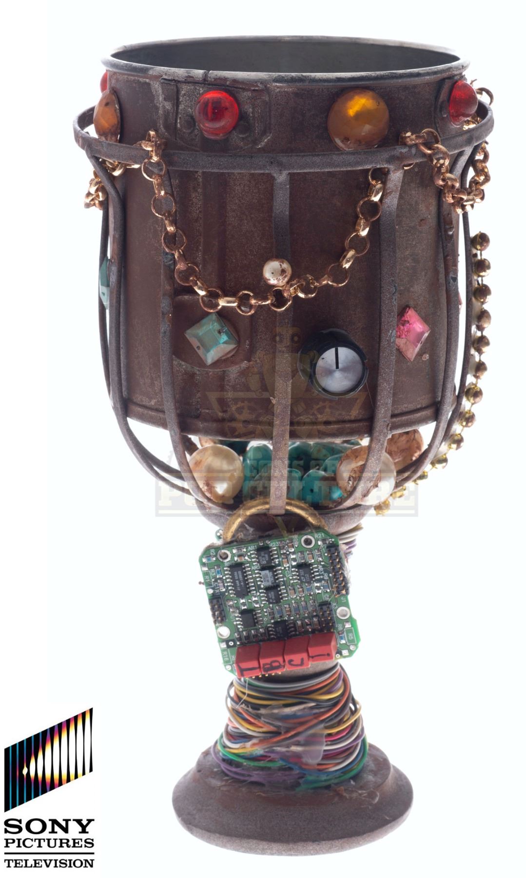 This chalice was custom-made by the production for use by Derek Wilson as “Wolf” in the season two episode titled “Homicide: Life in the Mons”. The chalice is constructed of metal, wood and plastic with applied plastic jewels, circuit board and wire. Chalice measures 9.5” tall x 5” in diameter.