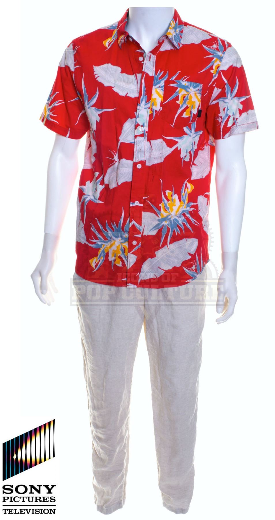 This outfit was acquired by the production for use by Derek Wilson as “Wolf” in the season three episode titled “Return of the Present”. The outfit is distressed with studio blood staining on the shirt and consists of a red Hawaiian shirt and a pair of linen pants.