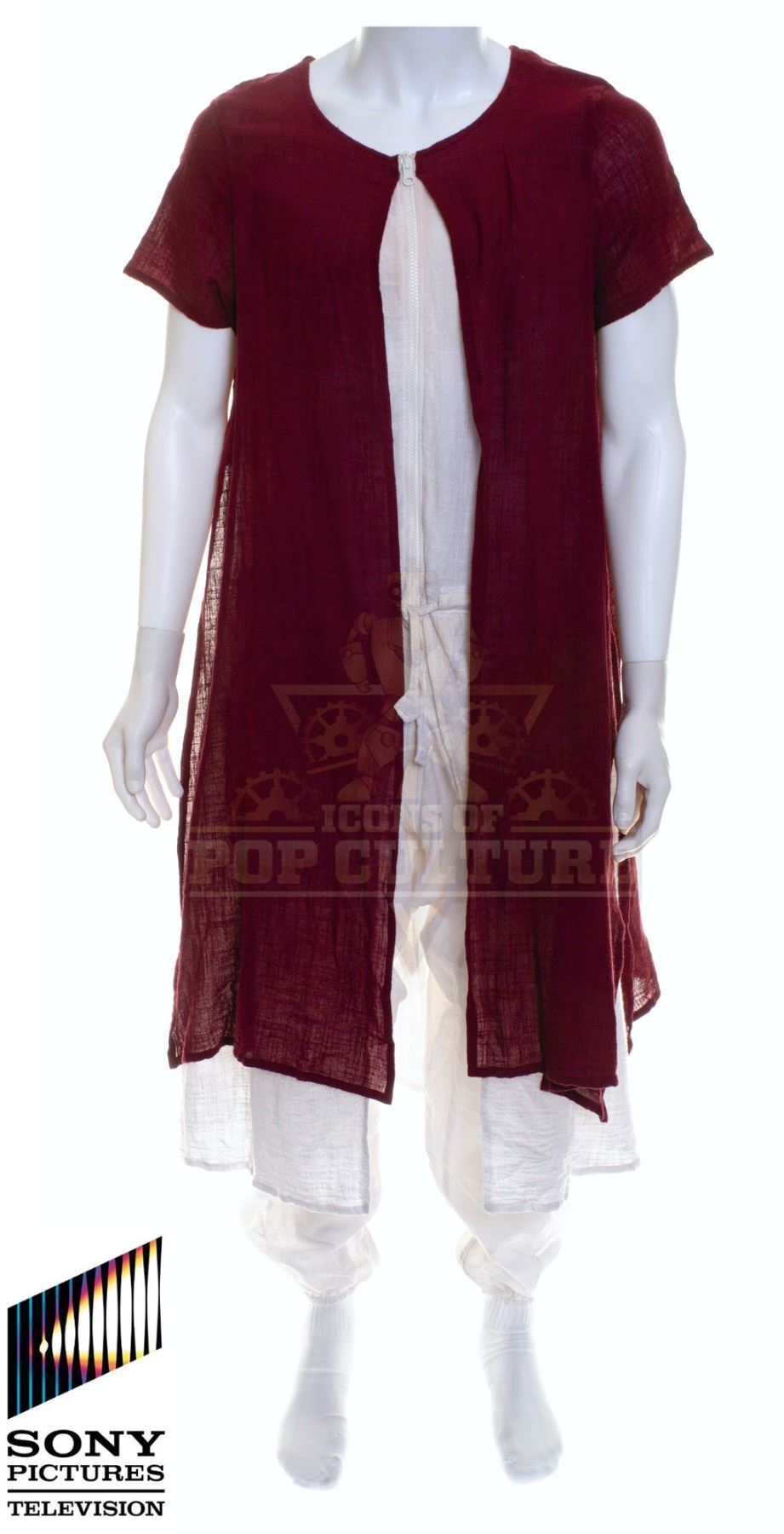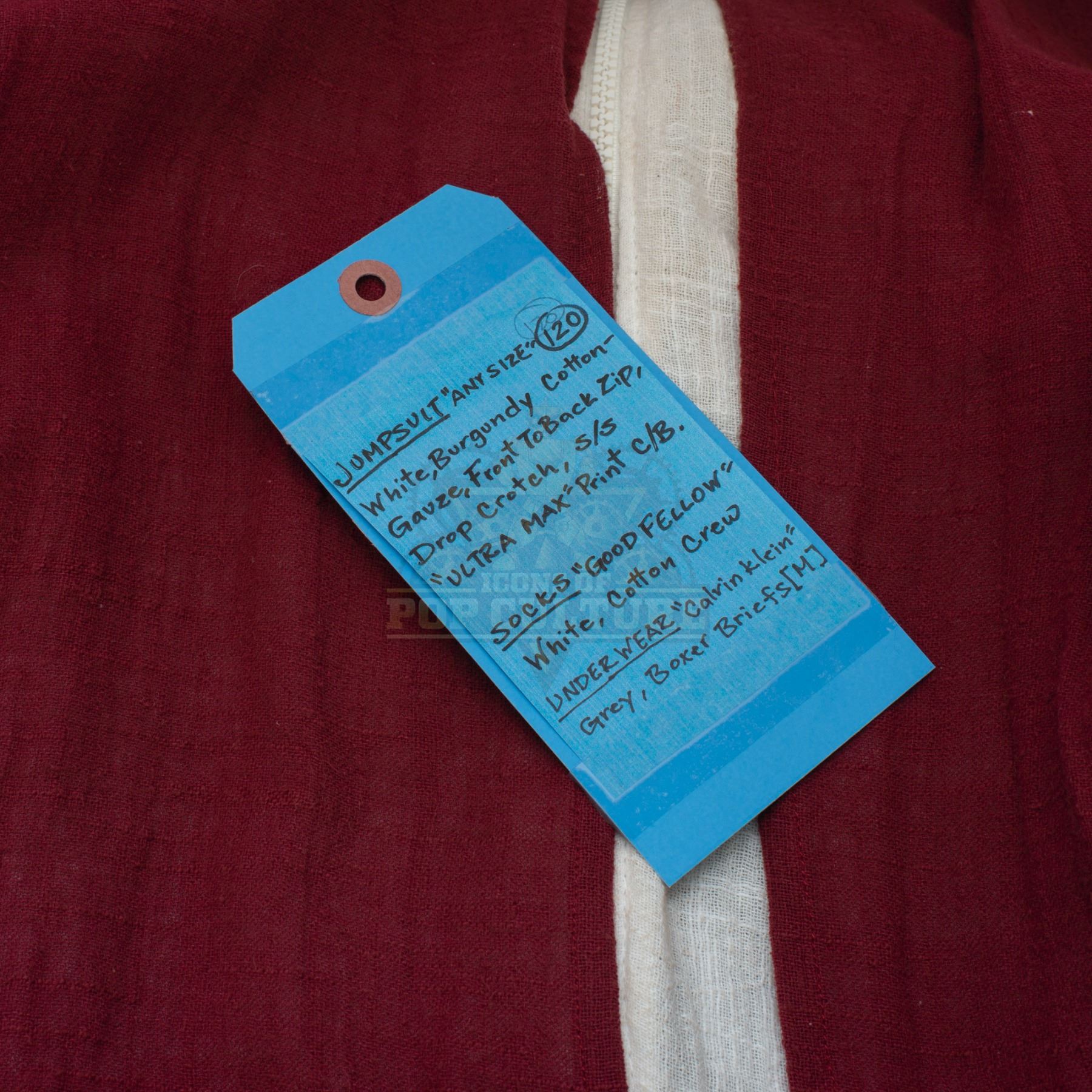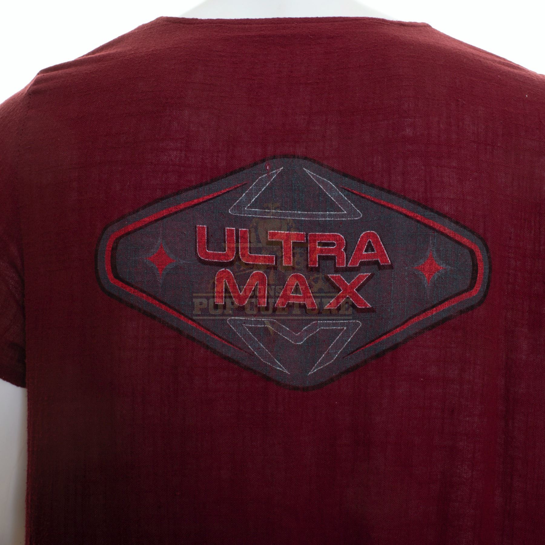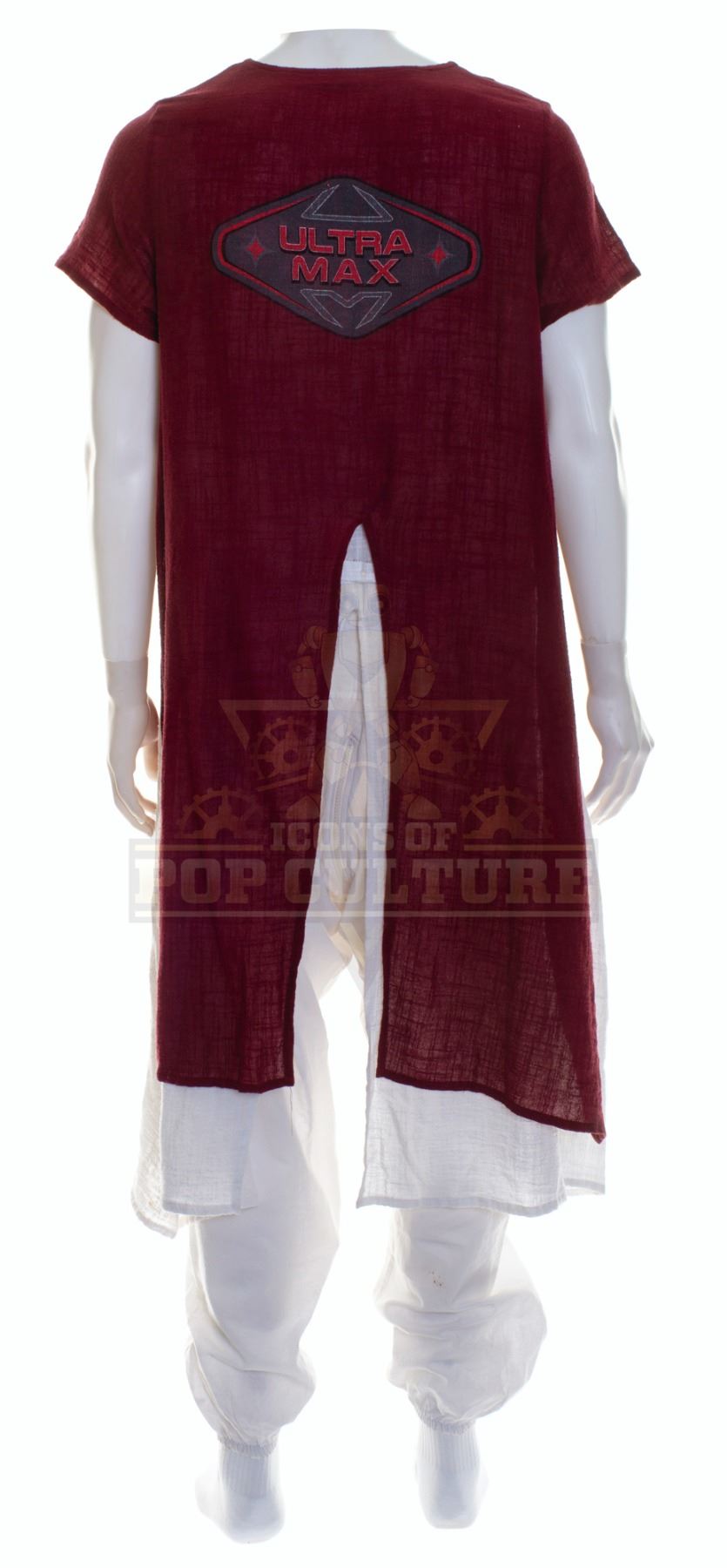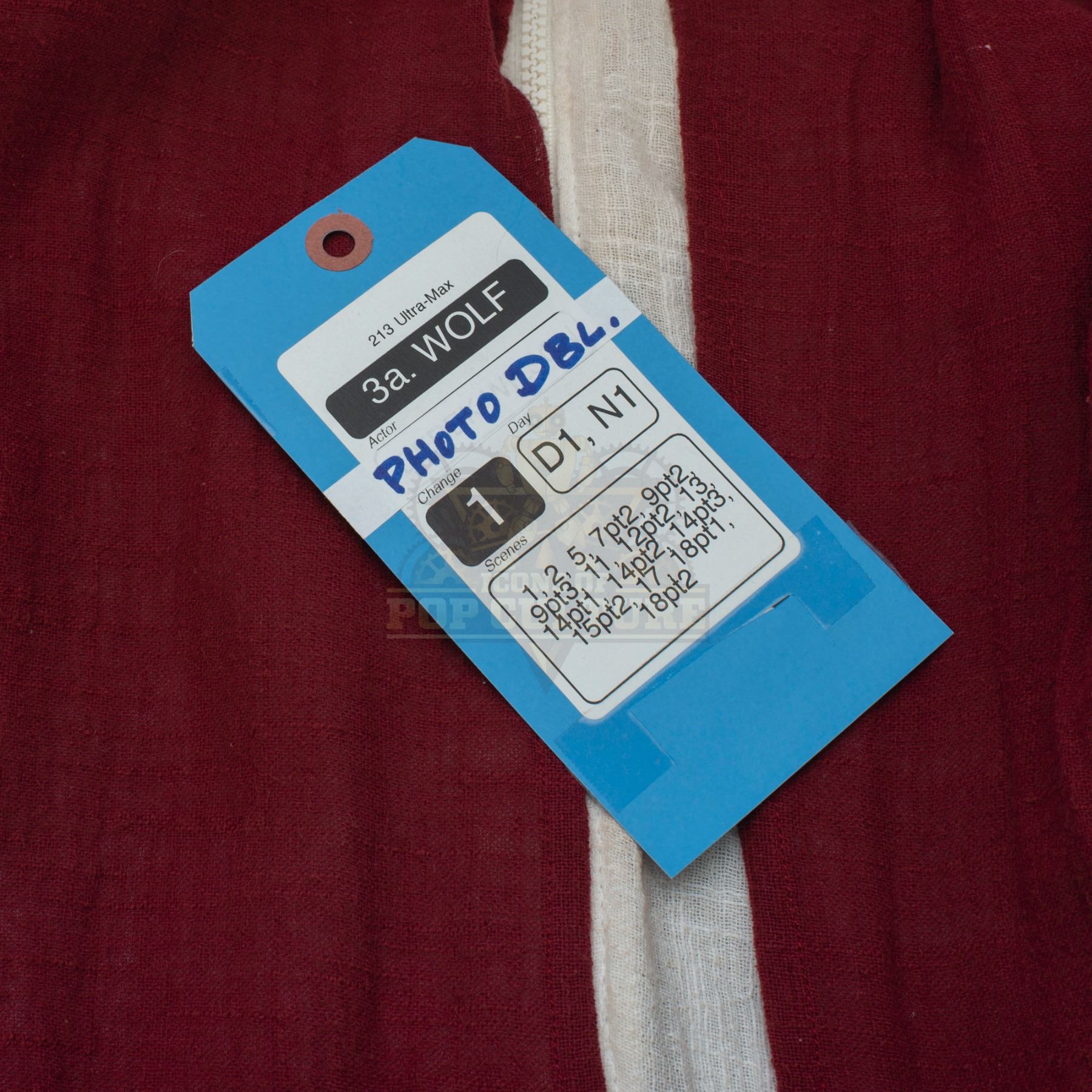 This outfit was acquired and customized by the production for use by Derek Wilson’s photo double as “Wolf” in the season two episode titled “Ultra-Max”. The outfit consists of a white jumpsuit with attached burgundy smork that features the “Ultra Max” logo on the back and a pair of white socks. Included with the outfit is a production used costume tag that details the entire outfit, change and scene numbers used.