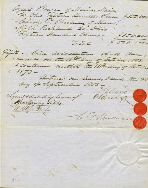 COLUMBUS DELANO. DS. 3pp. 8" x 10". n.p. September 28th 1853. A document signed by Columbus Delano regarding banking regulations. It is in fine condition and the red wax seals are completely intact.